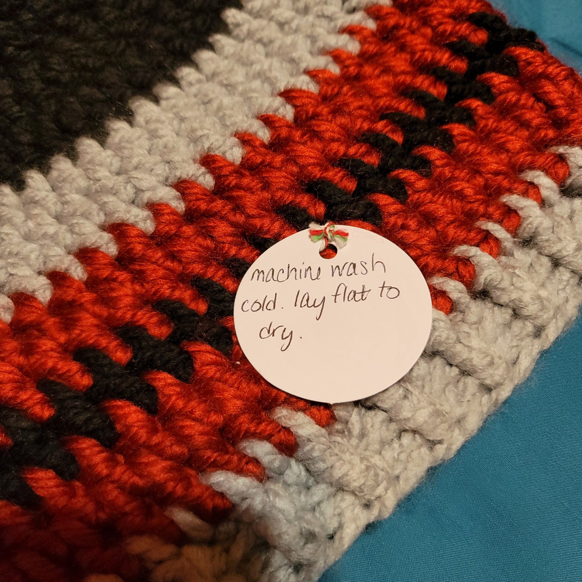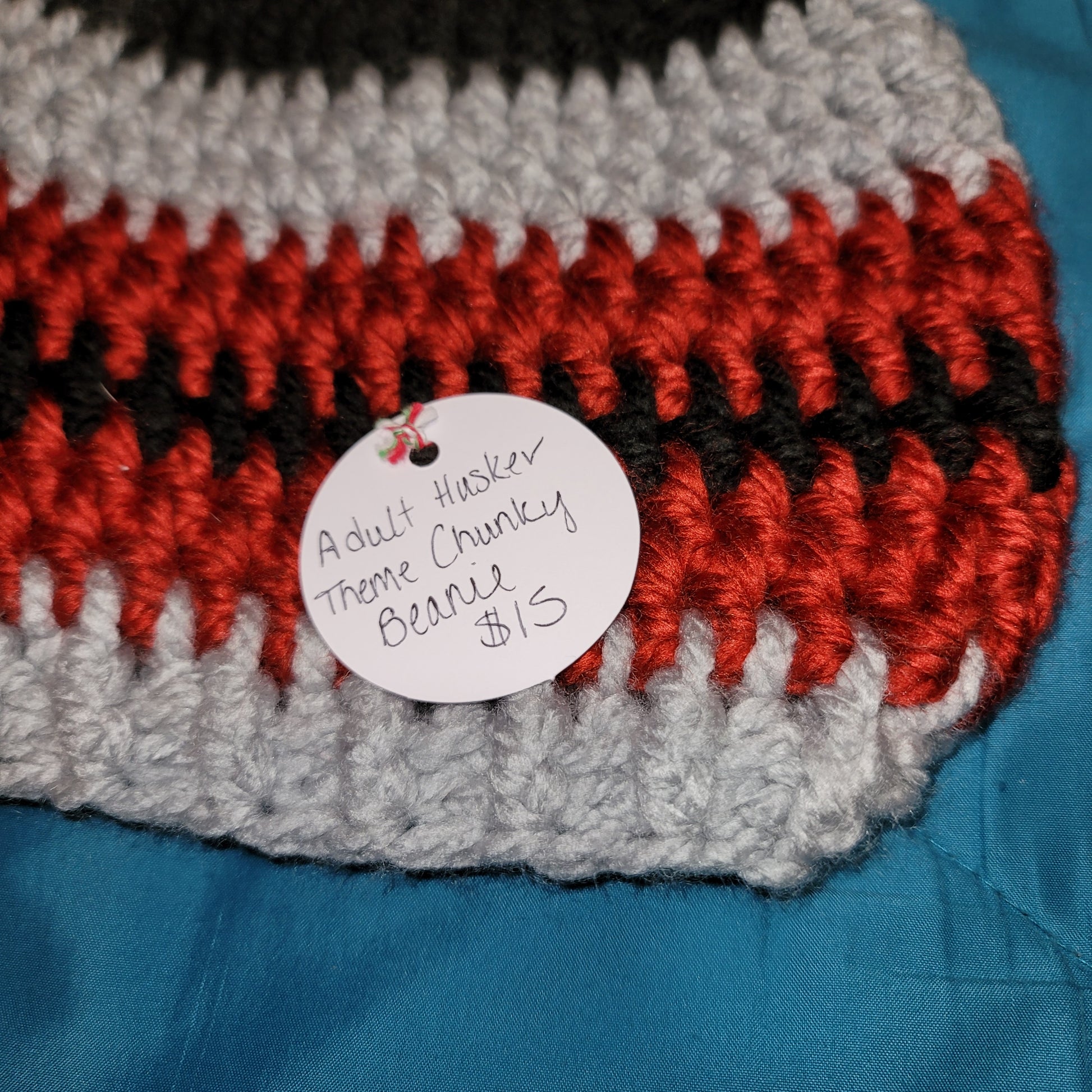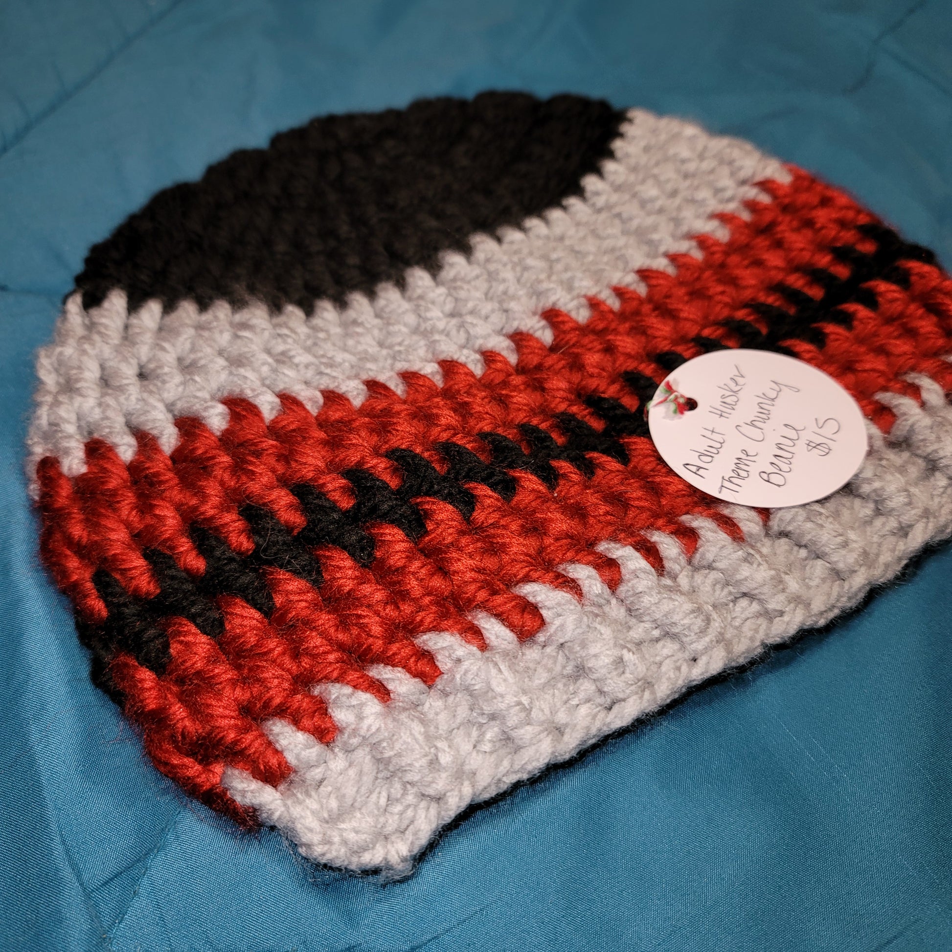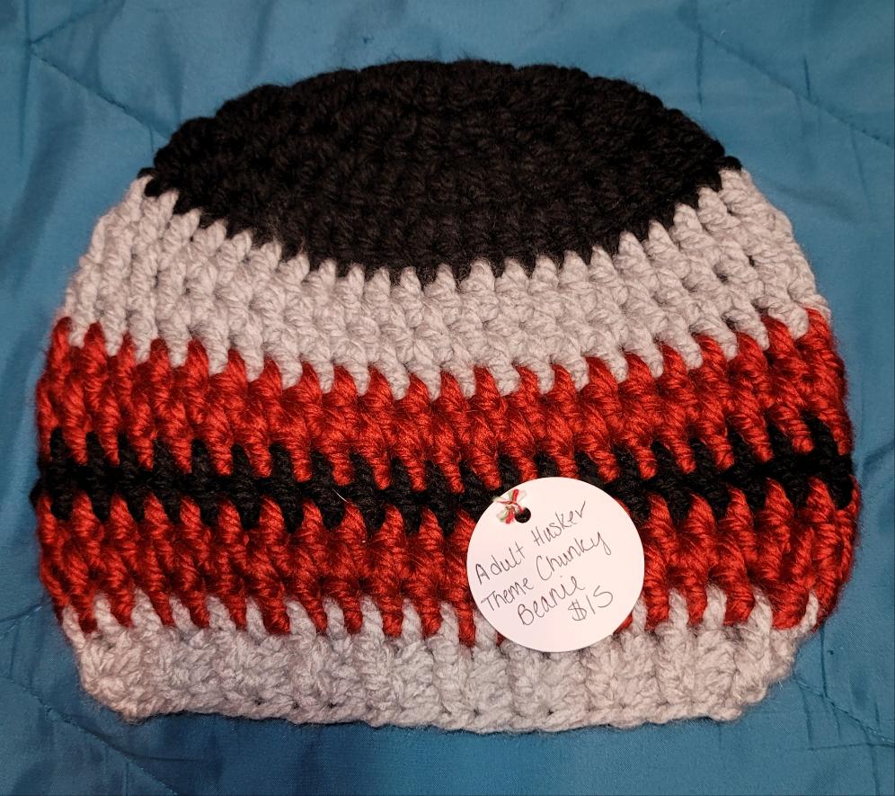 Super fun chunky beanie. Hat measures 8.5 inches tall and has a 19 inch circumference at the brim. 1 inch ease for stretch.