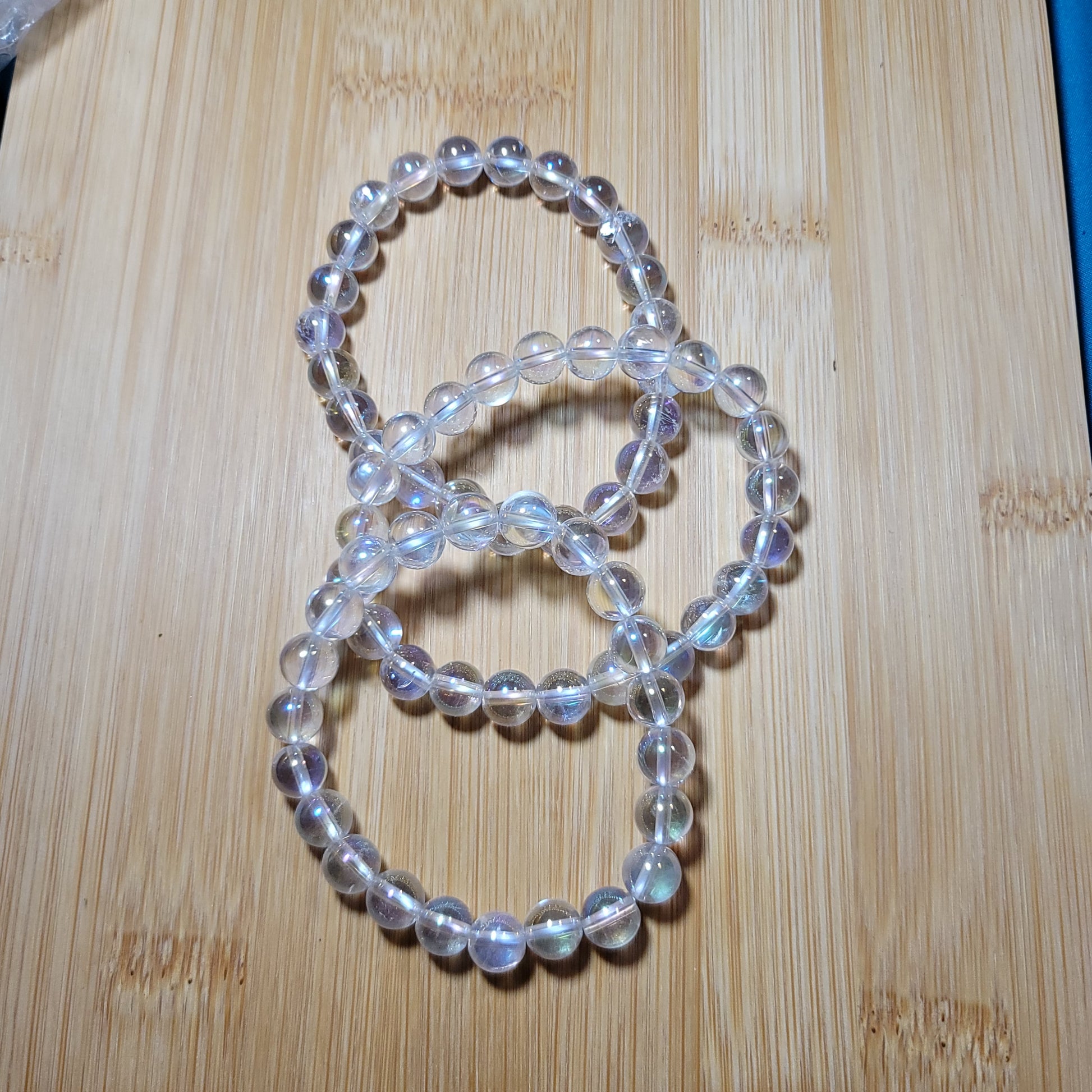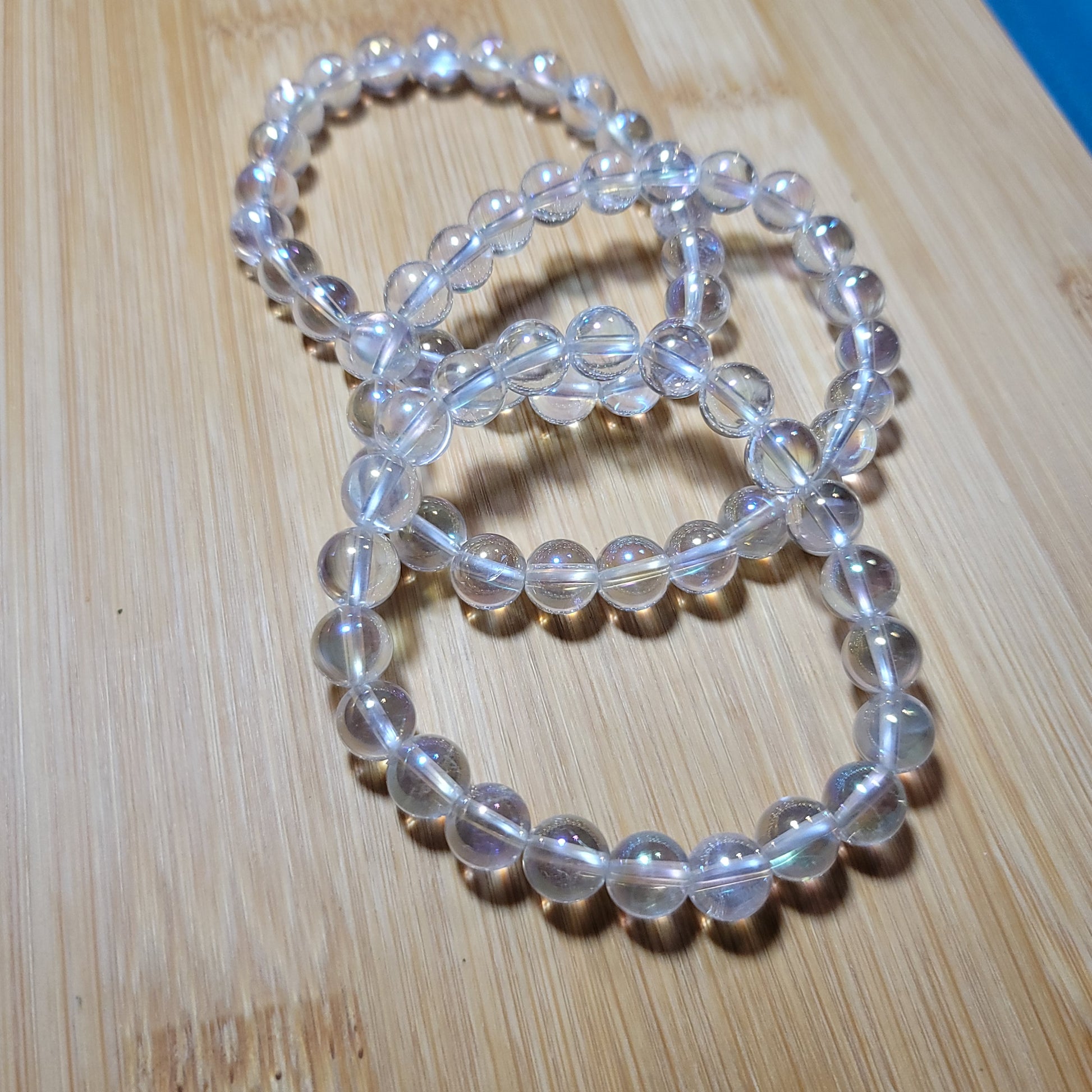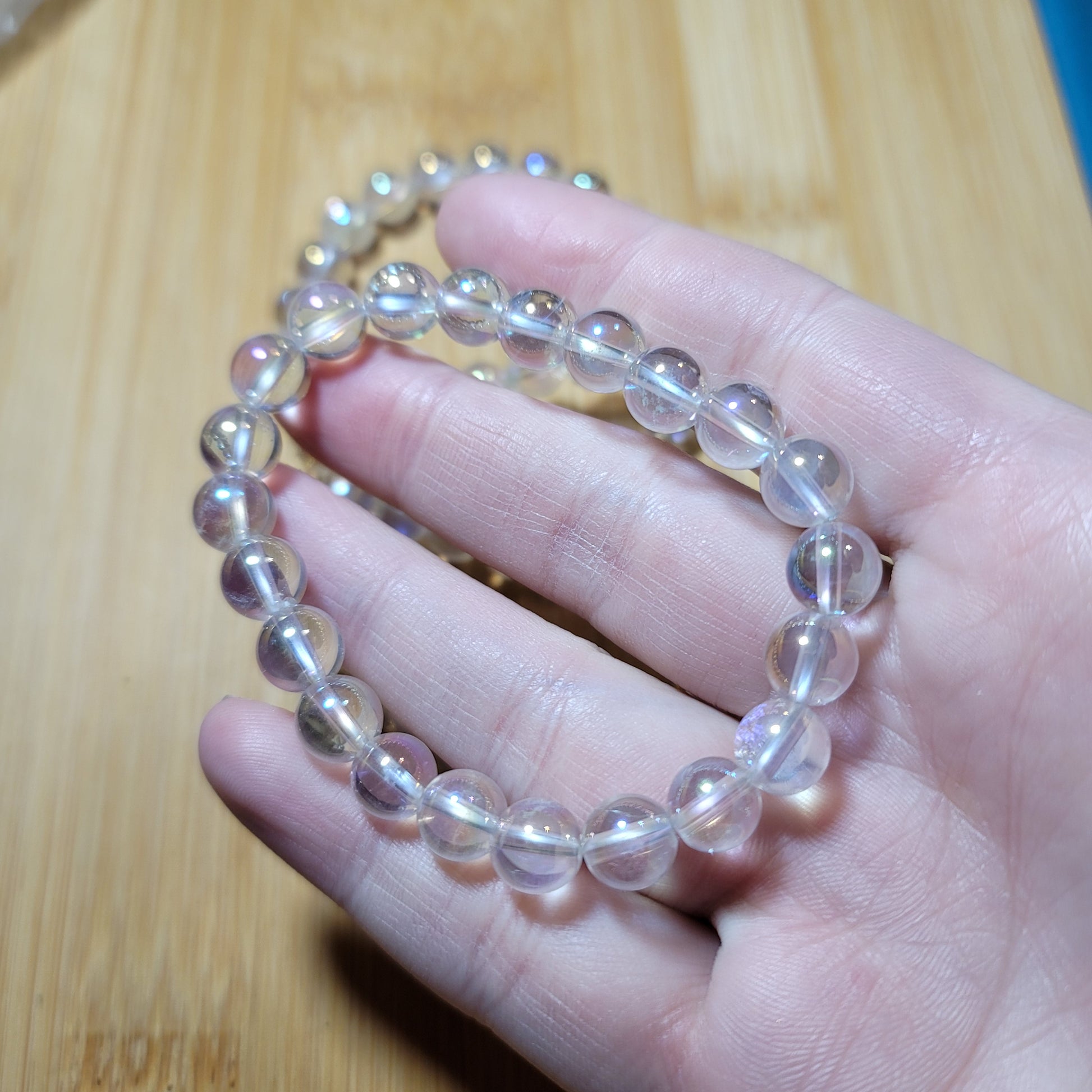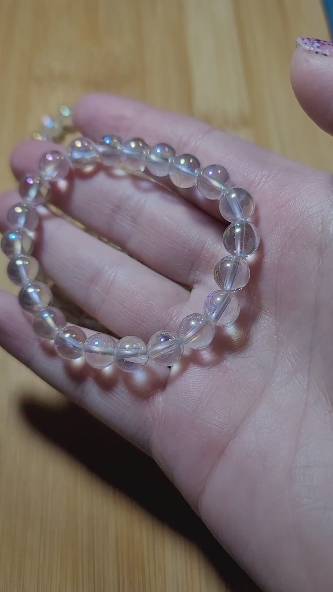 Created with Platinum & or Silver, Angel Aura Quartz has an iridescent sheen that almost looks white. This clean, dreamy color is the perfect canvas for rainbows and flashes of colors that appear when angled or in a beam of light. Like all Aura Quartz, Angel Aura Quartz is easy to fall in love with at first sight. Very visually engaging, Angle Quartz is one that you can’t help but explore, finding all of its colors and light. For this reason, it makes a wonderful stone for gazing, clearing the mind and meditation. Its energy is often described as loving, gentle and elevating. Similar to Clear Quartz, Angel Quartz is also considered an ‘all-healing’ crystal, beneficial to all Charkas and Zodiac signs. Its association with the spirit realm comes from its sublime, near-white color and fine vibration.