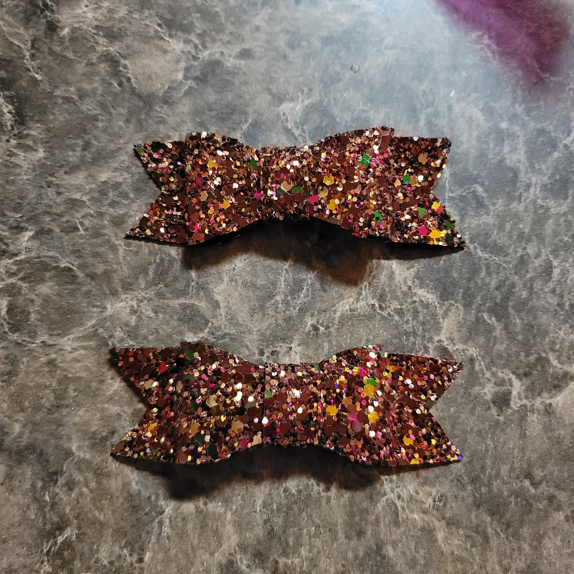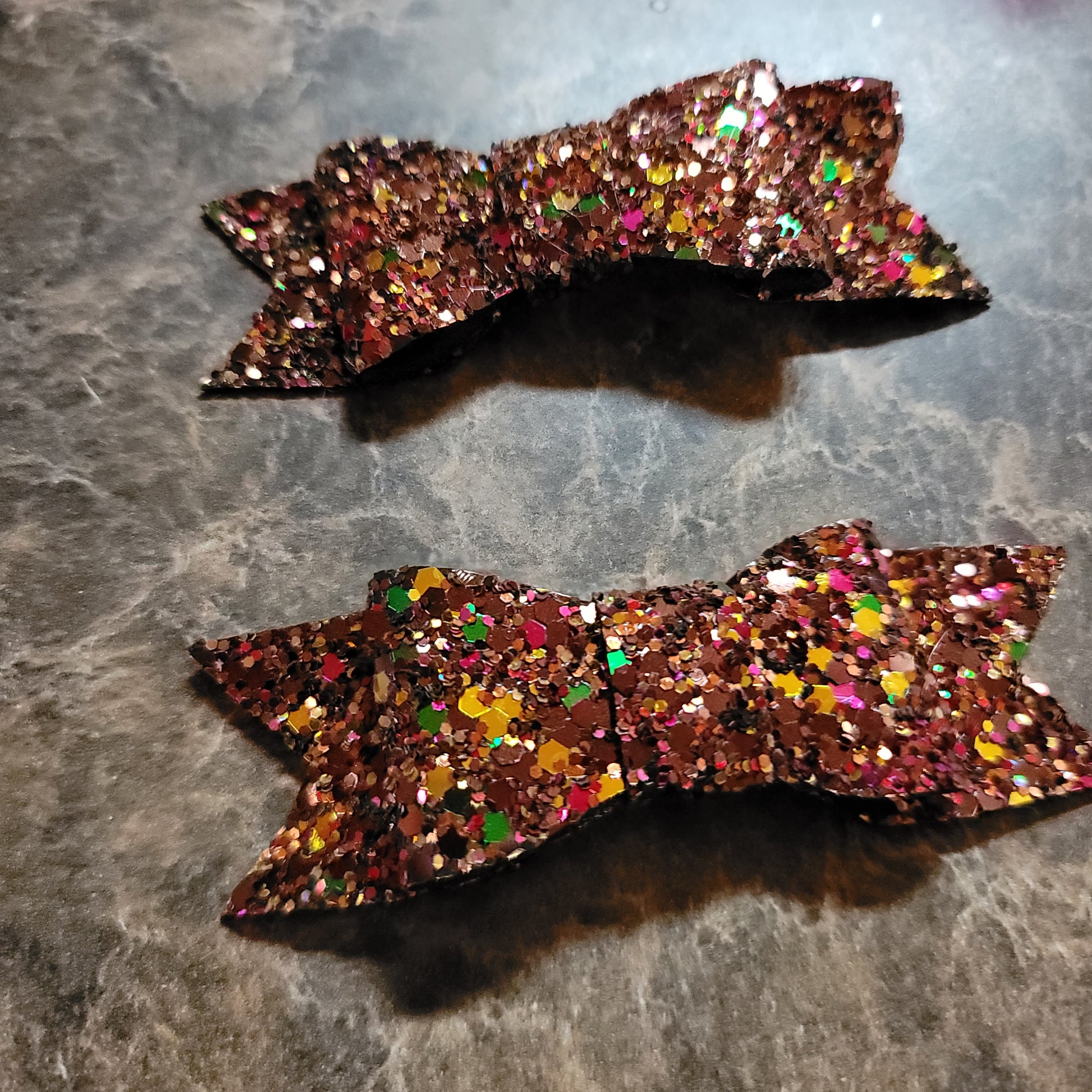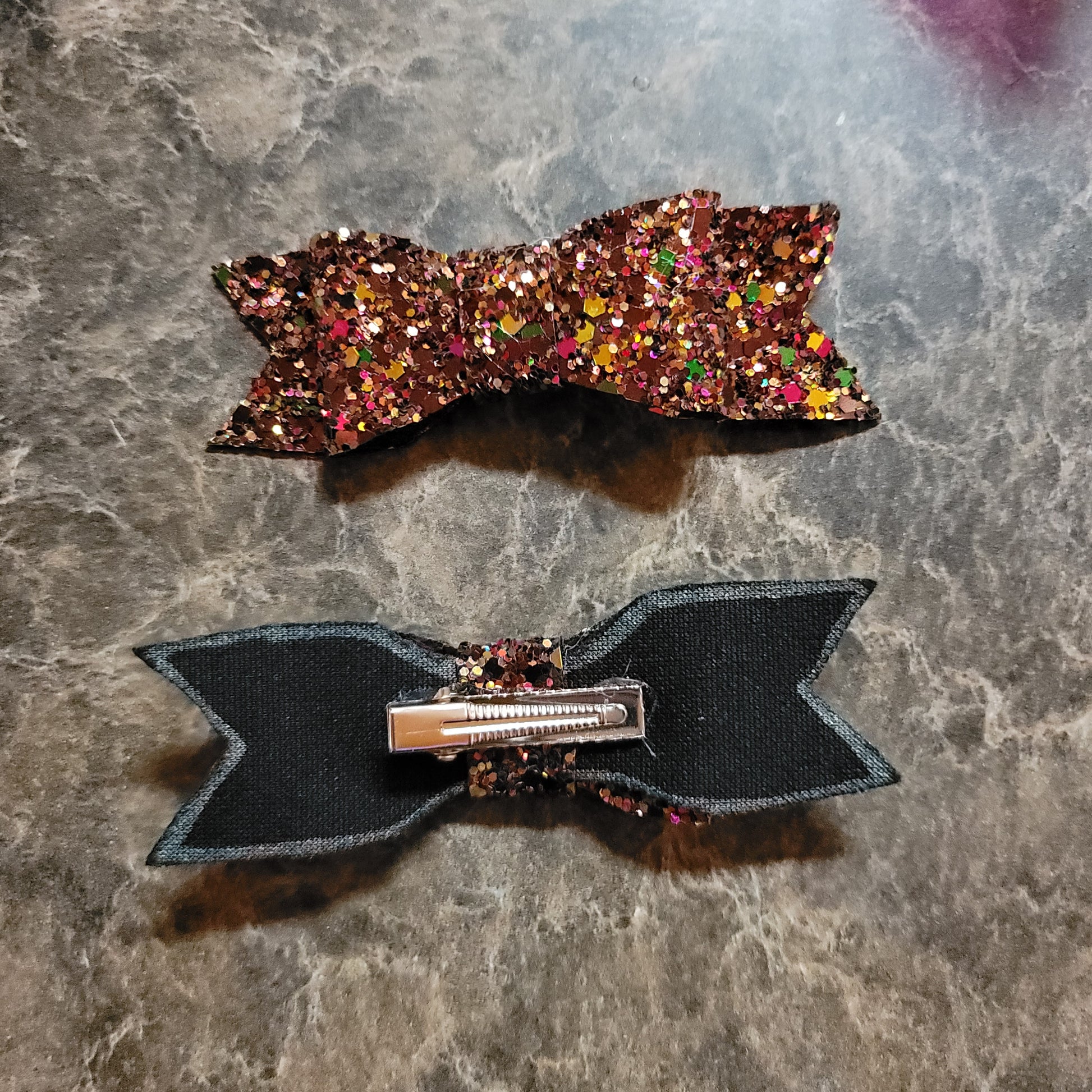 Autumn color glitter material. Small bow set secured on alligator clips.