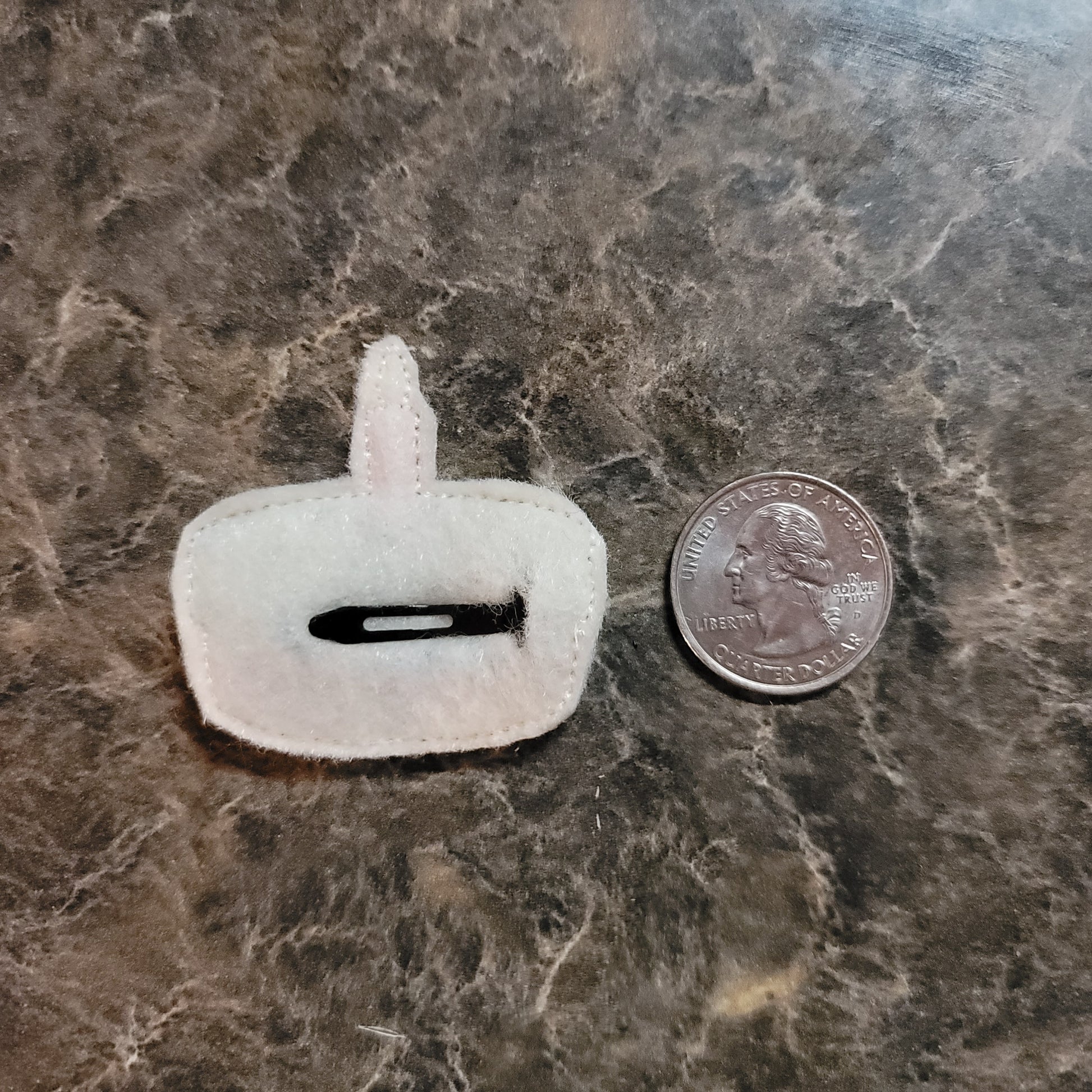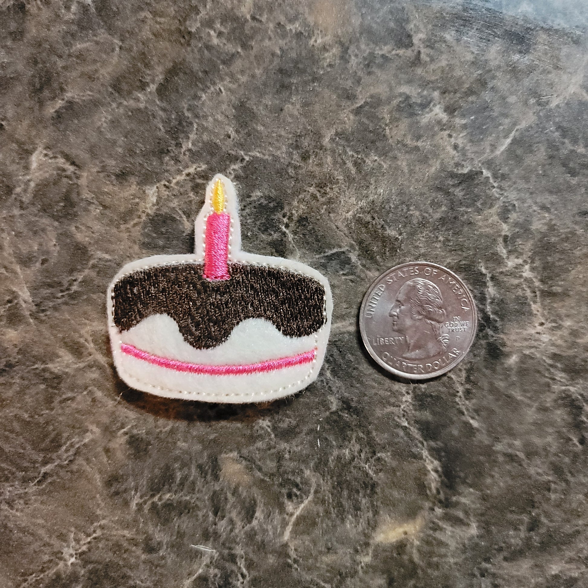 Adorable birthday cake feltie secured on a 1.2 inch snap clip.