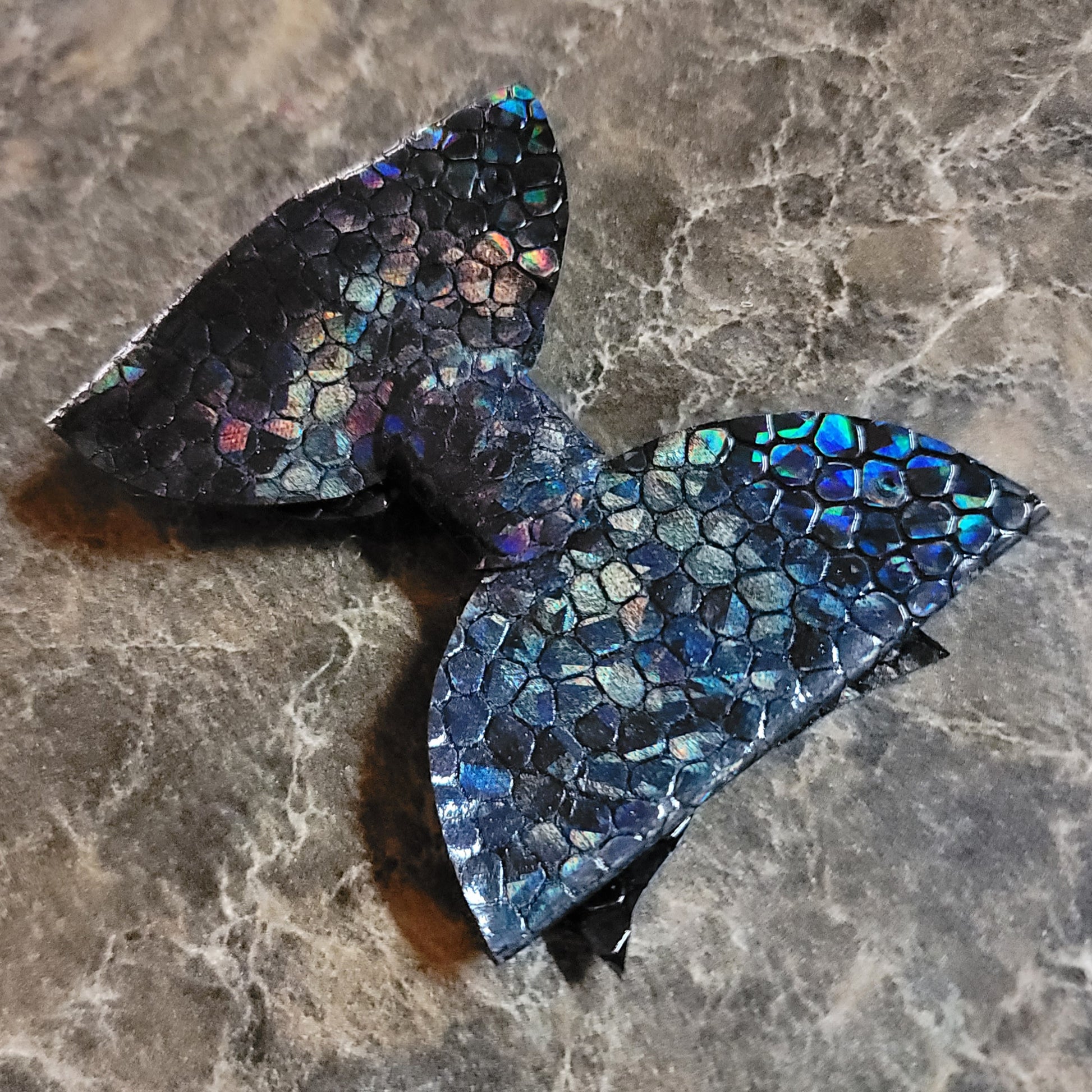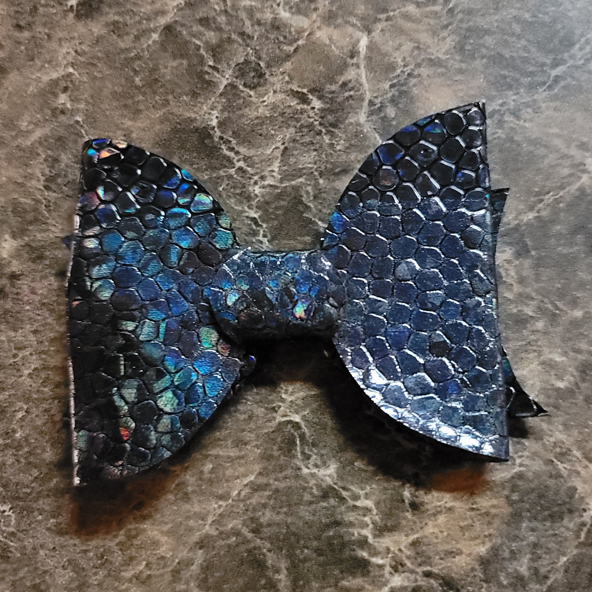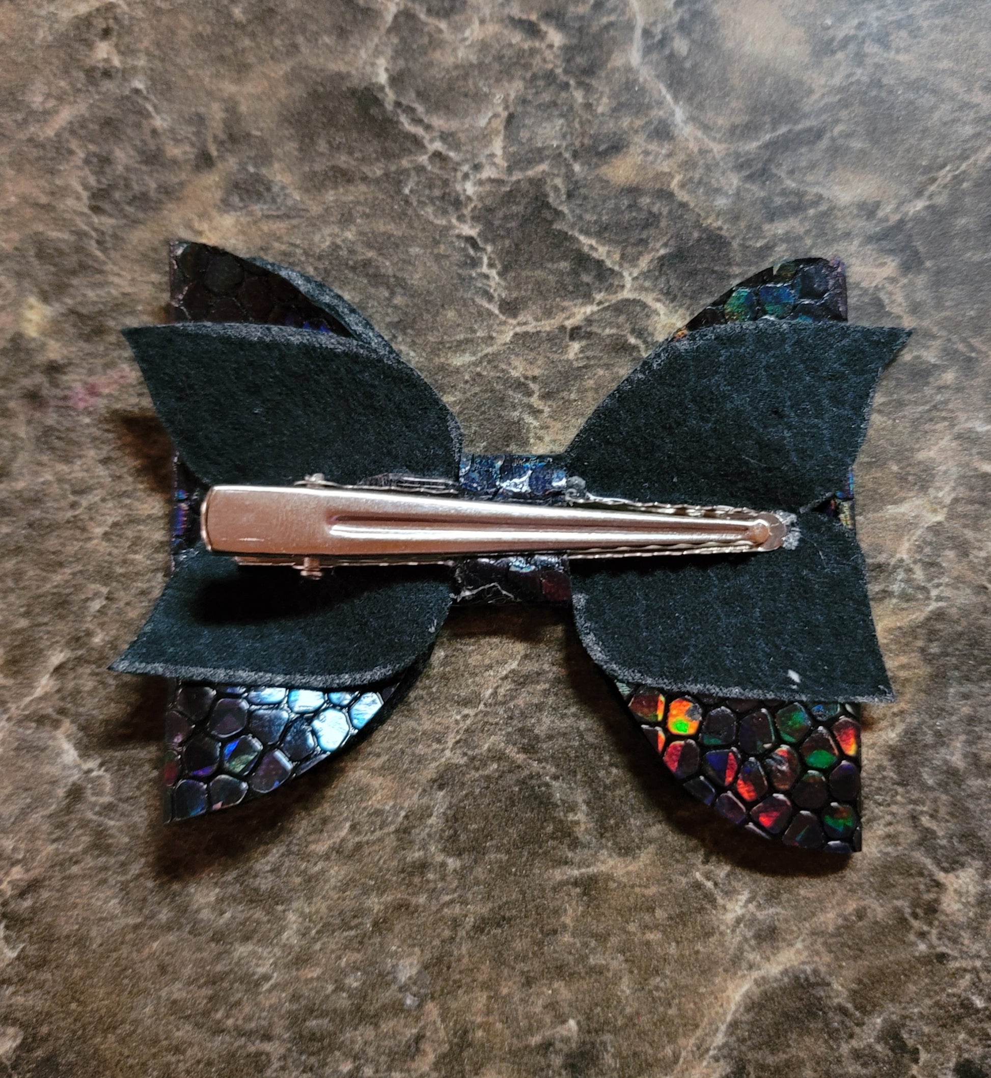 Black color shifting soft faux leather. Medium bow secured on an alligator clip.