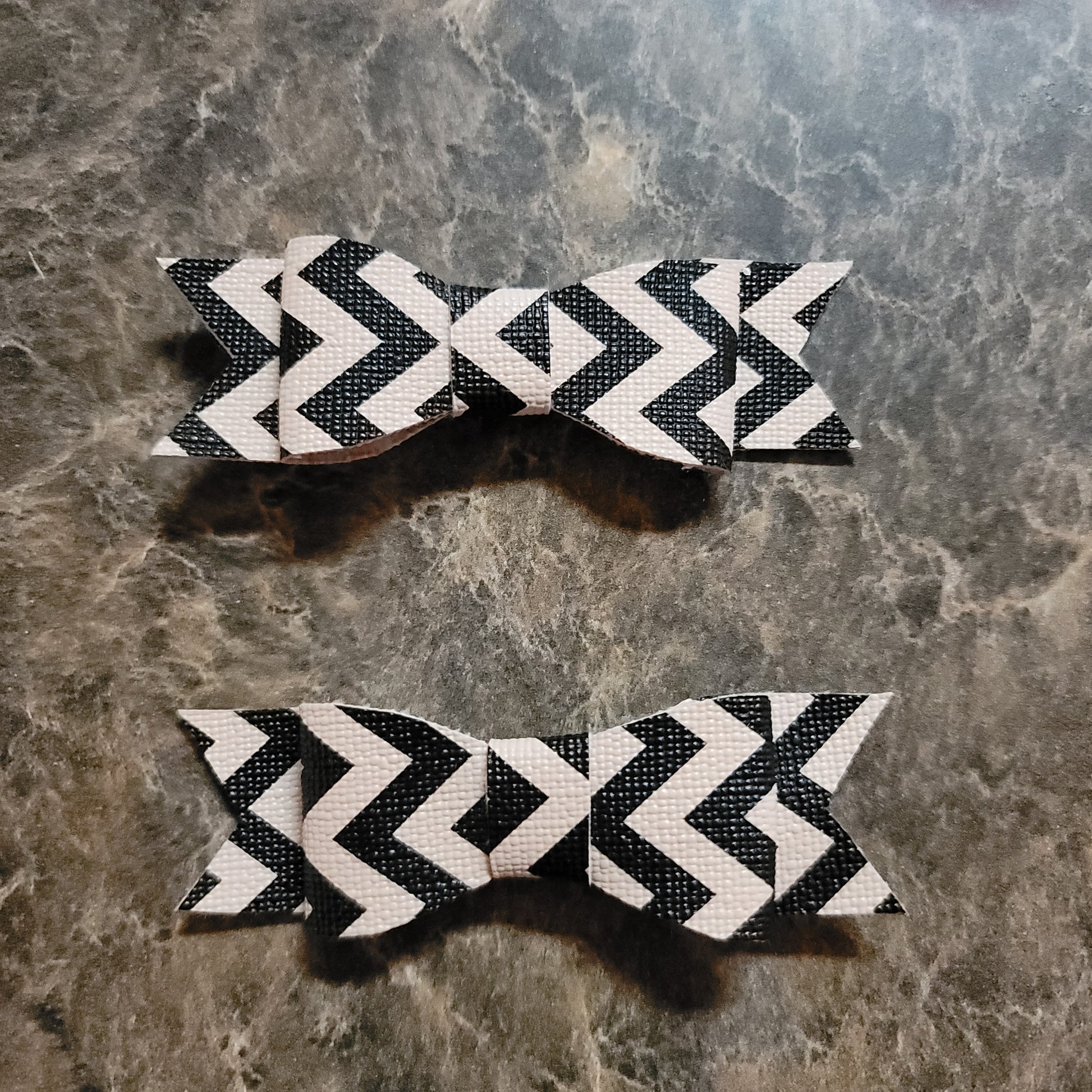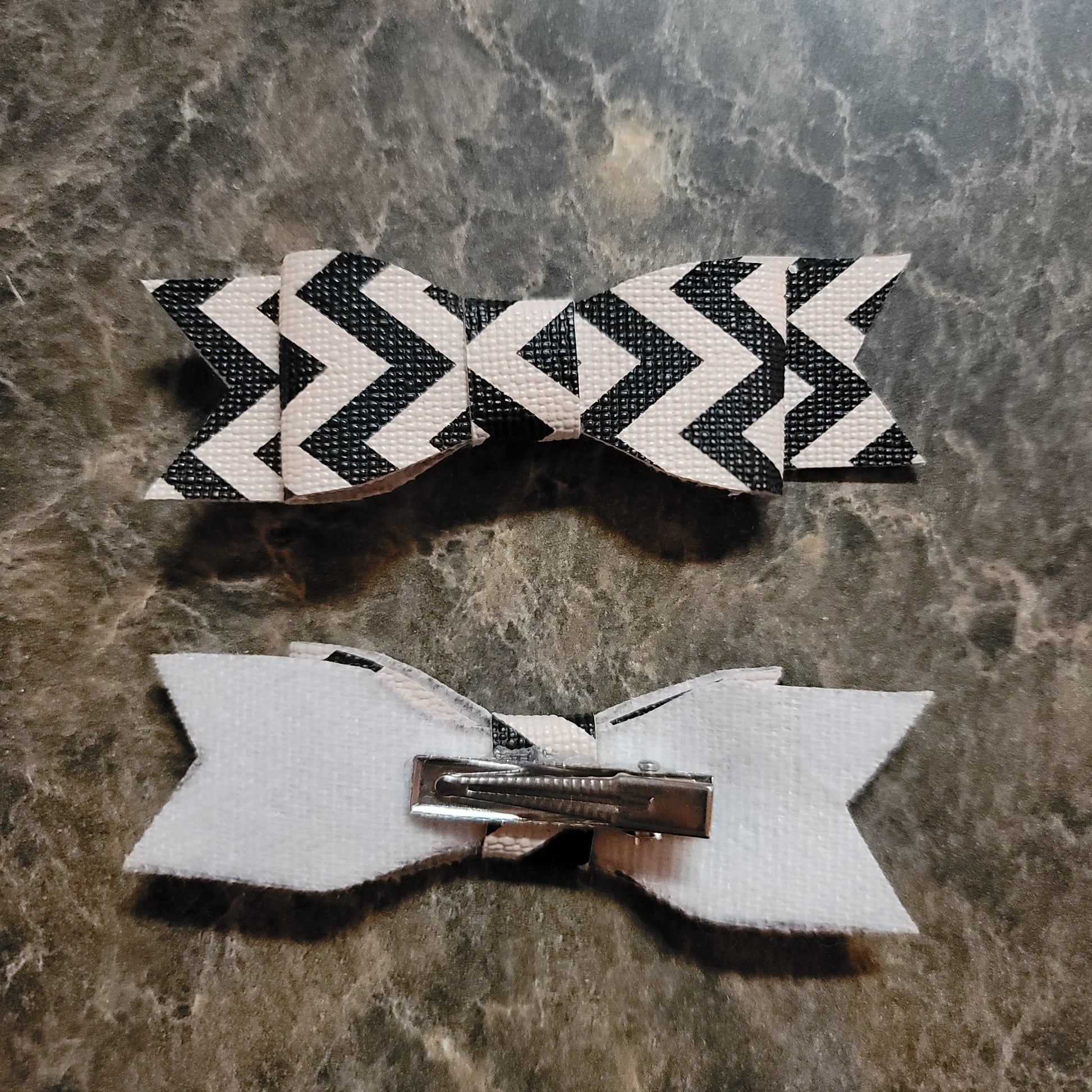 Black and cream chevron print faux leather. Small bows secured on alligator clips.