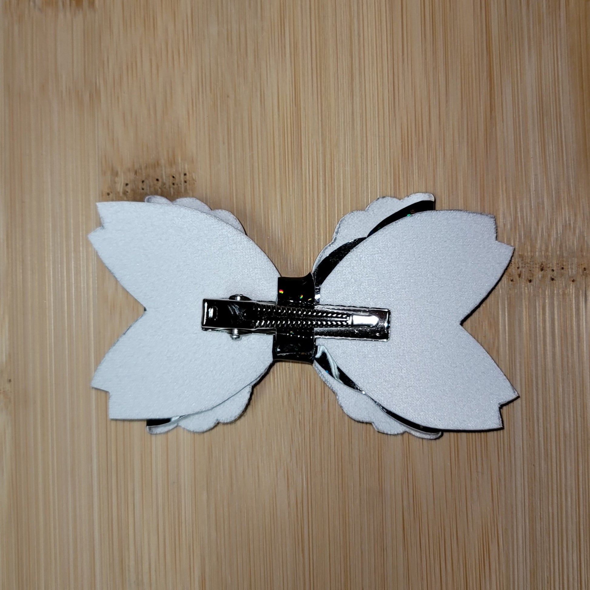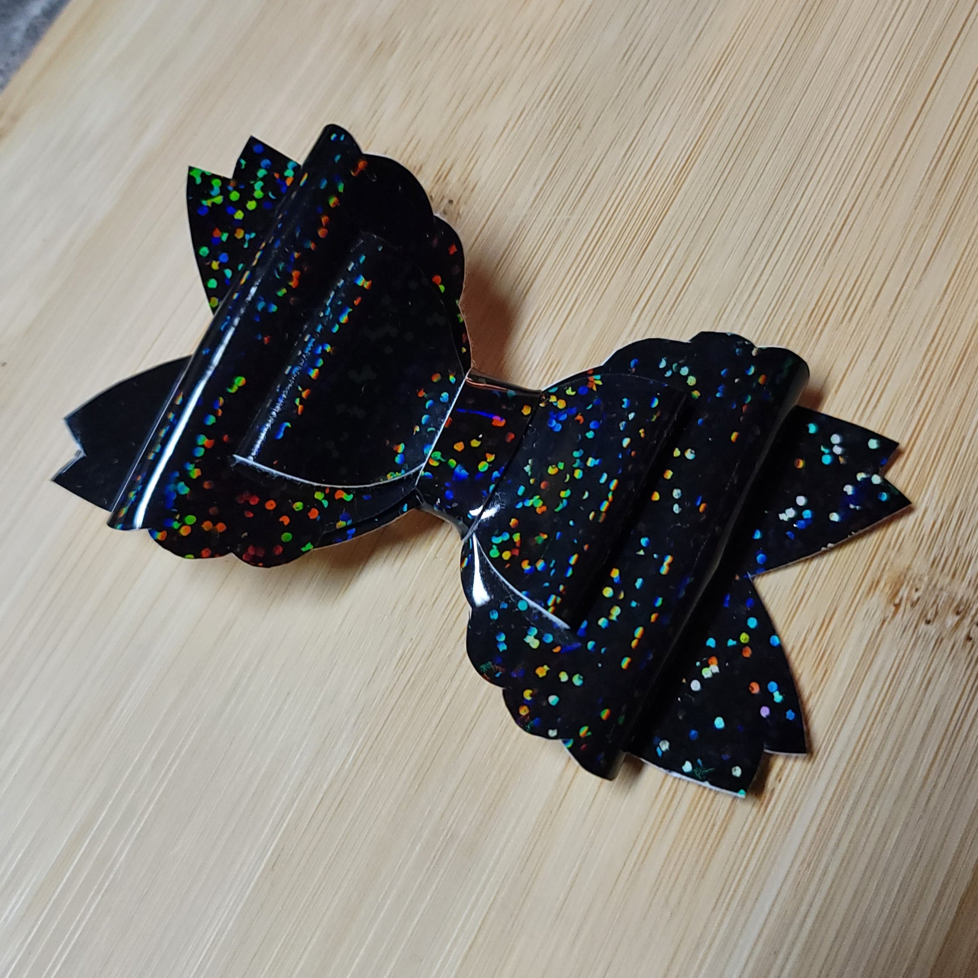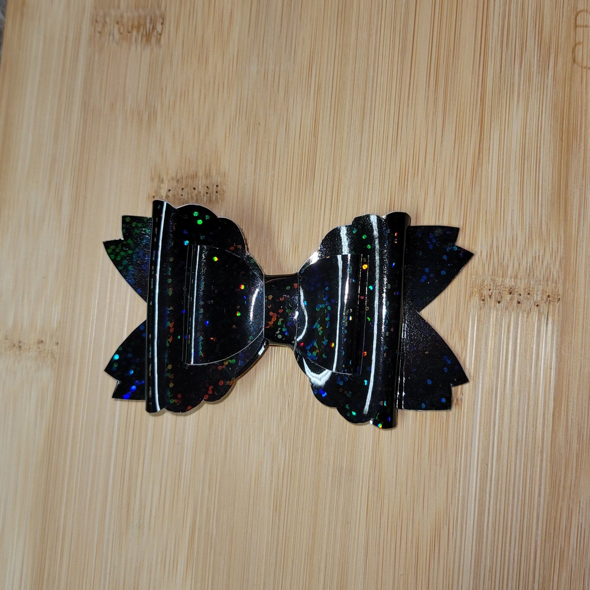 Black holographic vinyl double stack medium bow. Secured on an alligator clip.