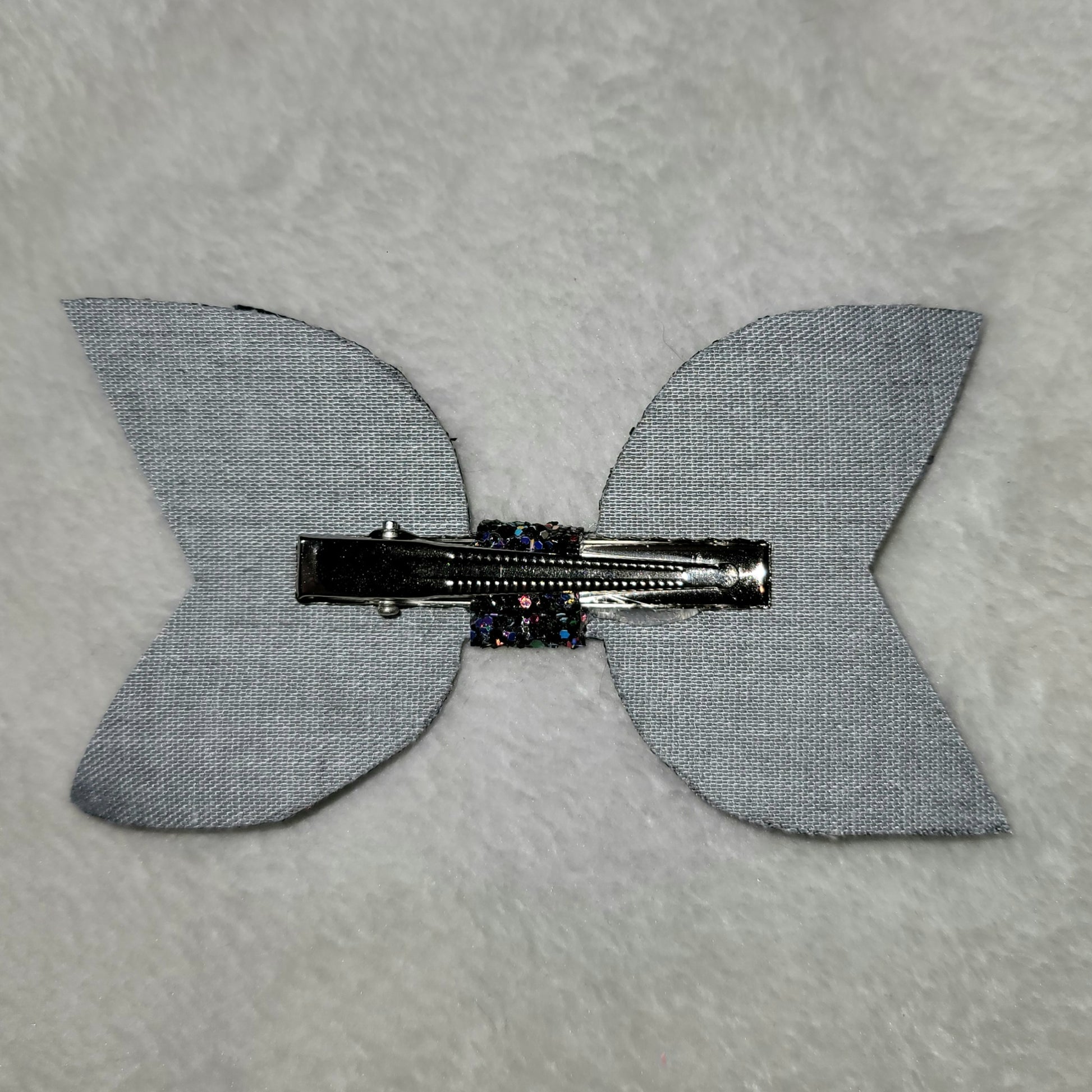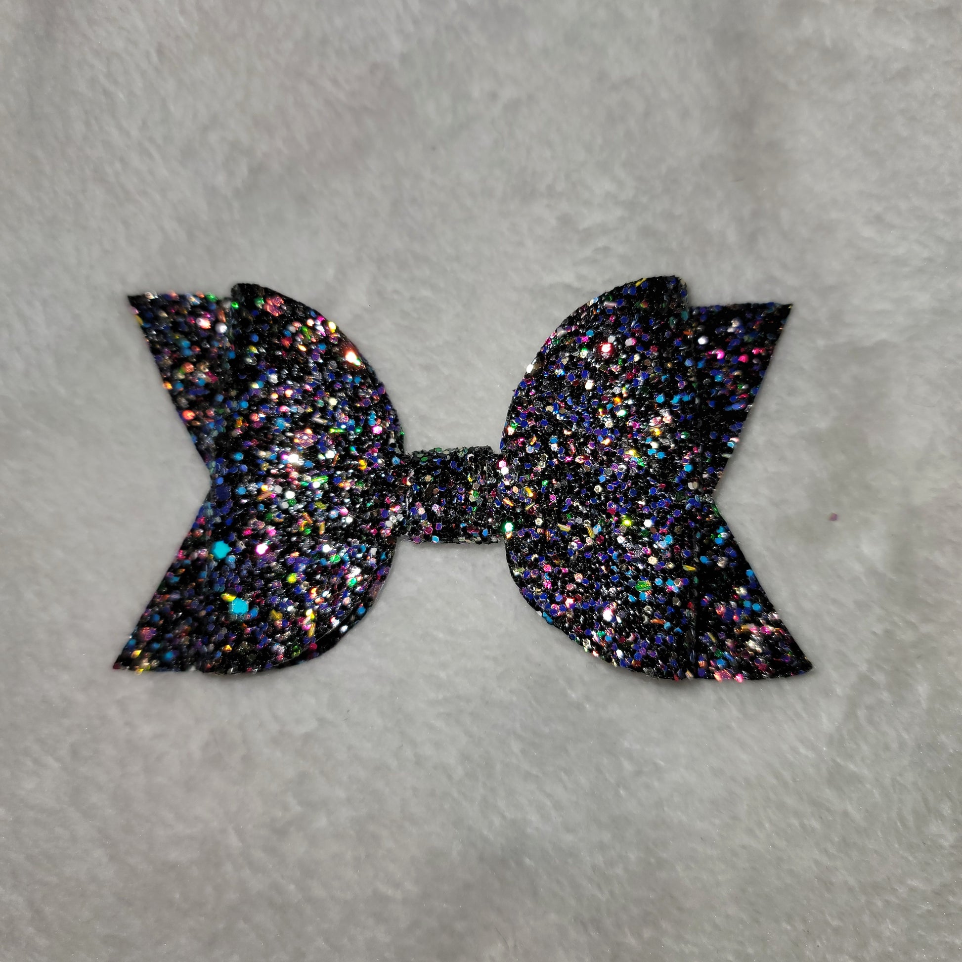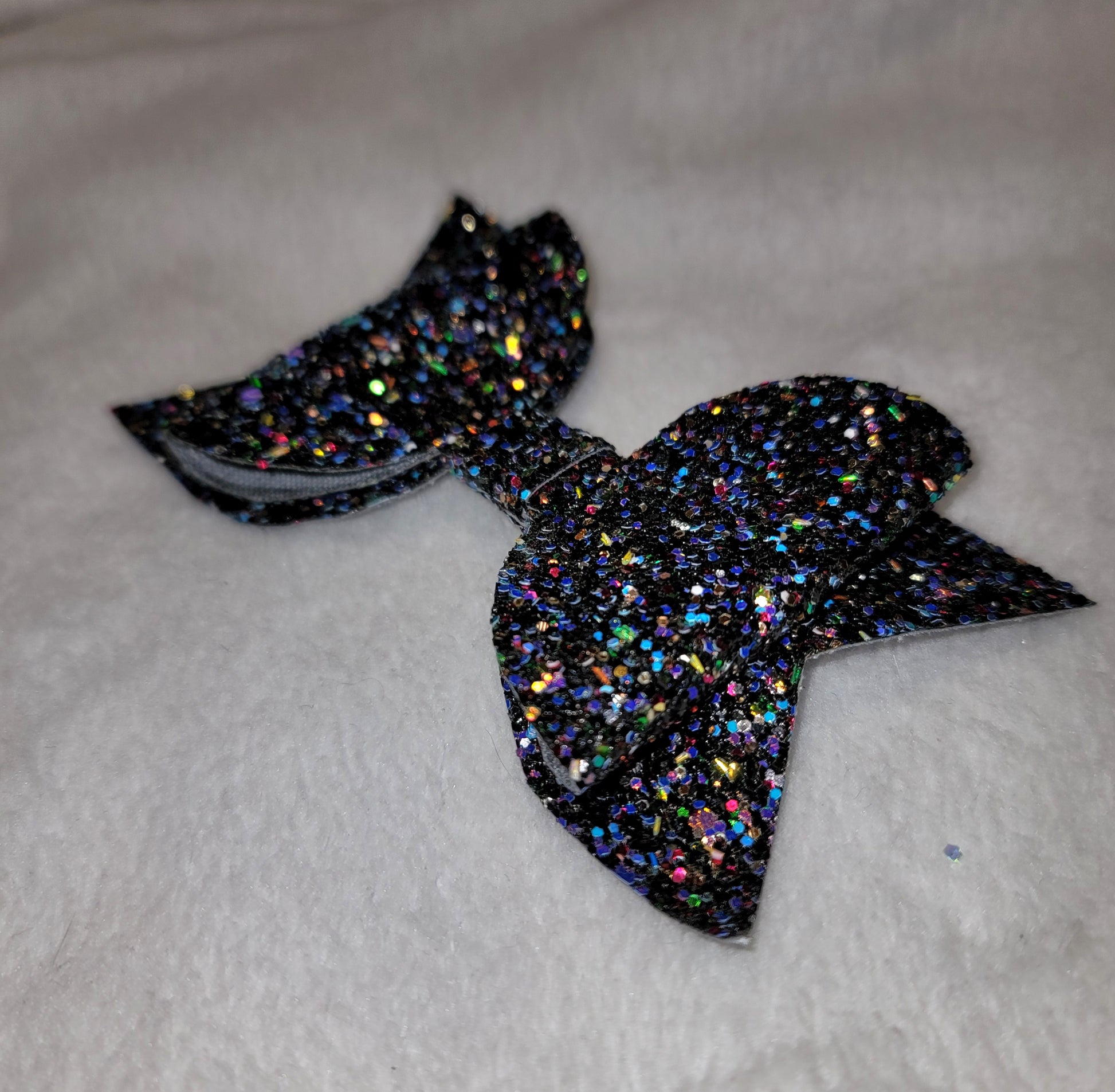 Black multicolor glitter with soft backing, large bow secured on an alligator clip.