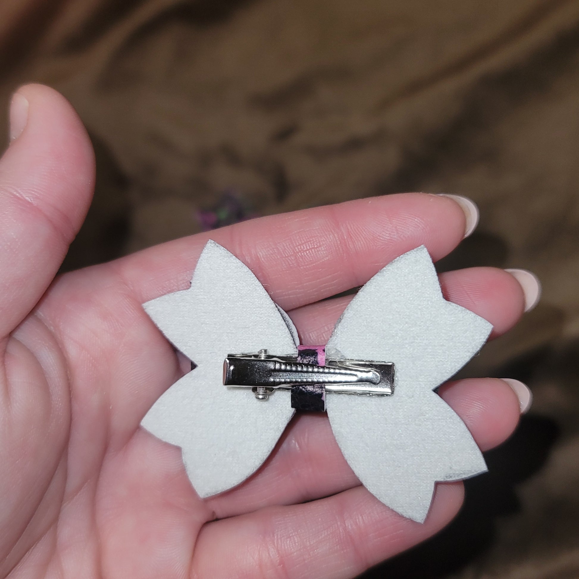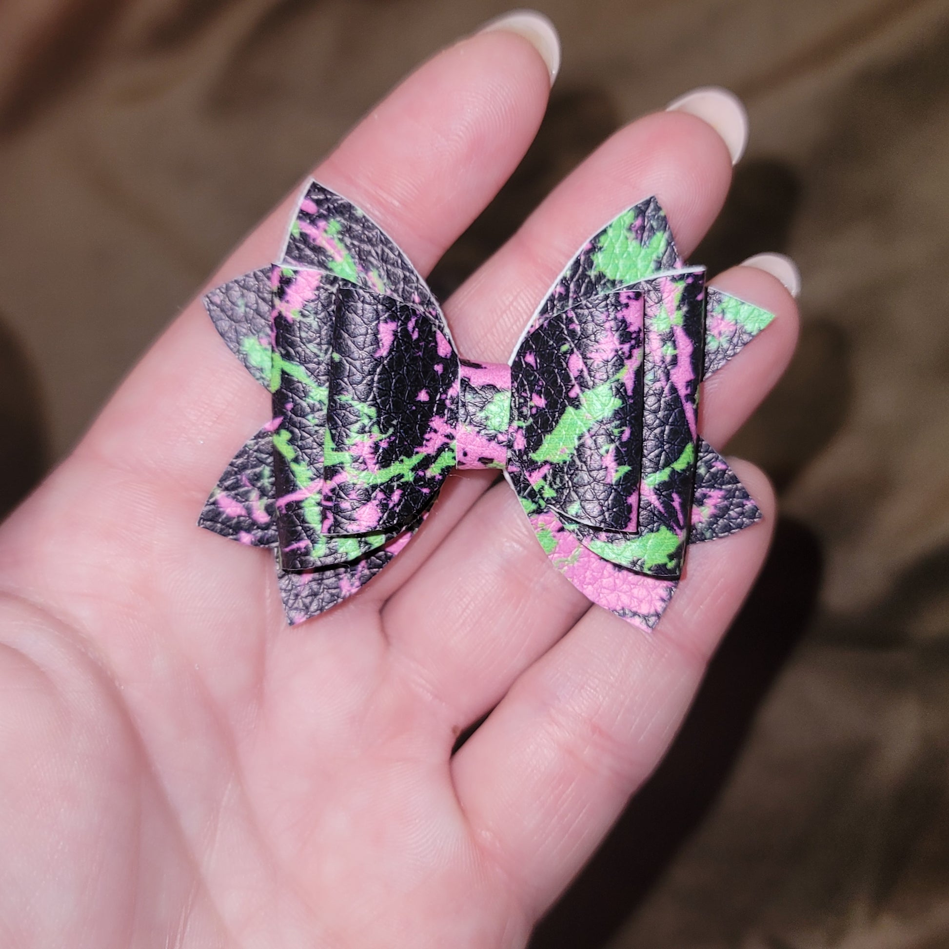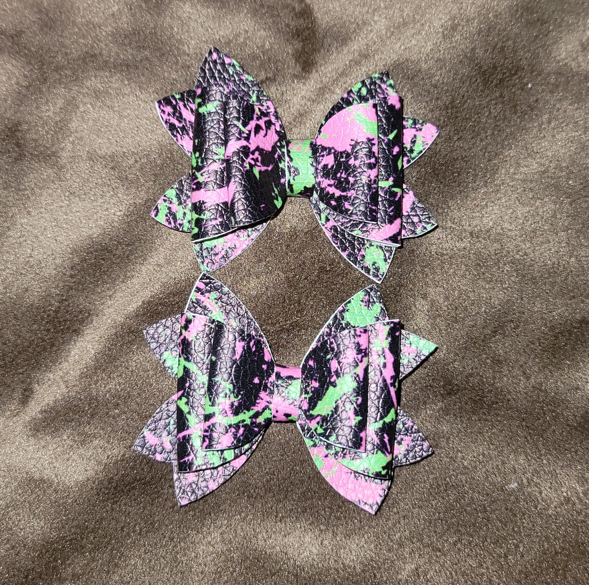 Black neon splatter print faux leather. 2.5 inch Lou Lou style bows. Secured on alligator clips.