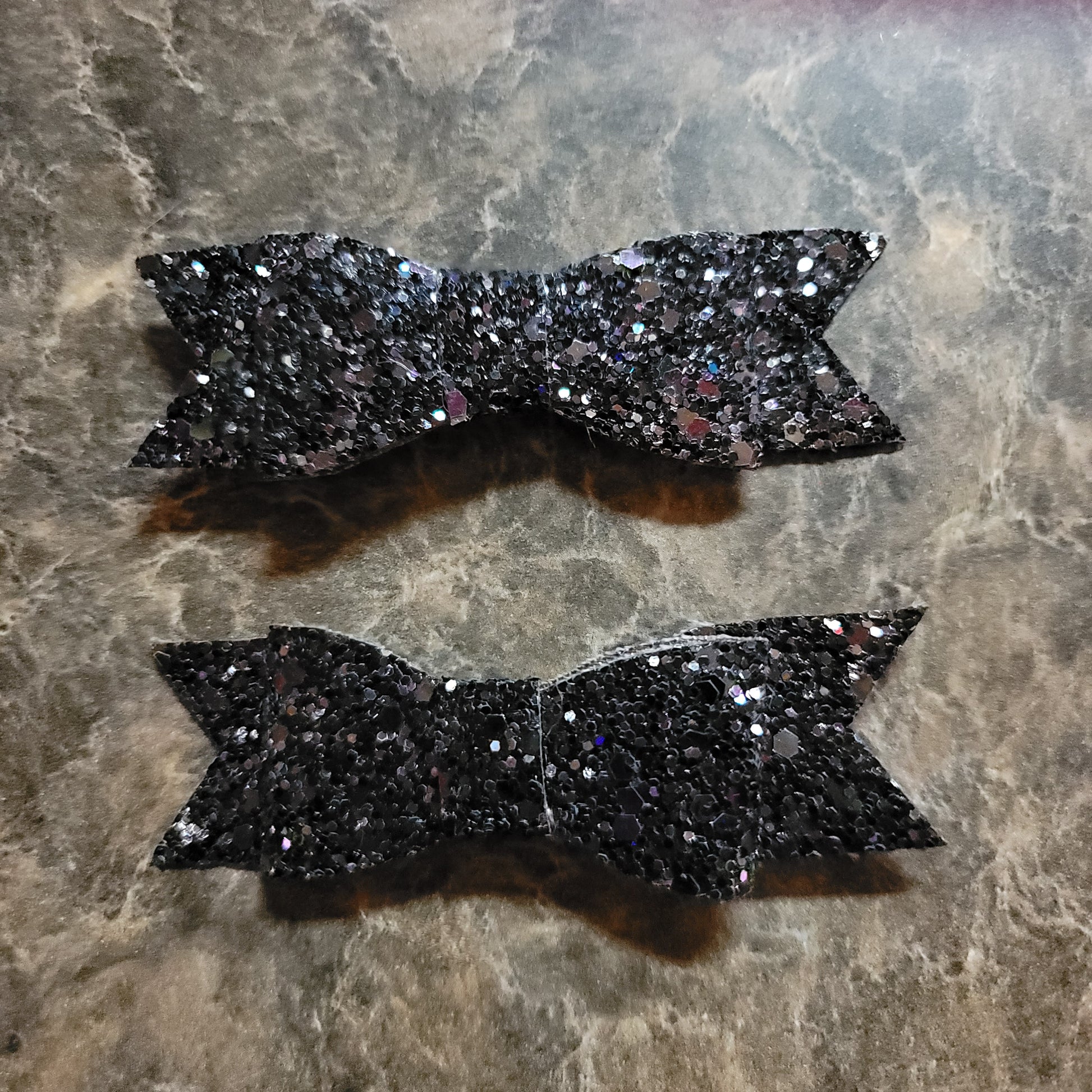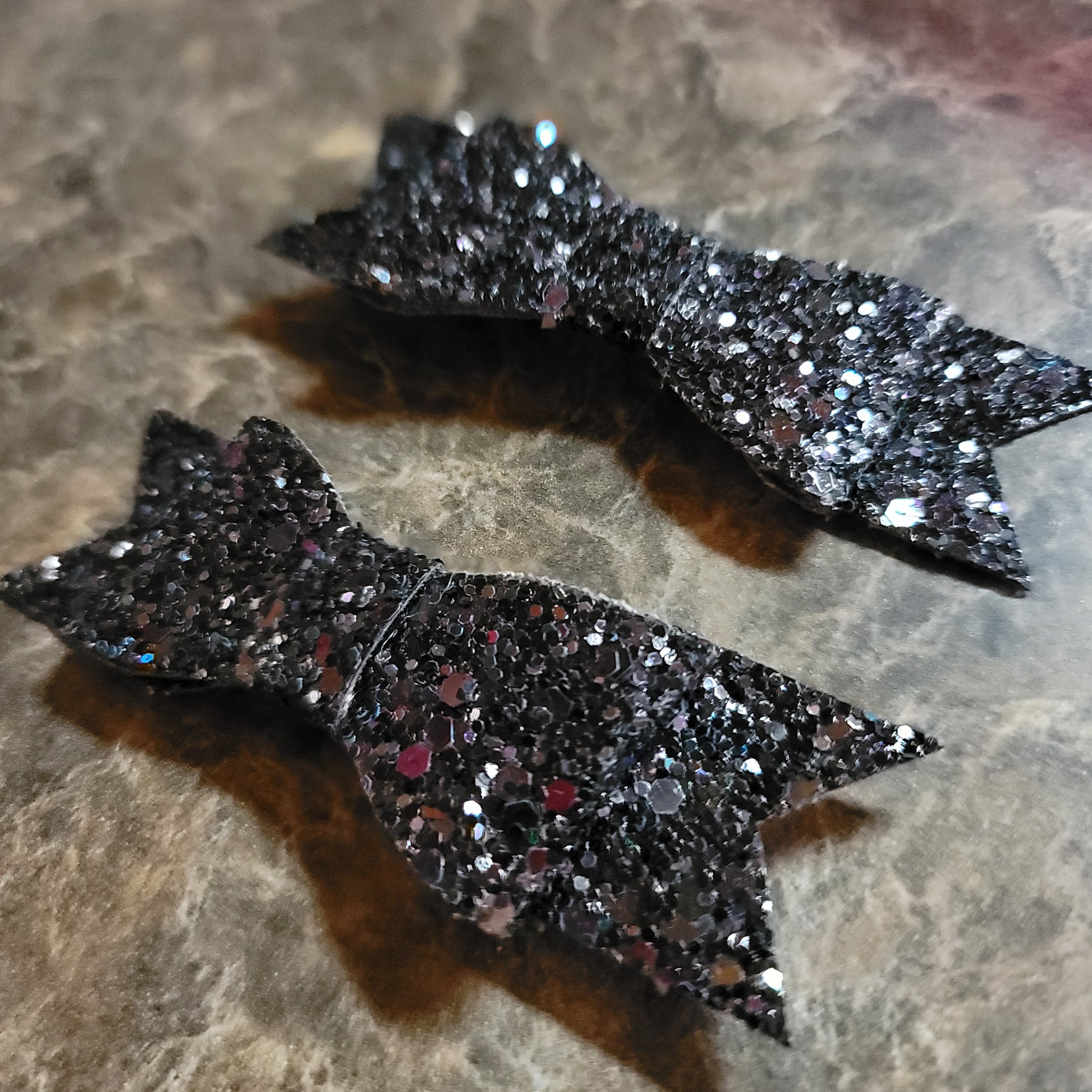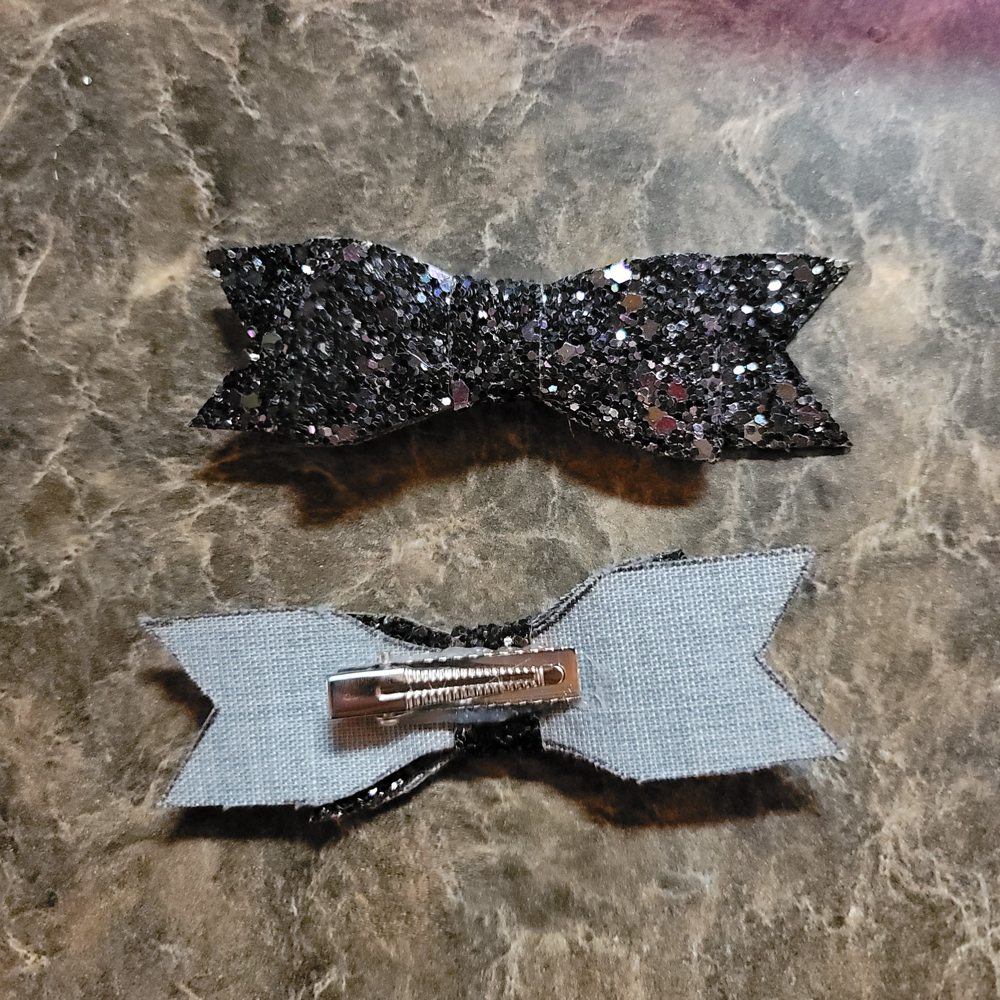 Black and silver glitter material with soft backing. Small bows secured on alligator clips.