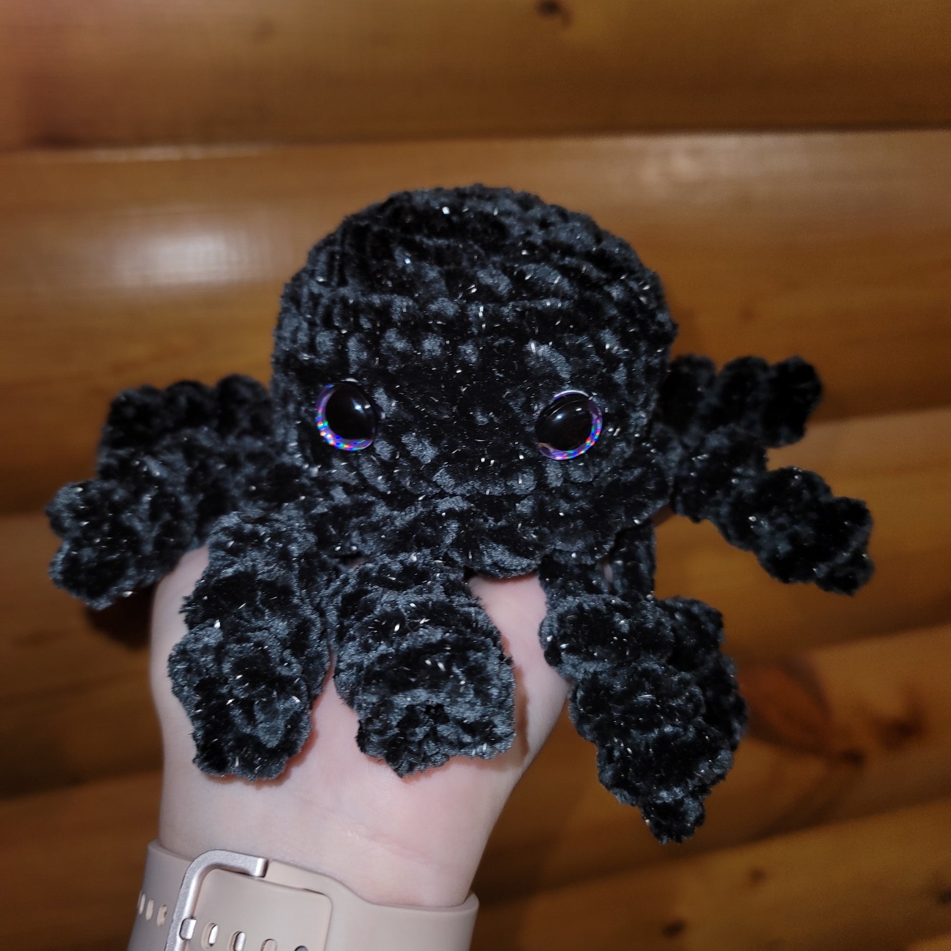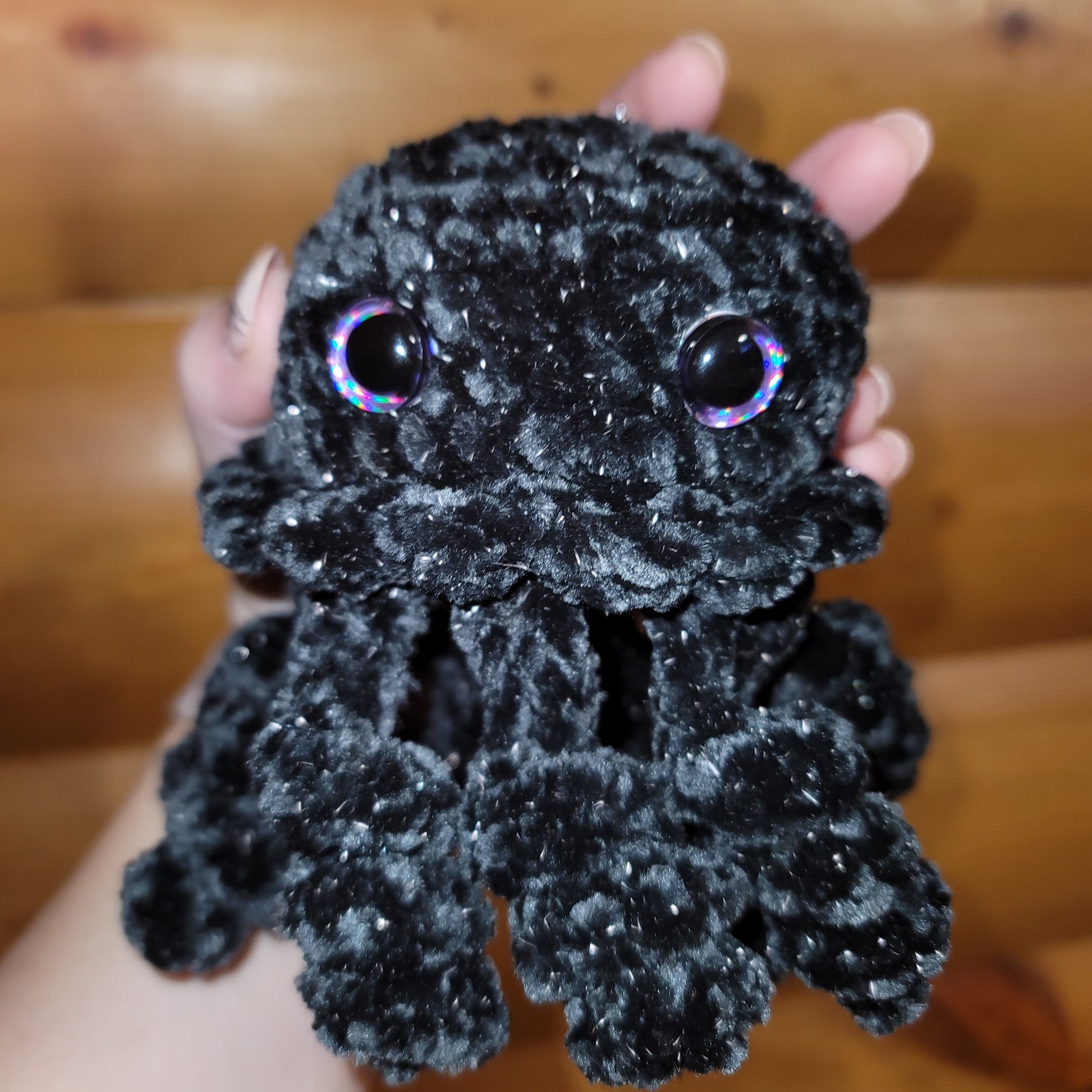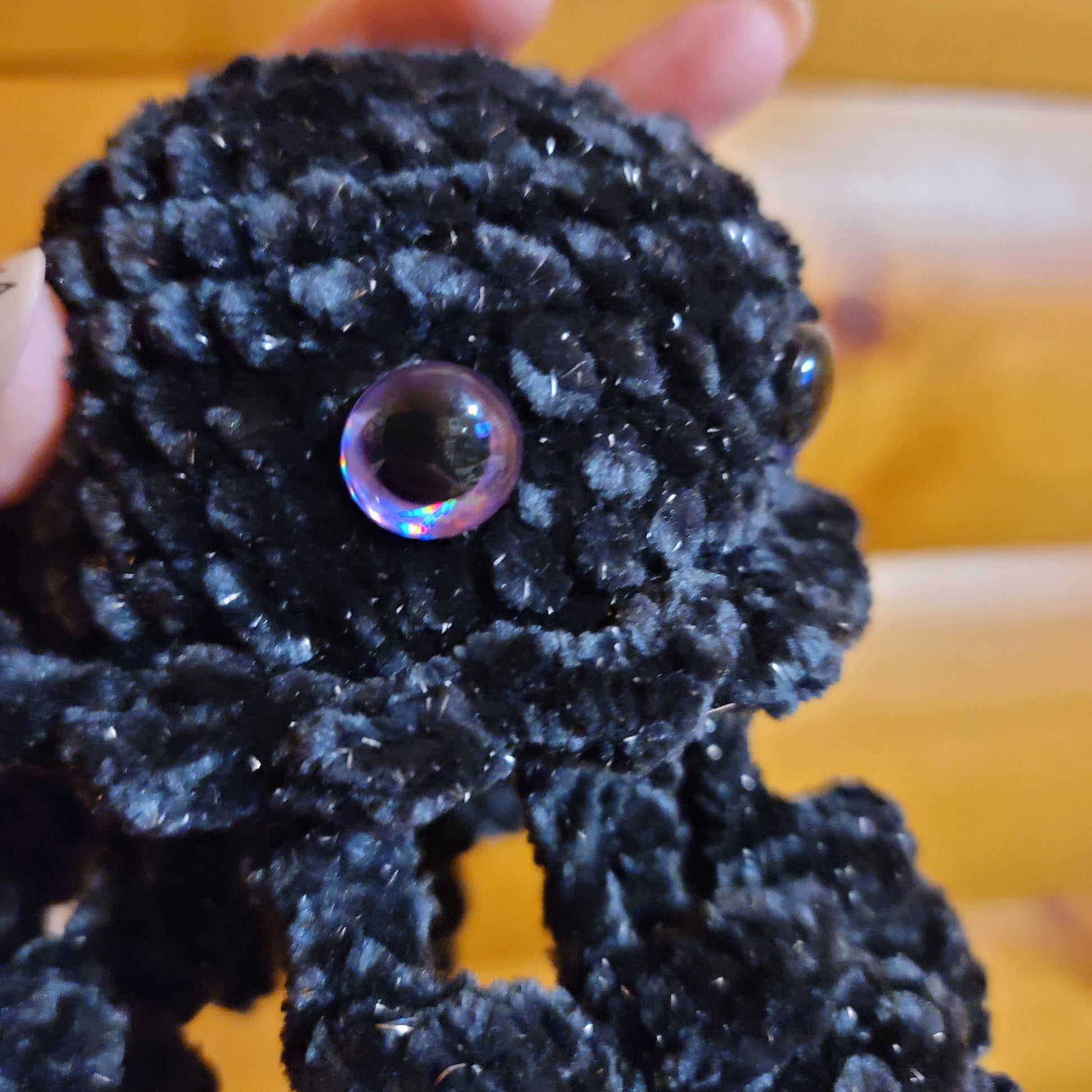 Black sparkly velvet jellyfish made with Juicy Couture velvet yarn. Eyes are plastic safety eyes.