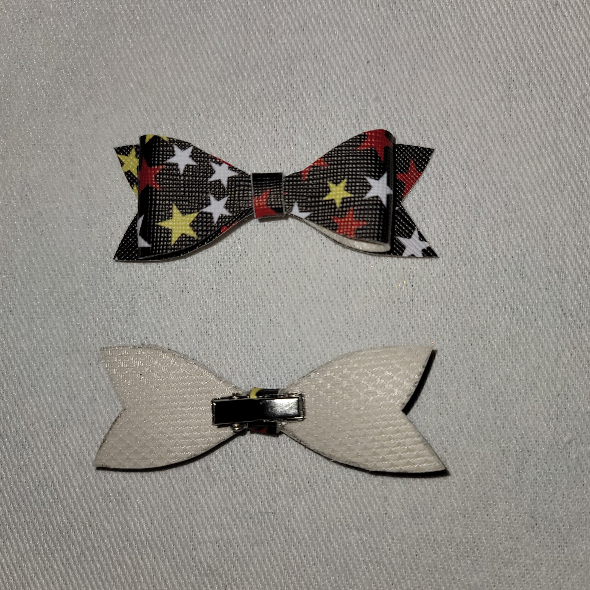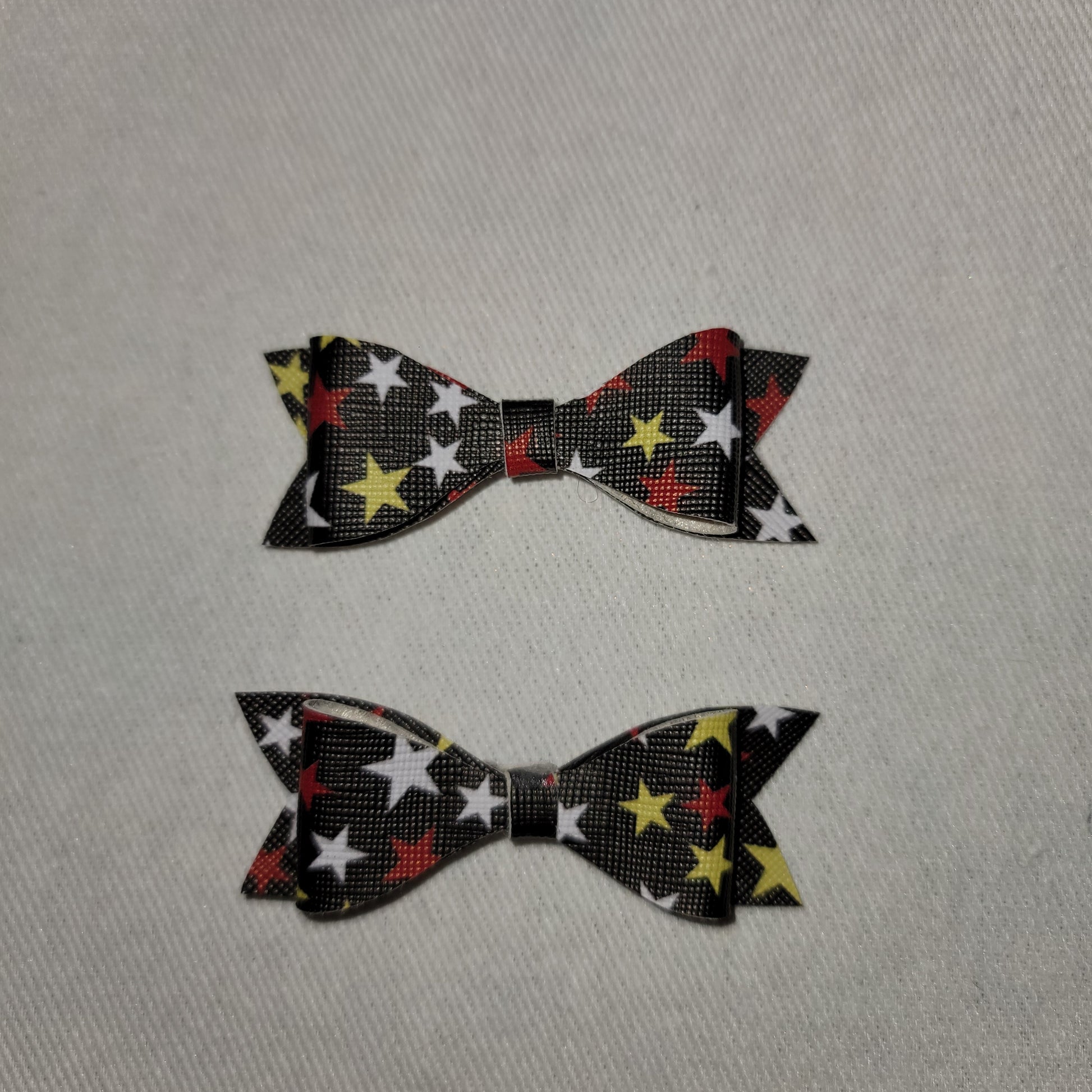 Black with stars print faux leather. Mini bows secured on alligator clips.