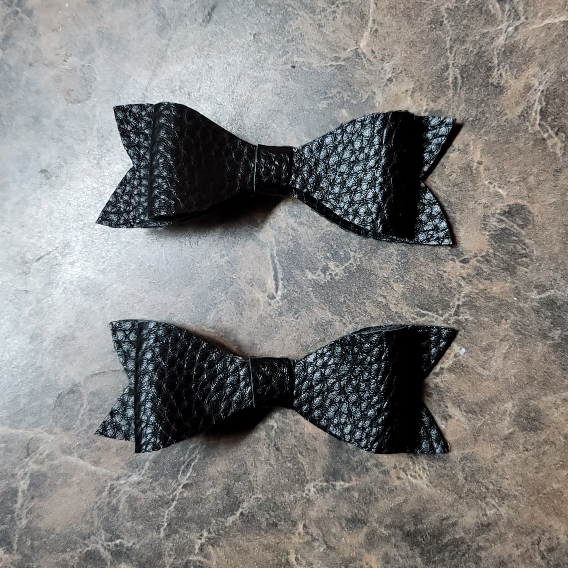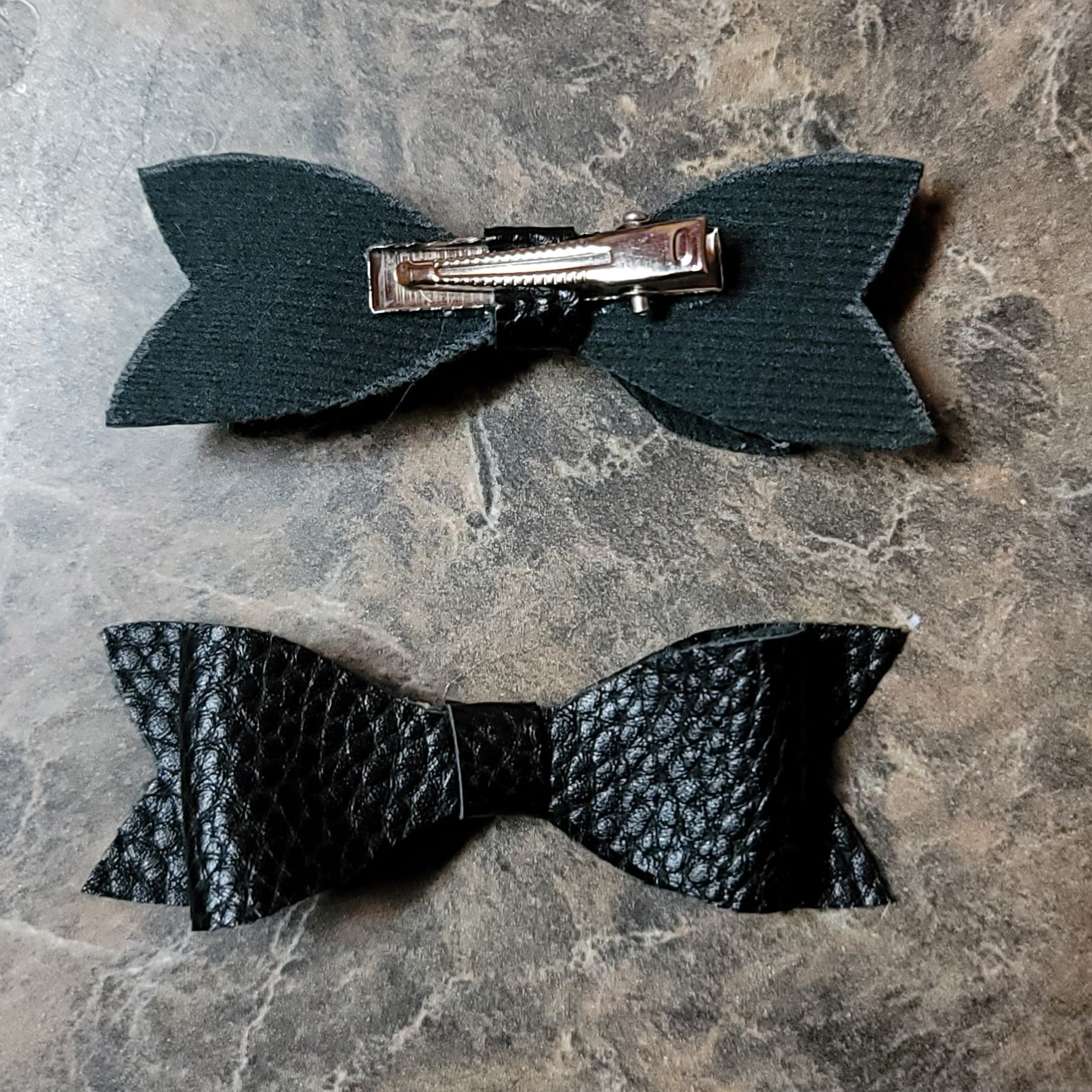 Black textured soft faux leather. Mini bows secured on alligator clips.