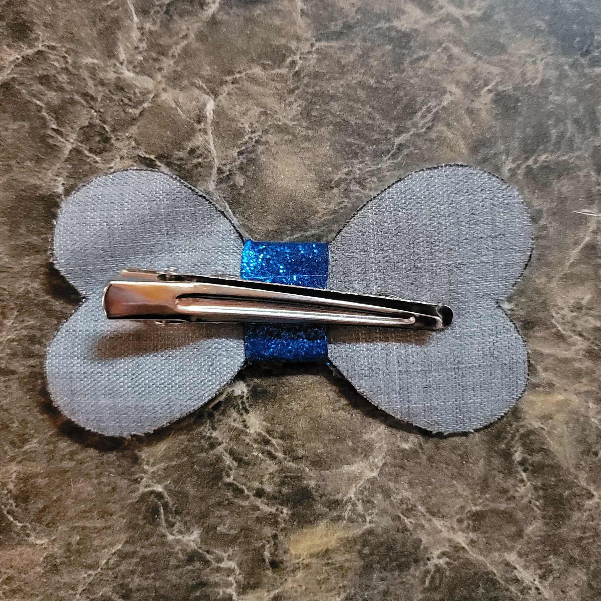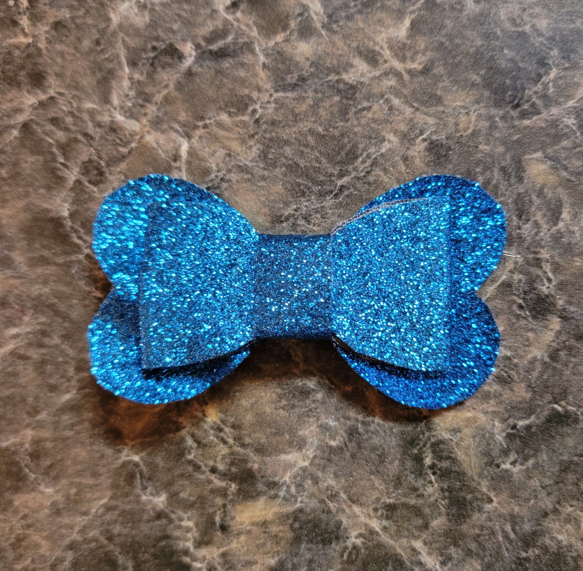 Blue glitter material with soft backing. Bow secured to an alligator clip.