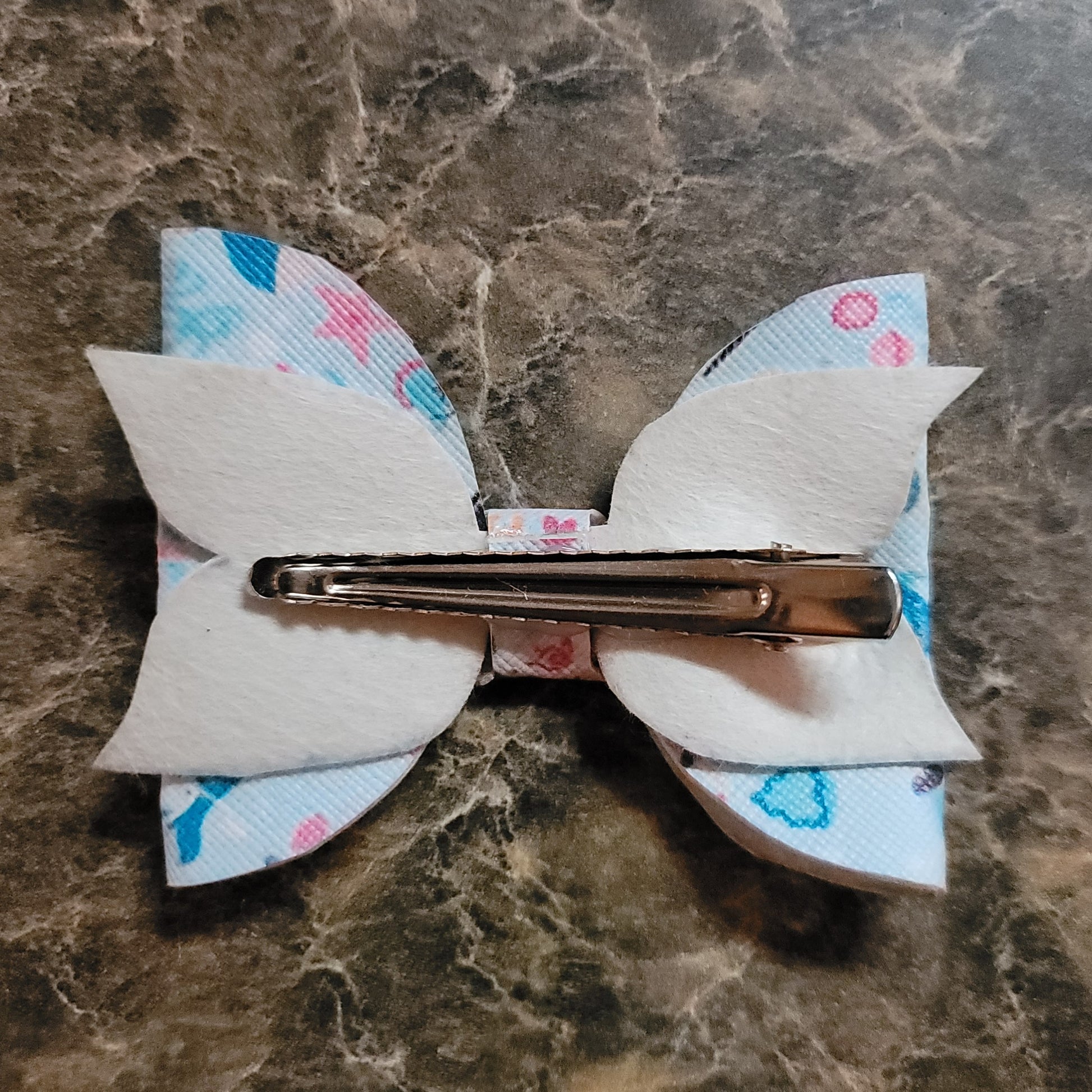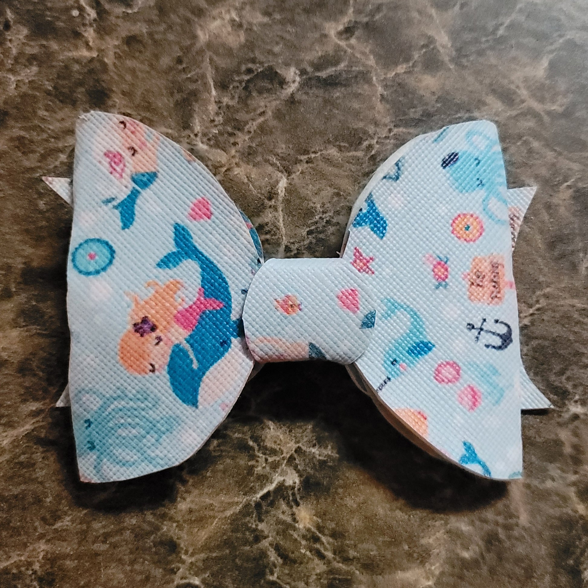 Blue mermaid sea-life print faux leather. Medium bow secured on an alligator clip.