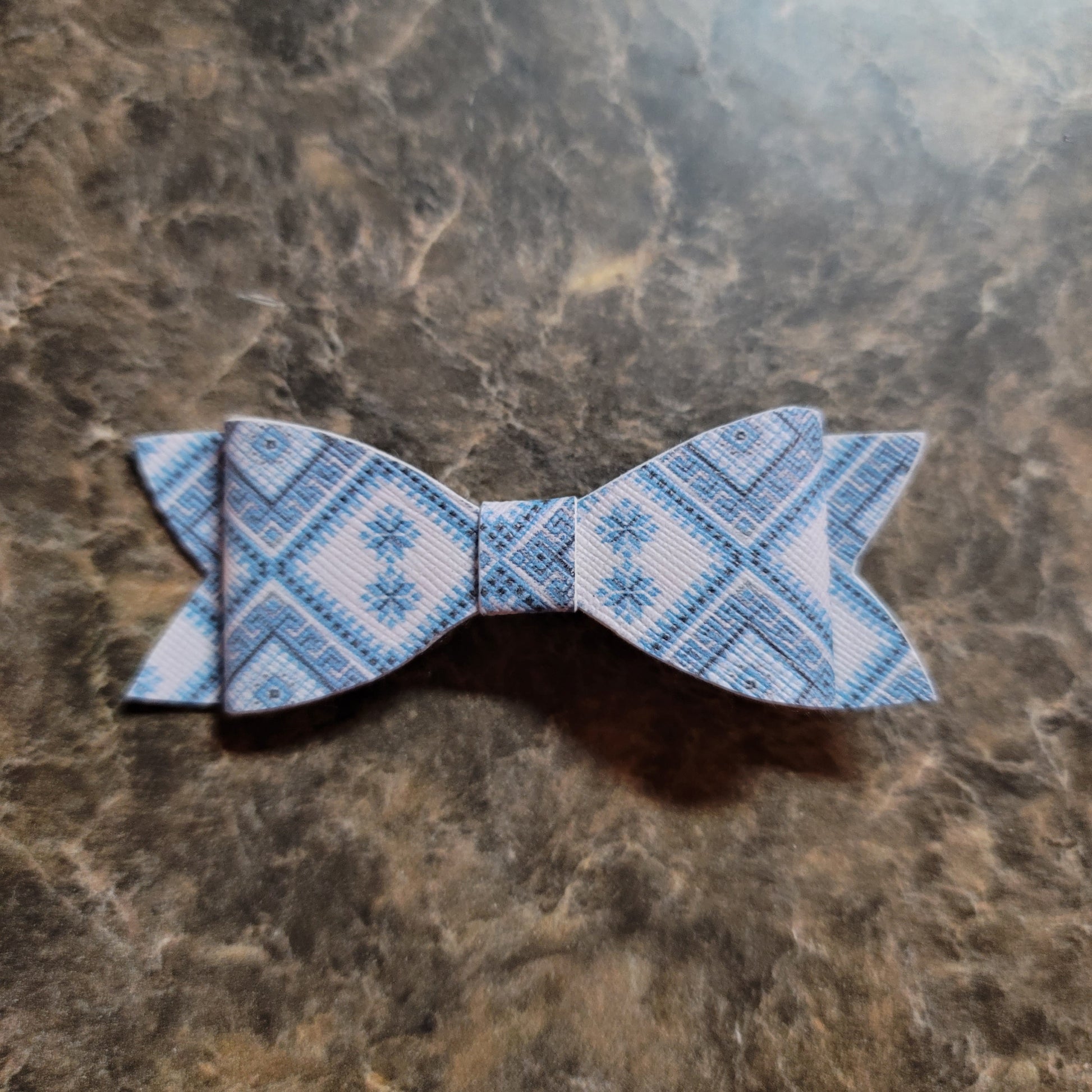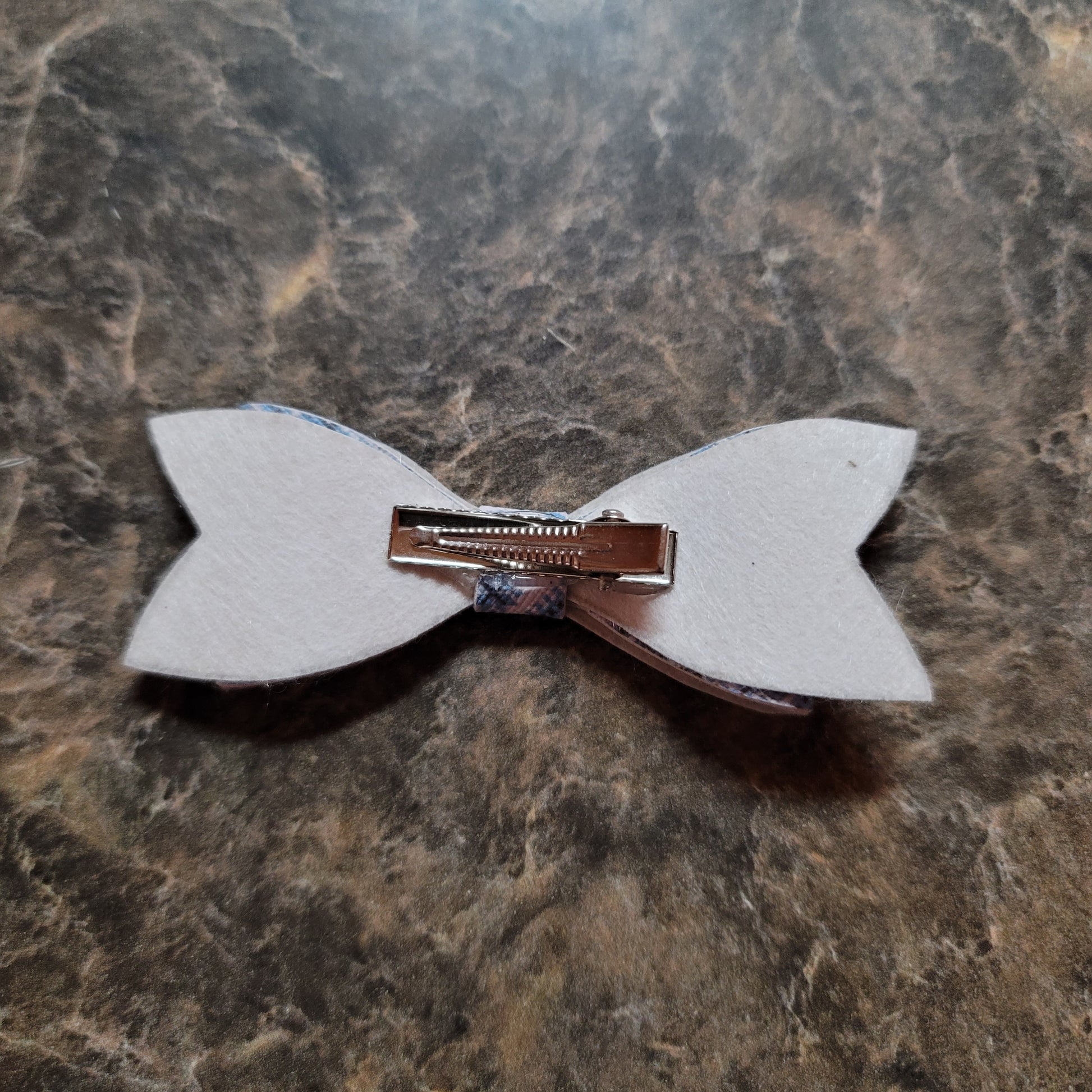 Blue Nordic print faux leather. Small bow secured on an alligator clip.
