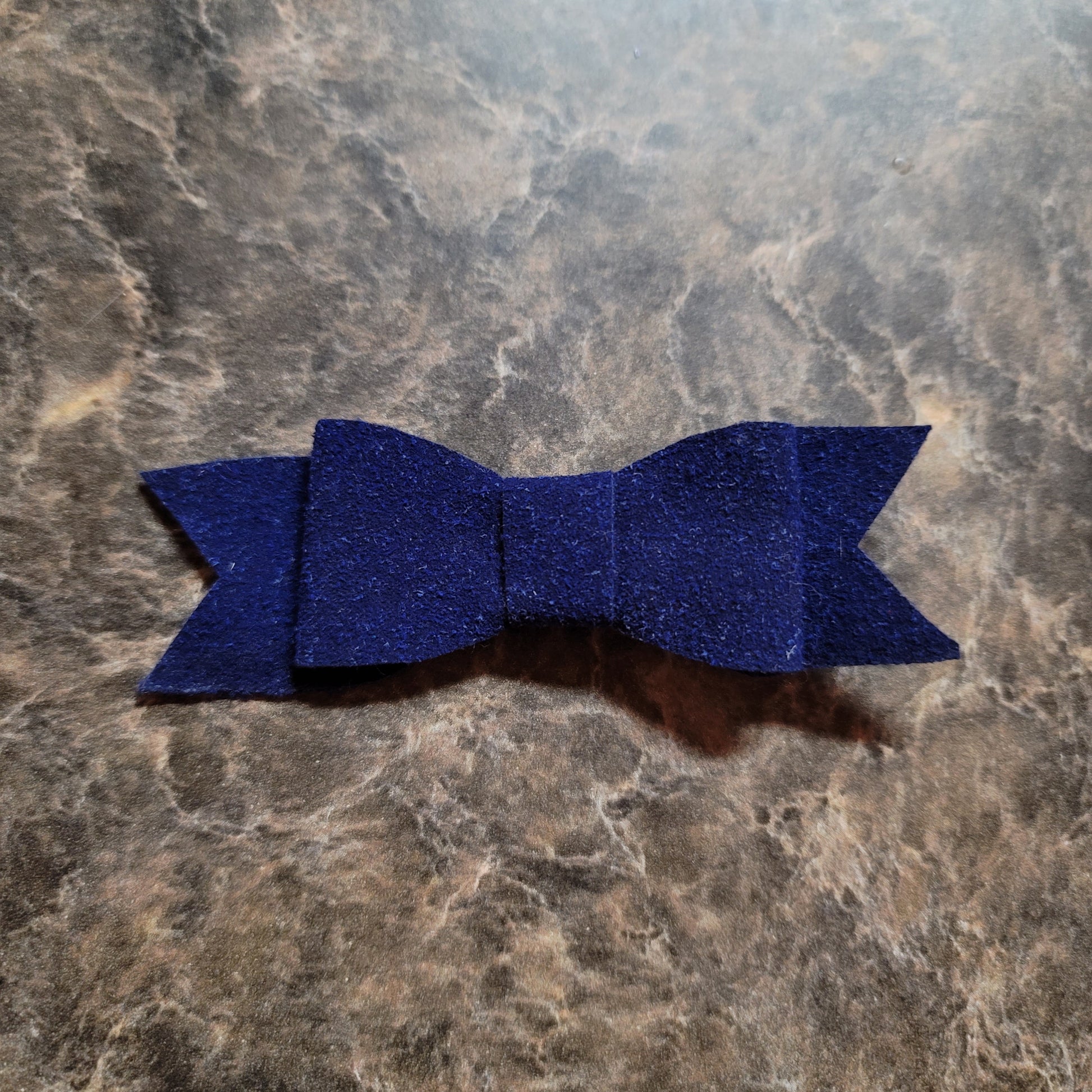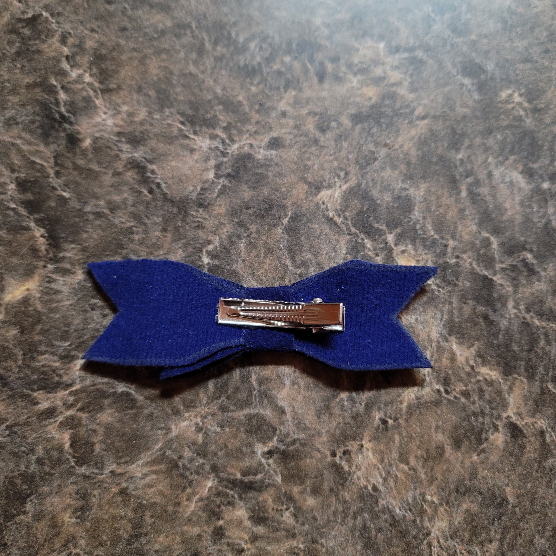 Blur velour material with soft backing. Small bow secured to an alligator clip.