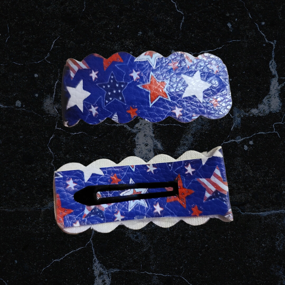 Blue with stars faux leather material secured on a 2 inch snap clip.