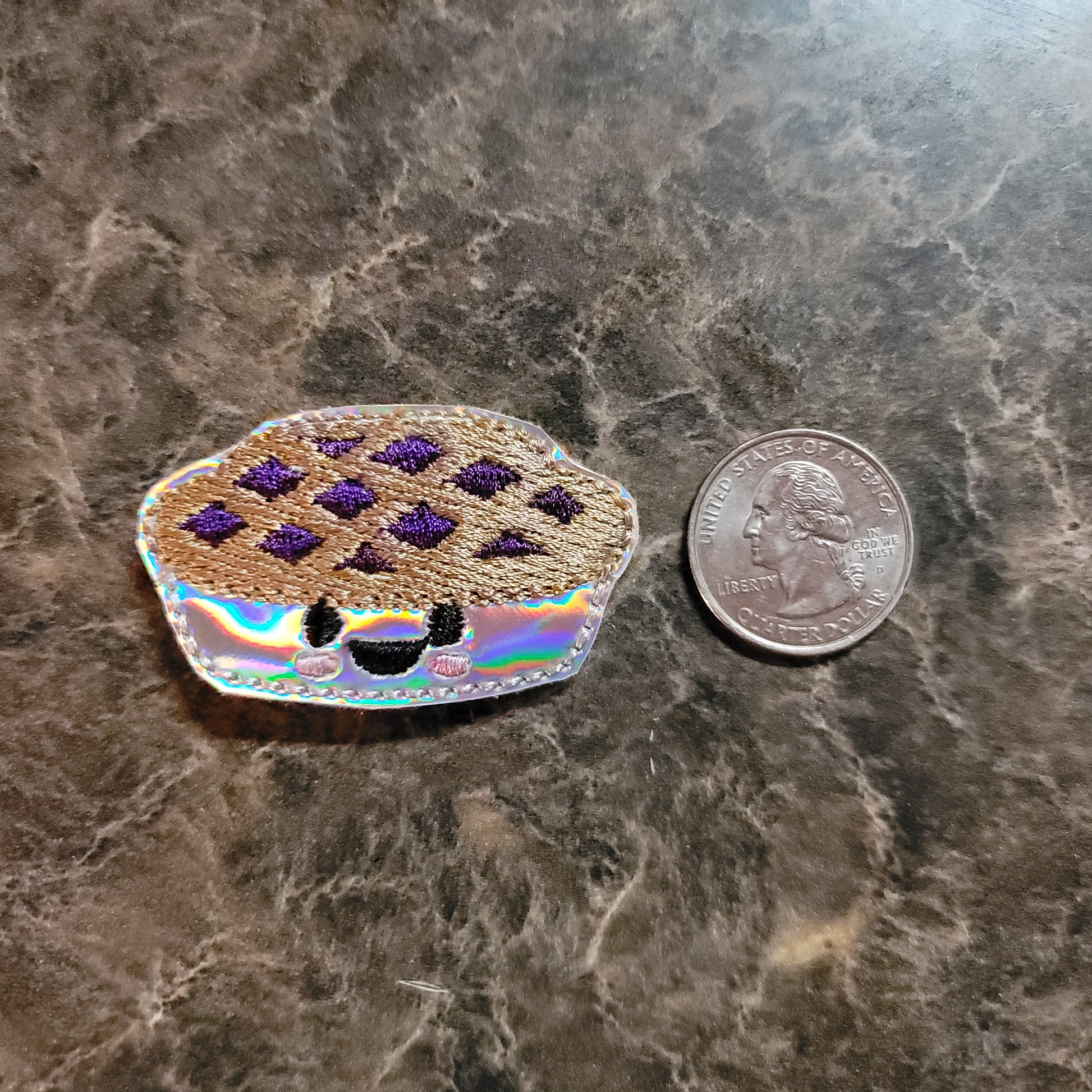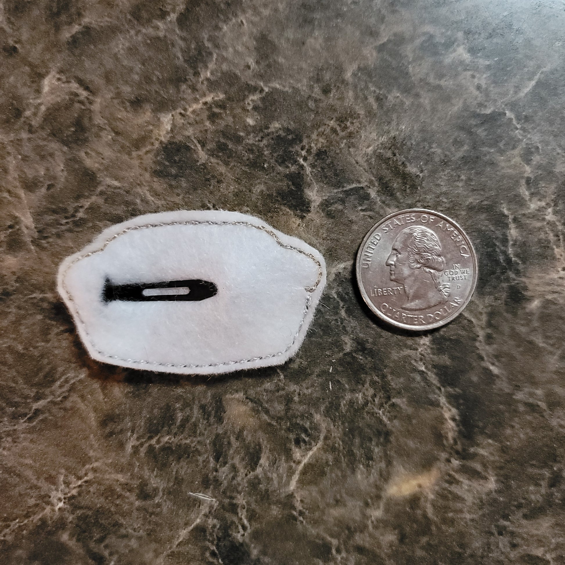 Bottom front of feltie is faux leather, secured on a 1.2 inch snap clip.