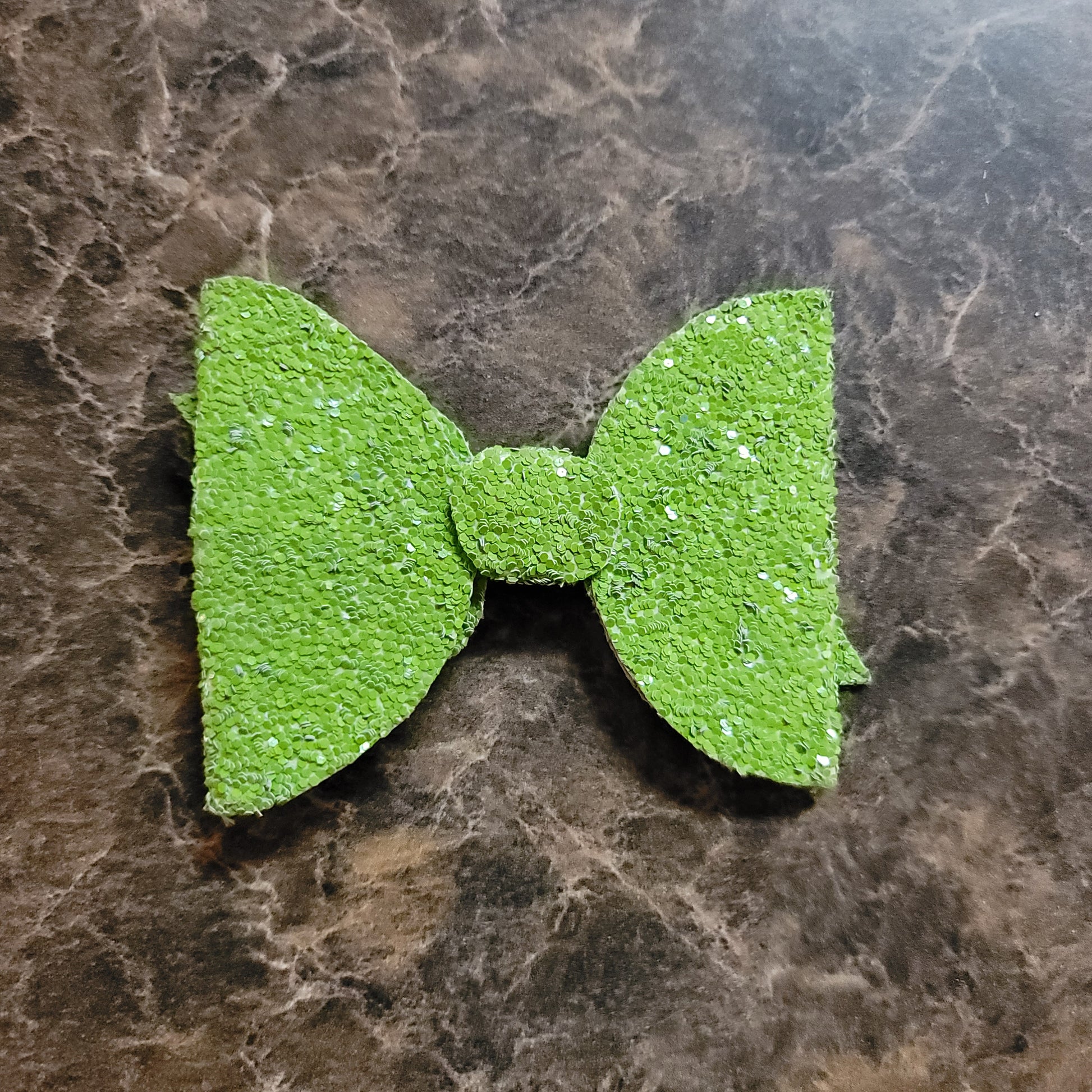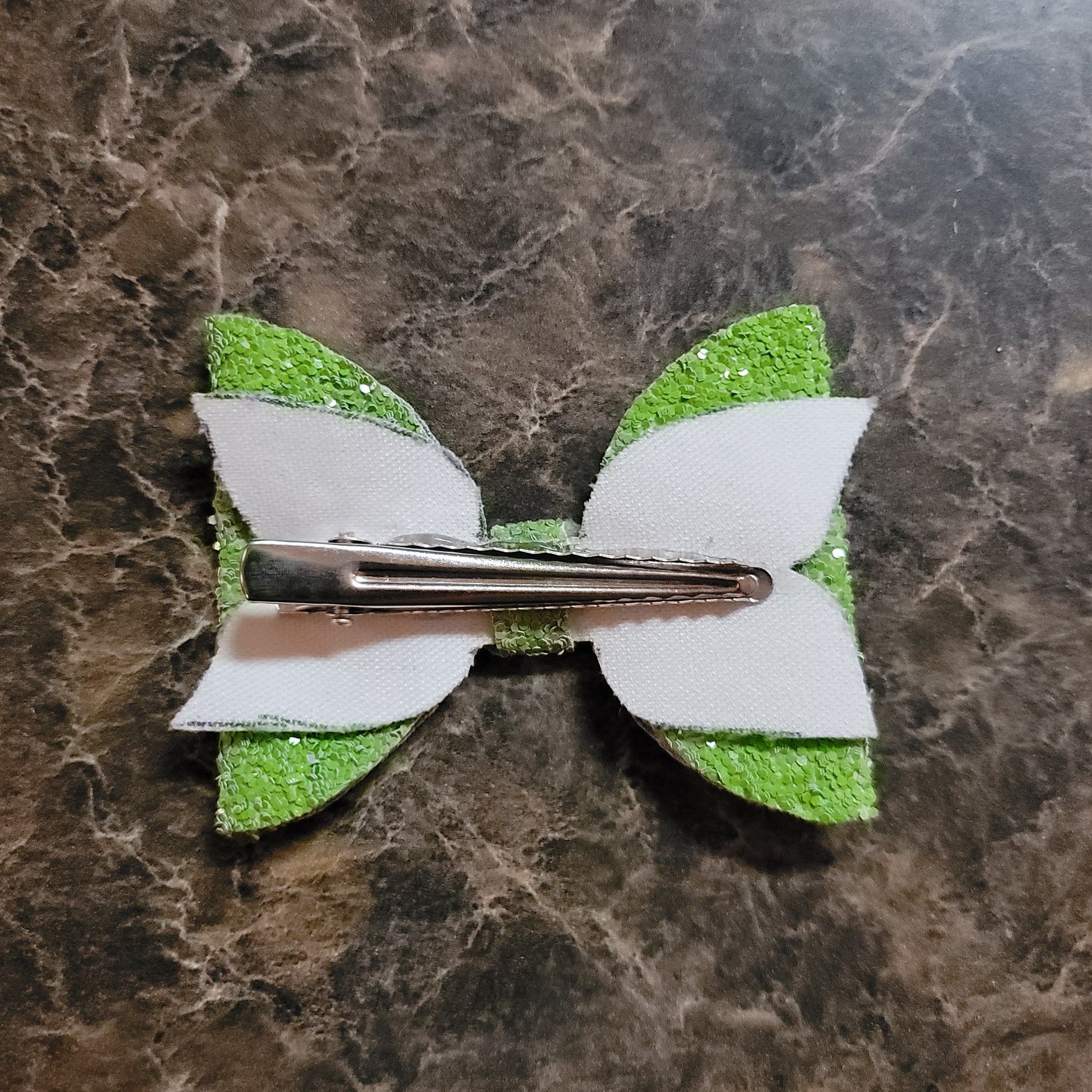 Bright green glitter material with soft backing. Medium bow secured on an alligator clip.