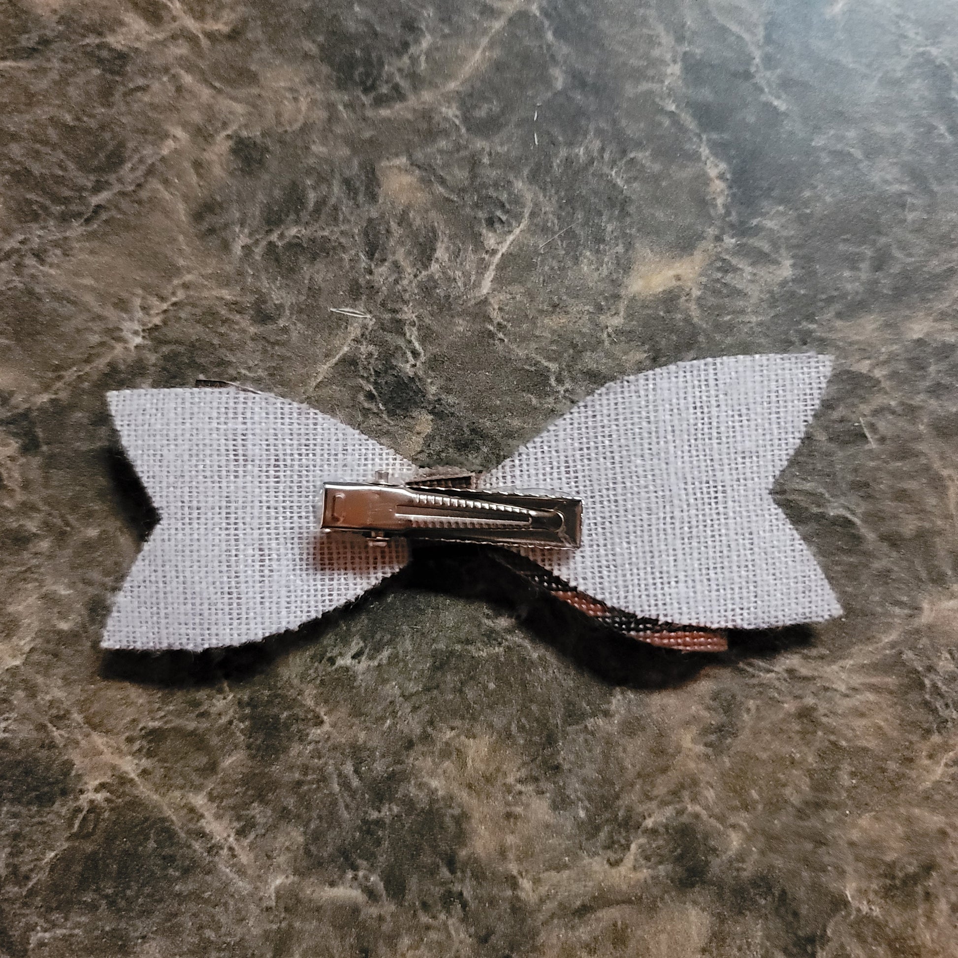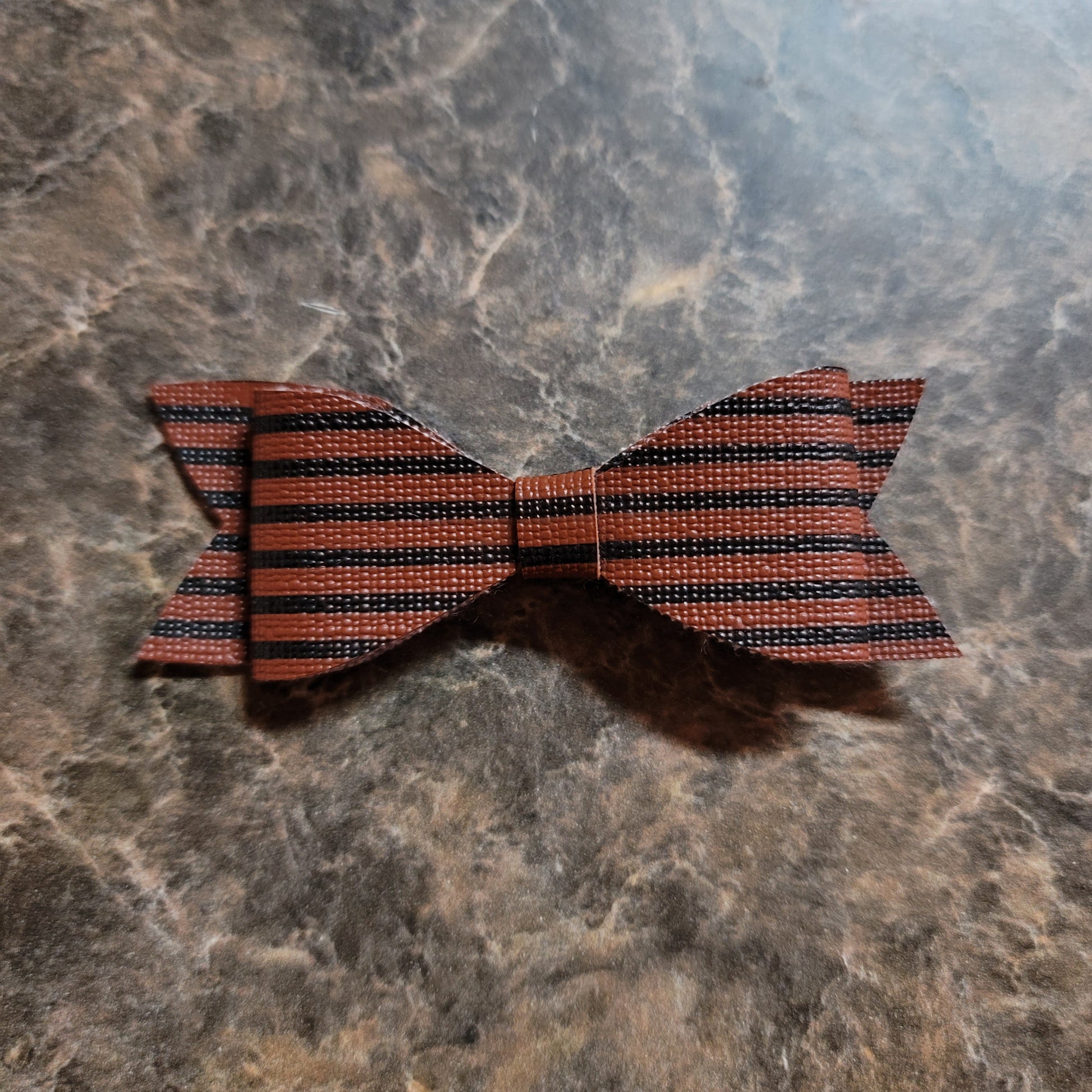 Brown and black stripe faux leather. Small bow secured on an alligator clip.