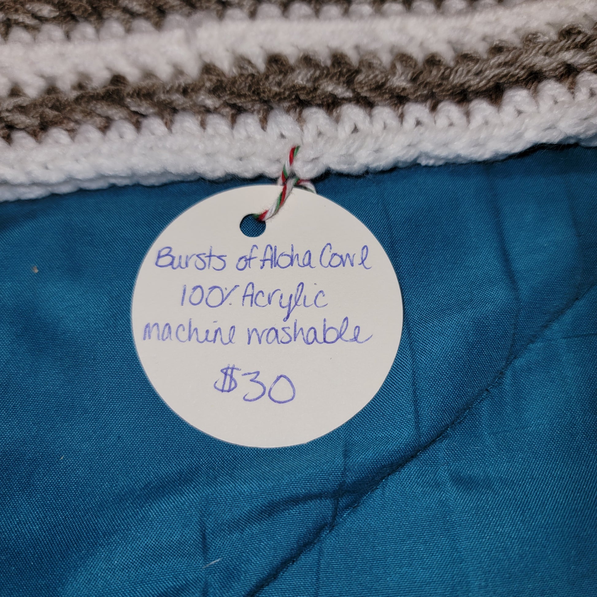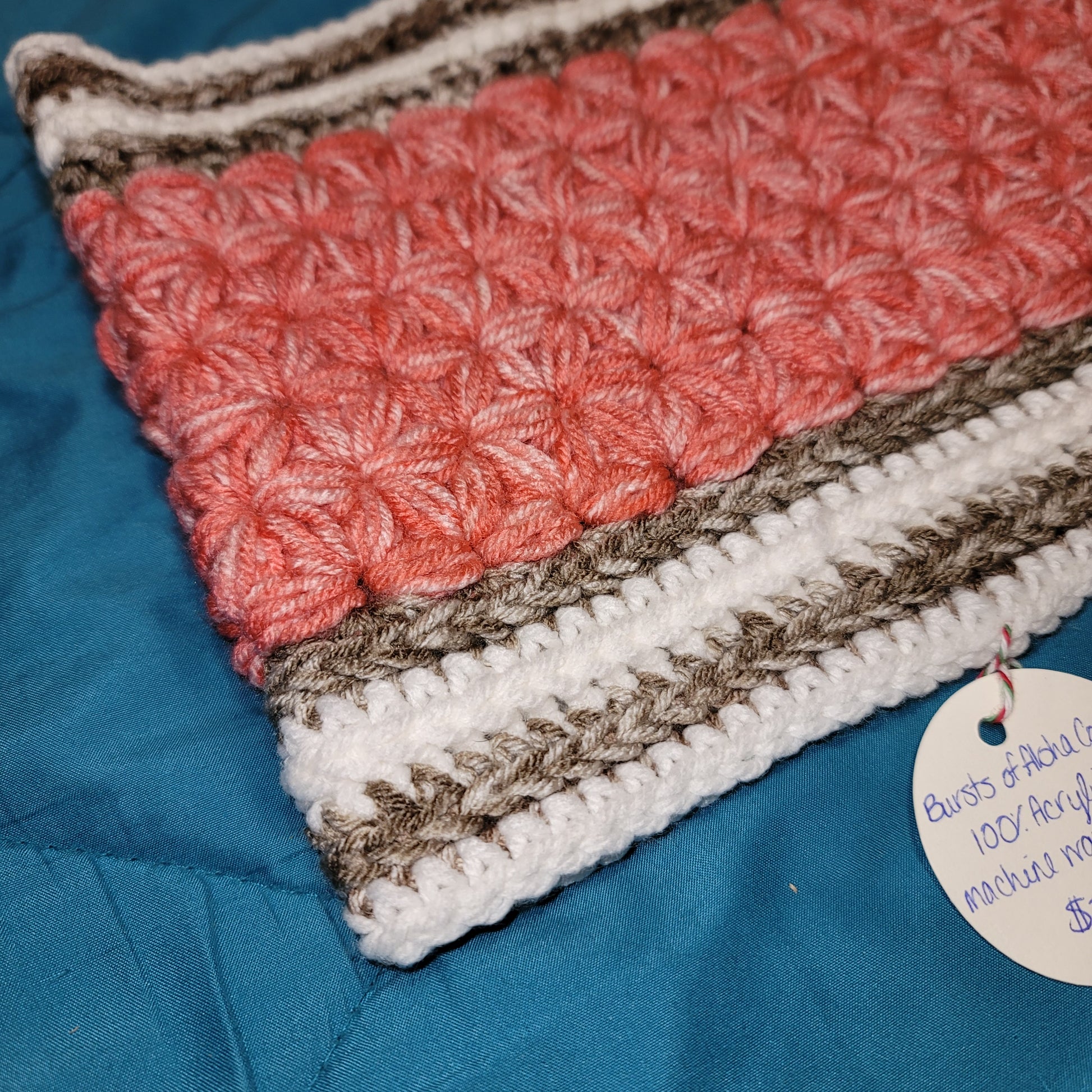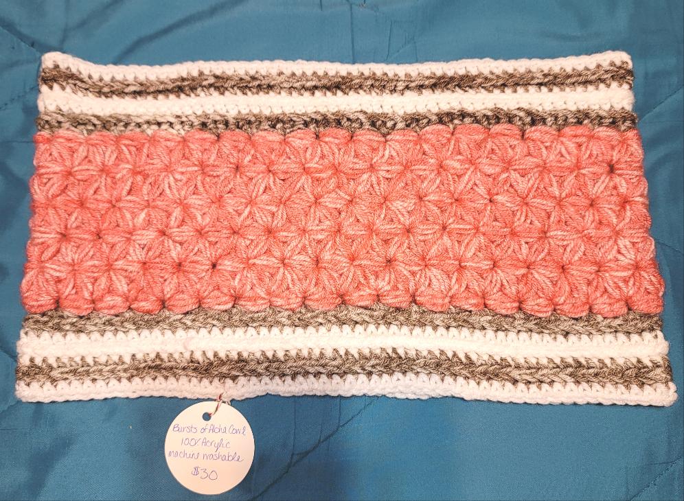 Cowl measures 14 Inches wide laying fat and is 8 inches tall. Cowl features the star stitch.