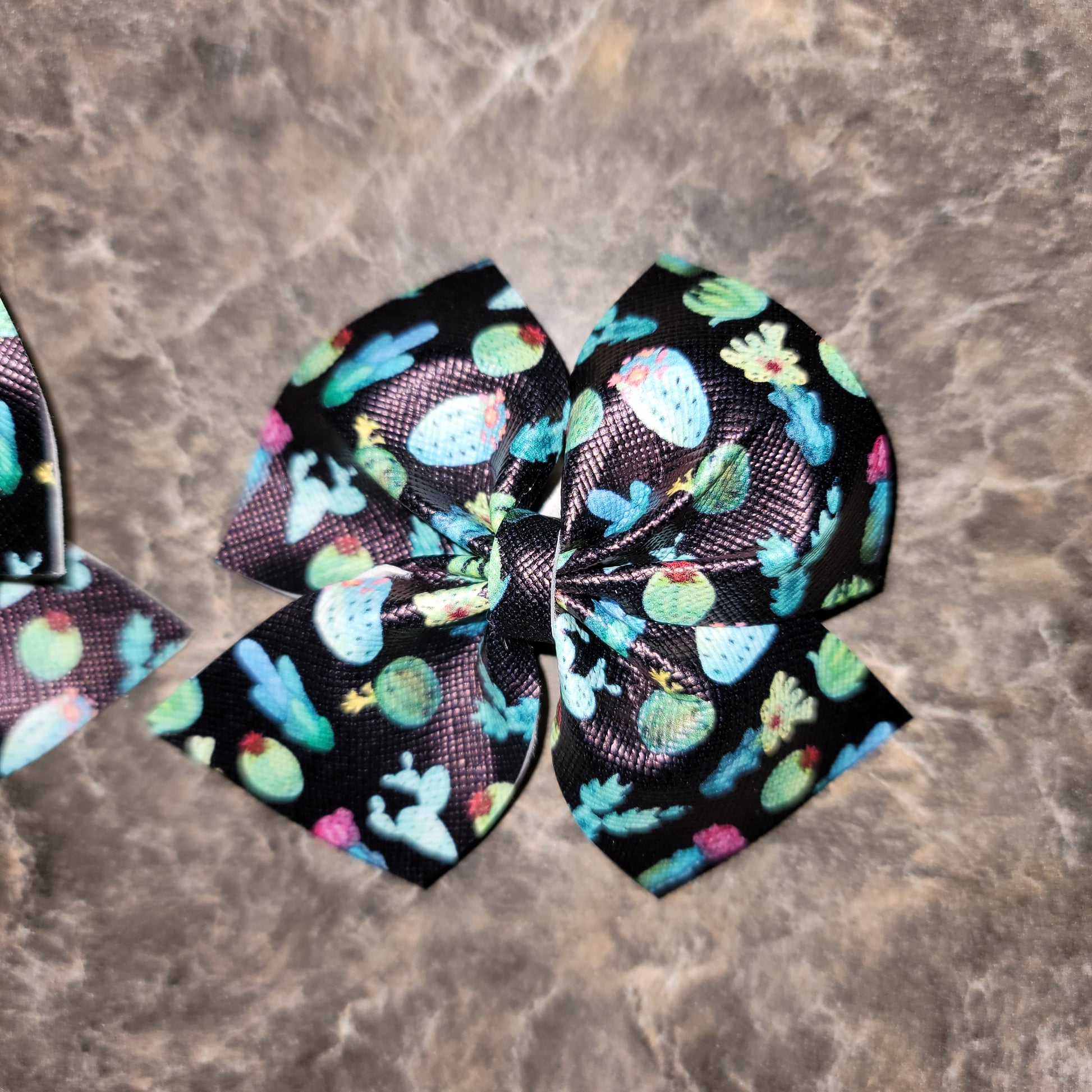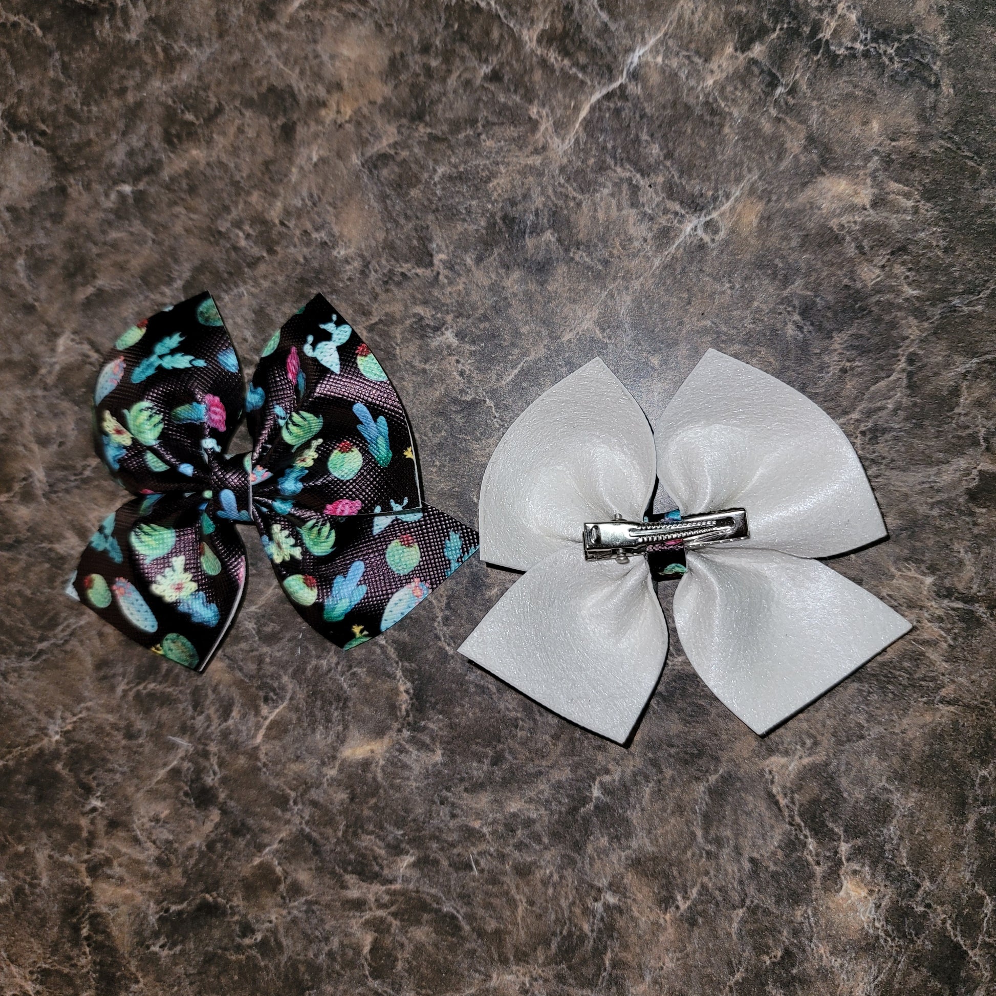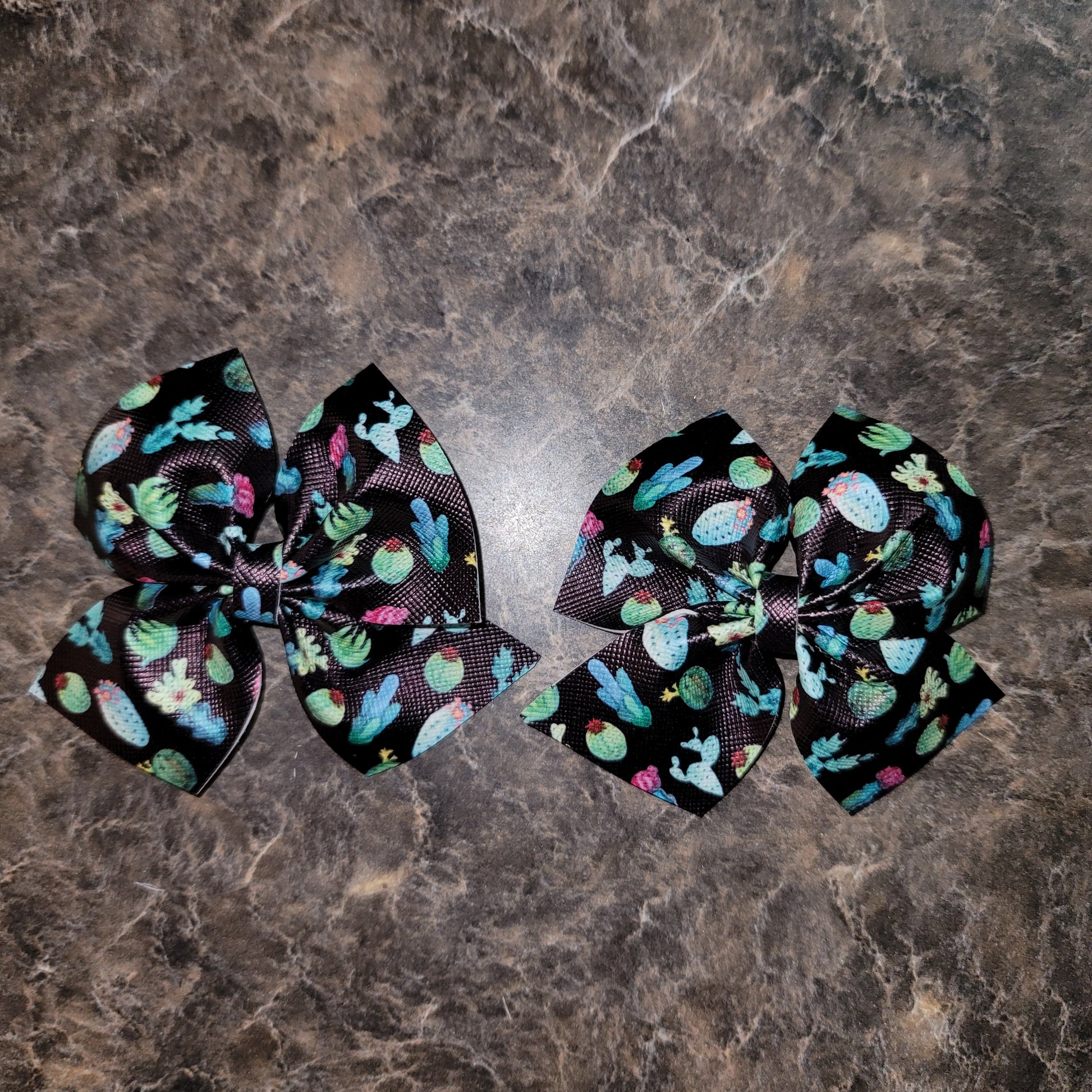 Cactus print faux leather. Medium bows secured on alligator clips.