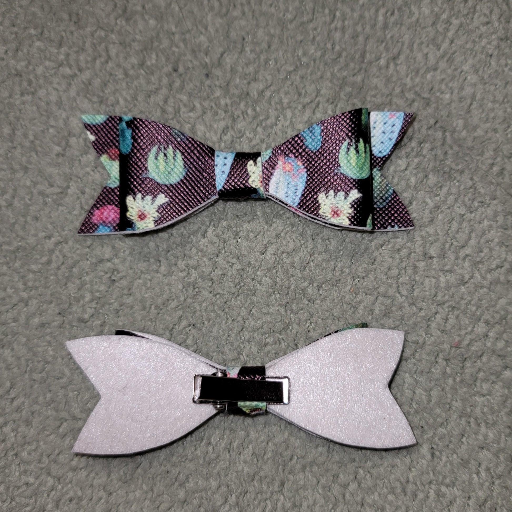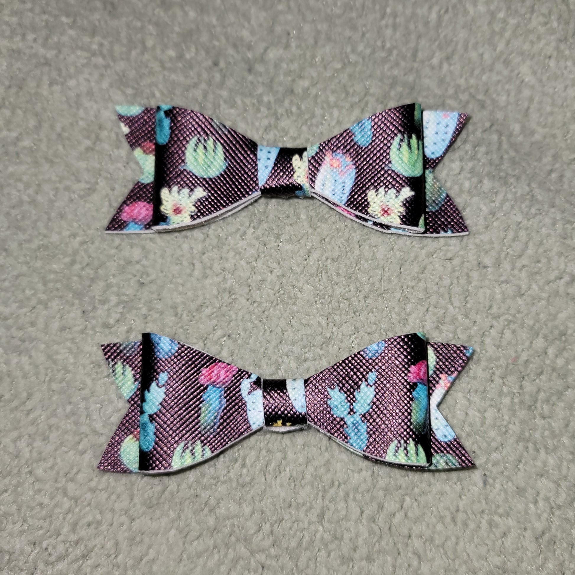 Cactus print faux leather. Mini bow set secured on alligator clips.