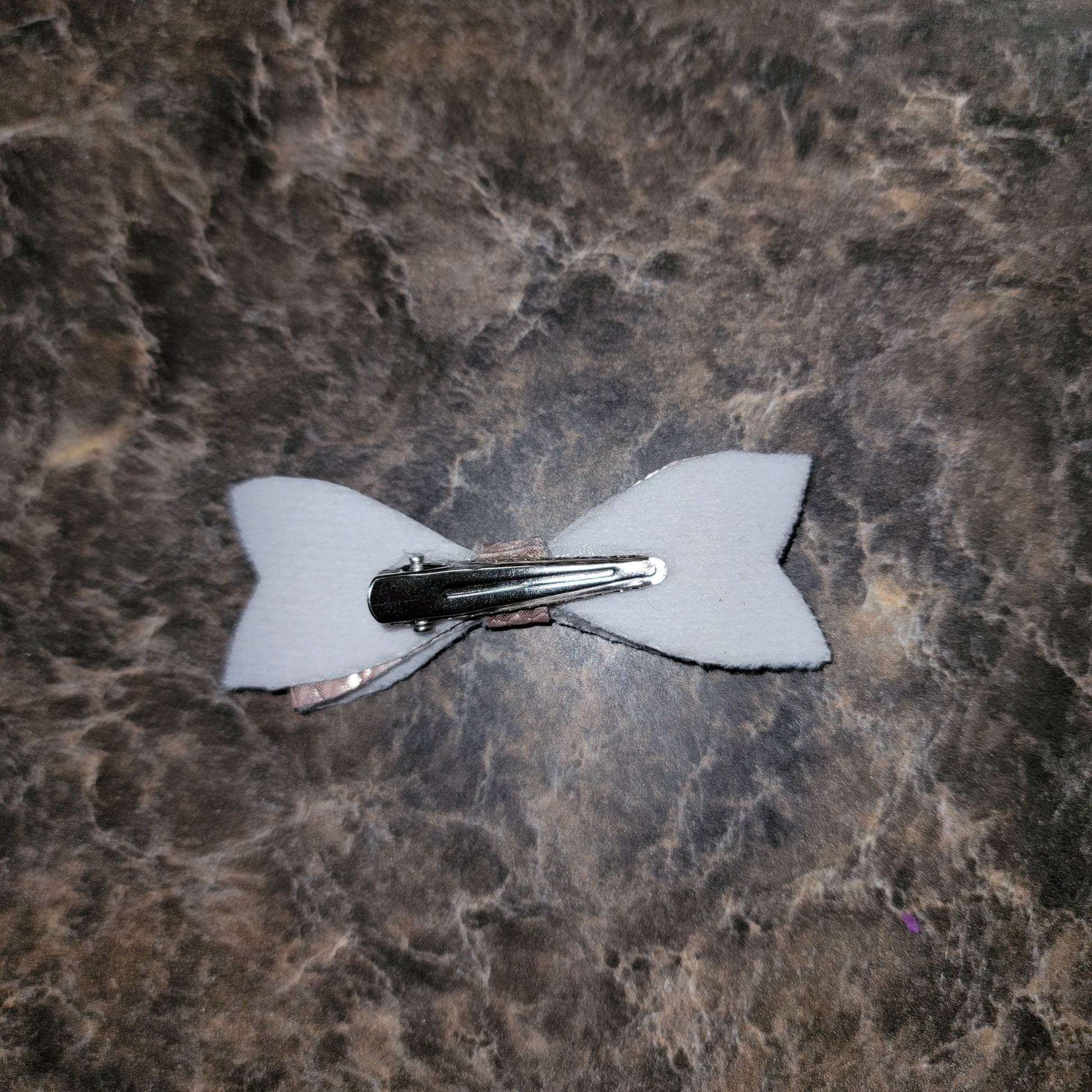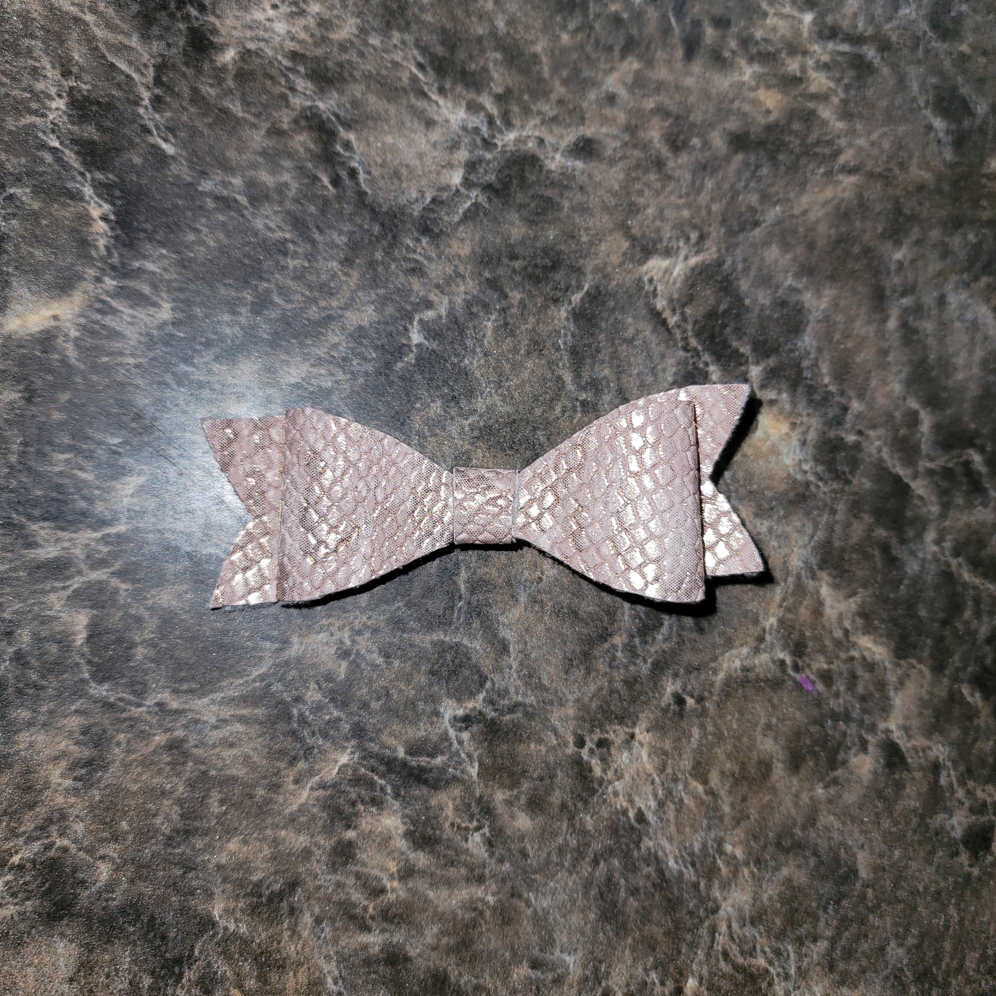 Champagne textured faux leather. Mini bow secured on an alligator.