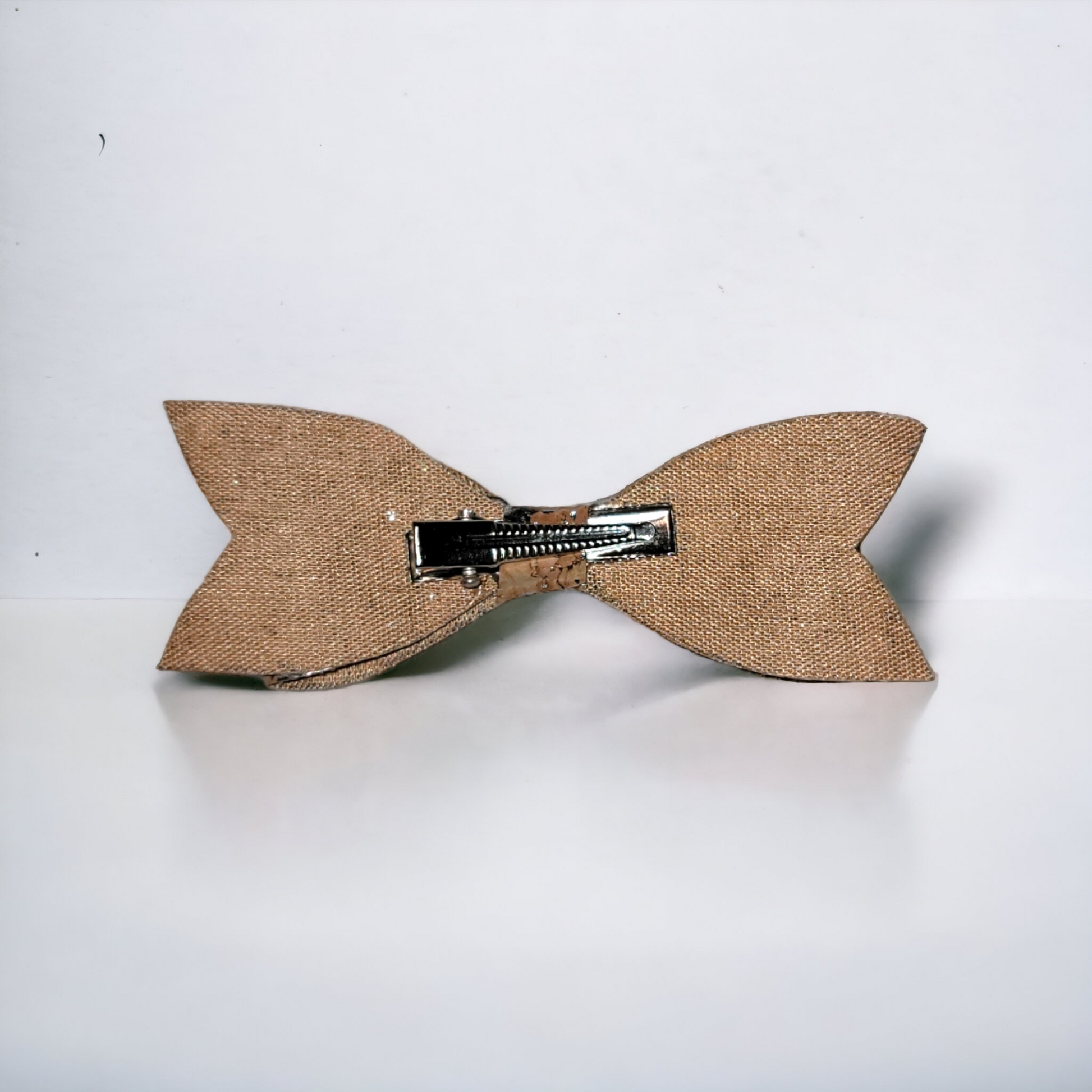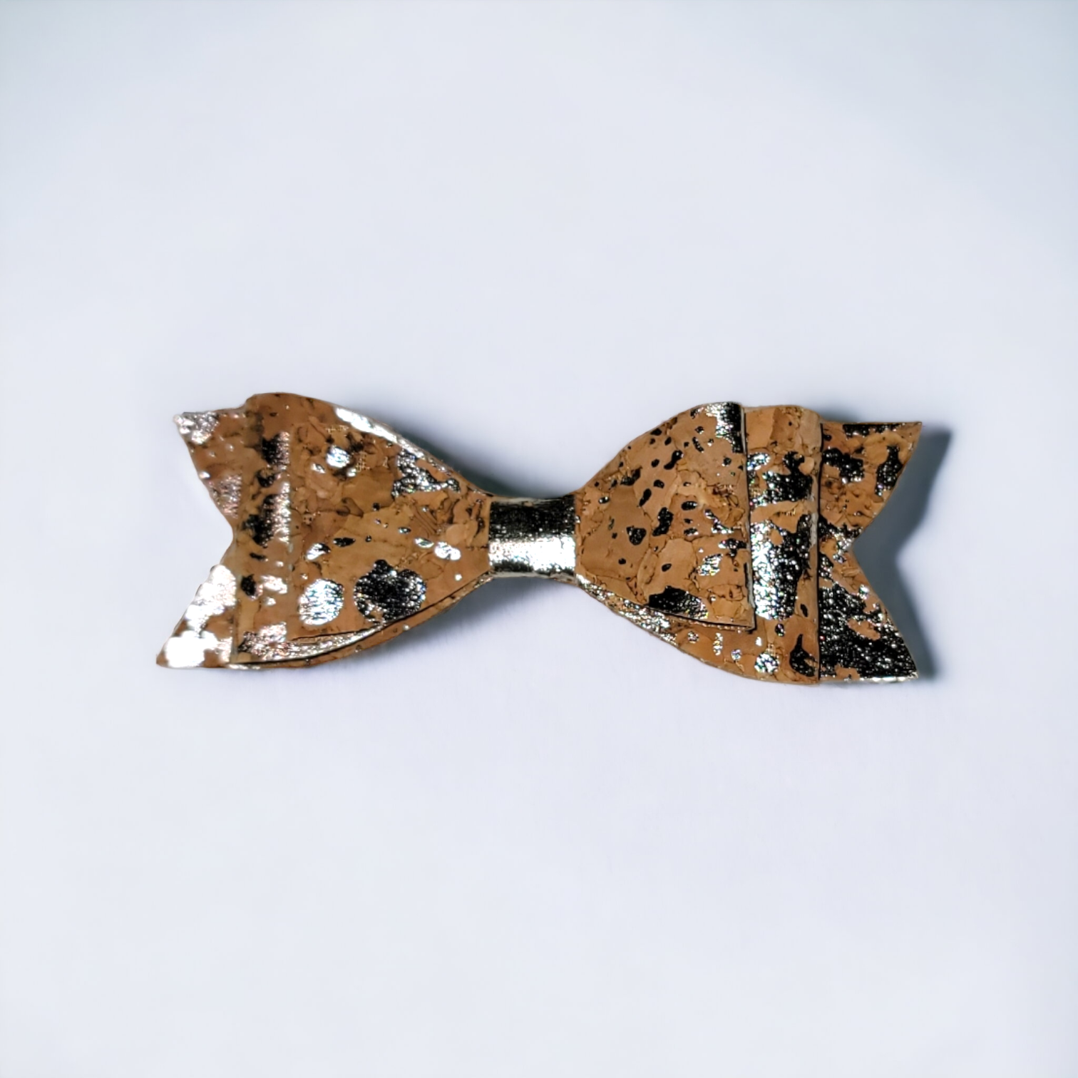 Cork and silver splatter print faux leather, small double stack bow secured on an alligator clip.