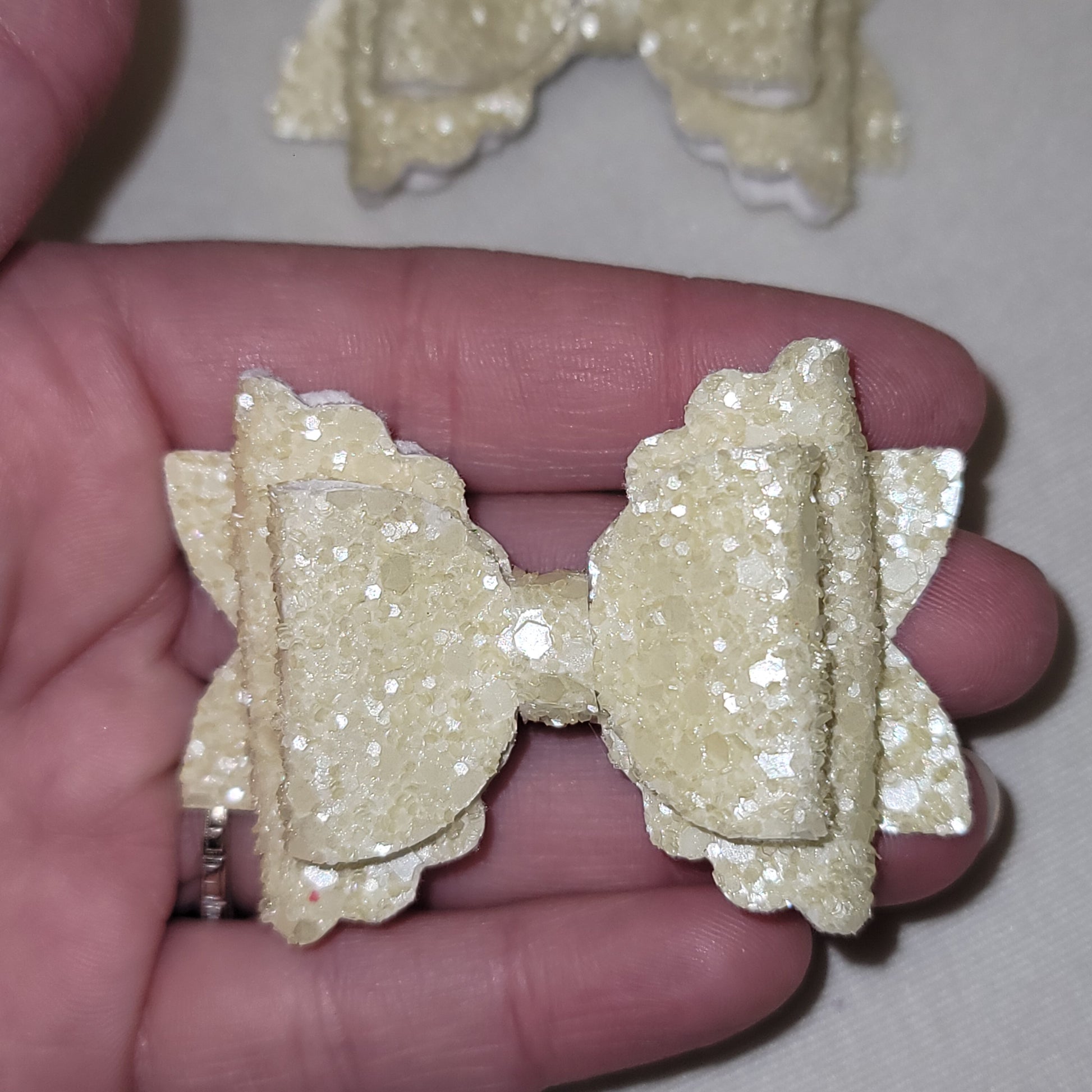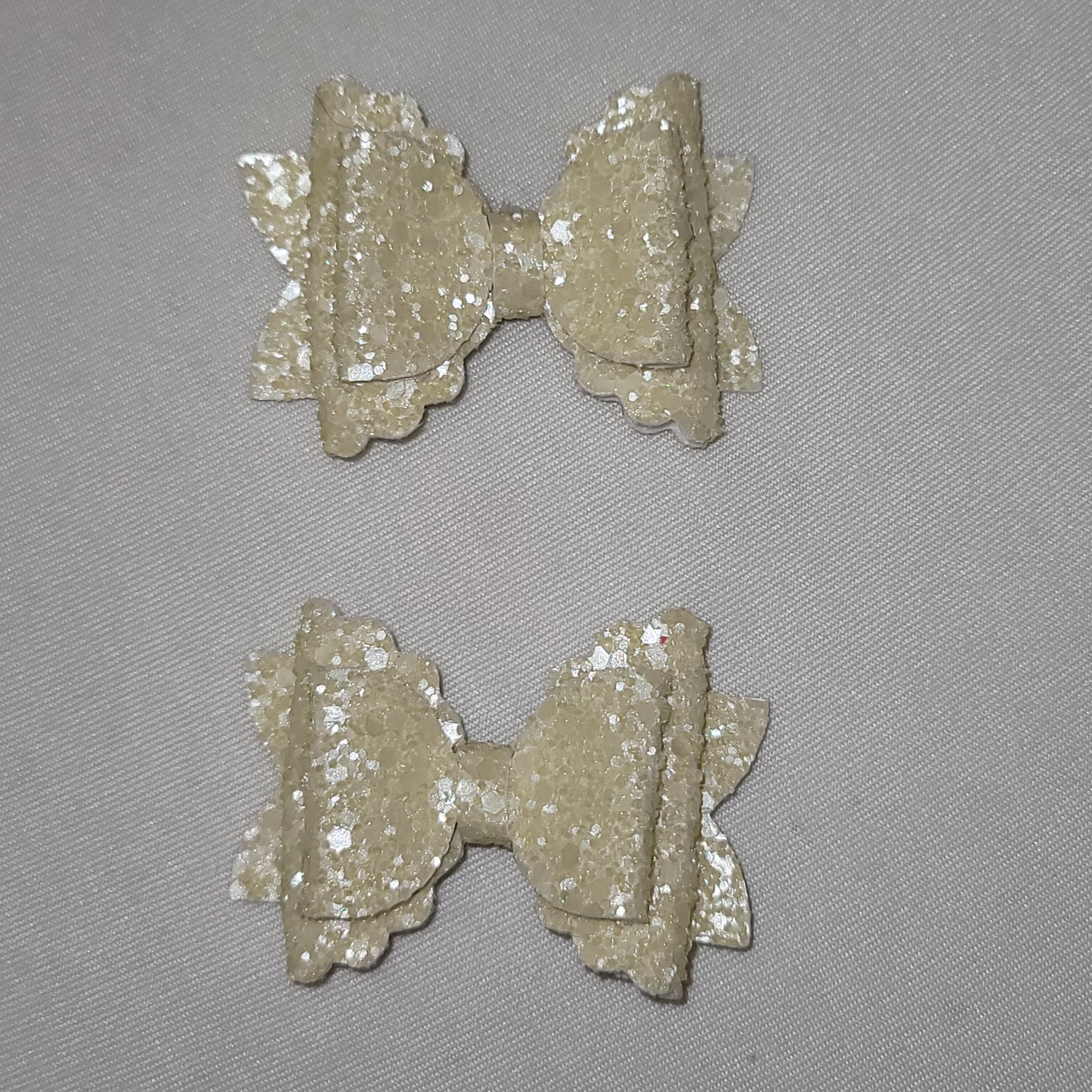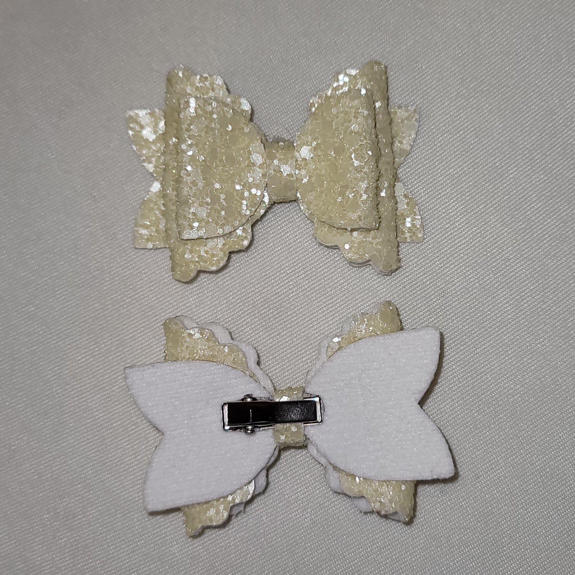 Cream colored chunky glitter material with soft backing. 2.5 piggy style bows secured on an alligator clip.