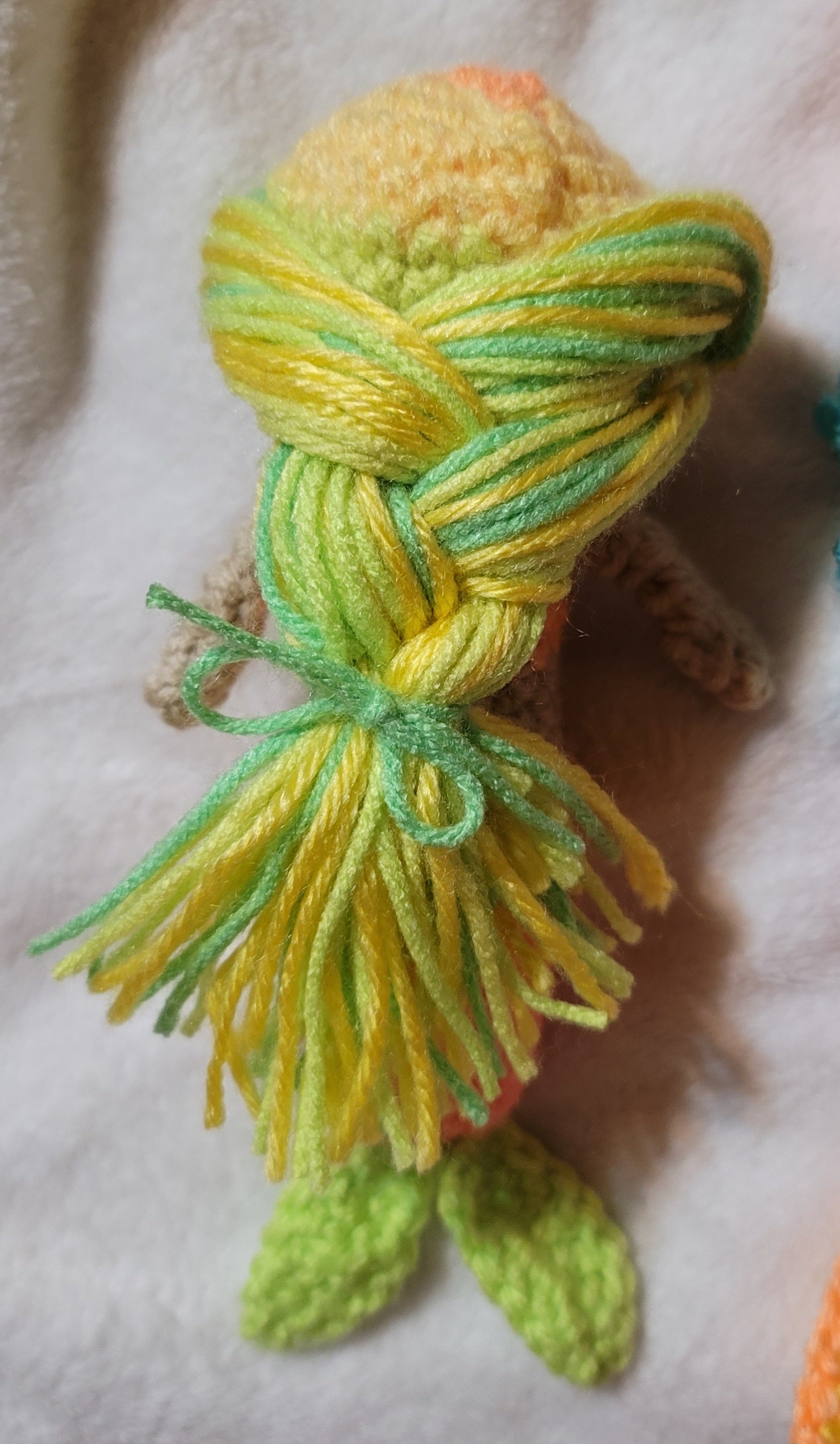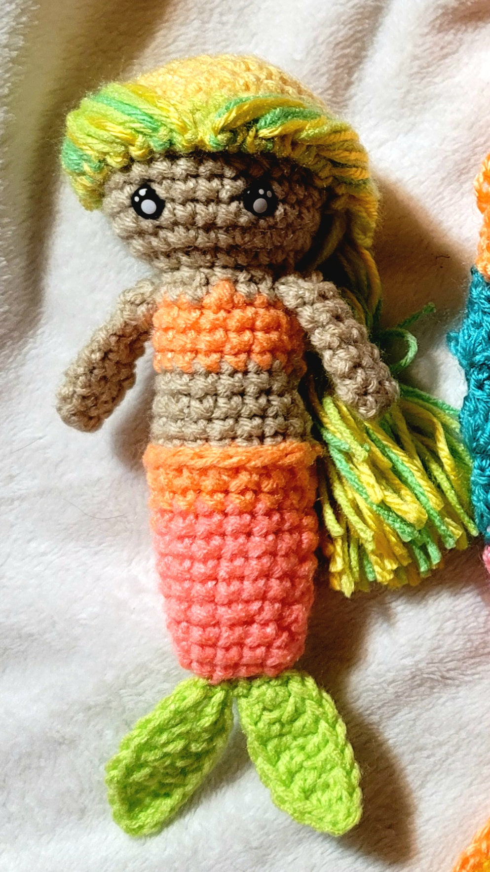 Mermaid measures 8 inches from head to tail. 100% acrylic yarn and has safety eyes. Machine wash gentle, lay flat to dry.