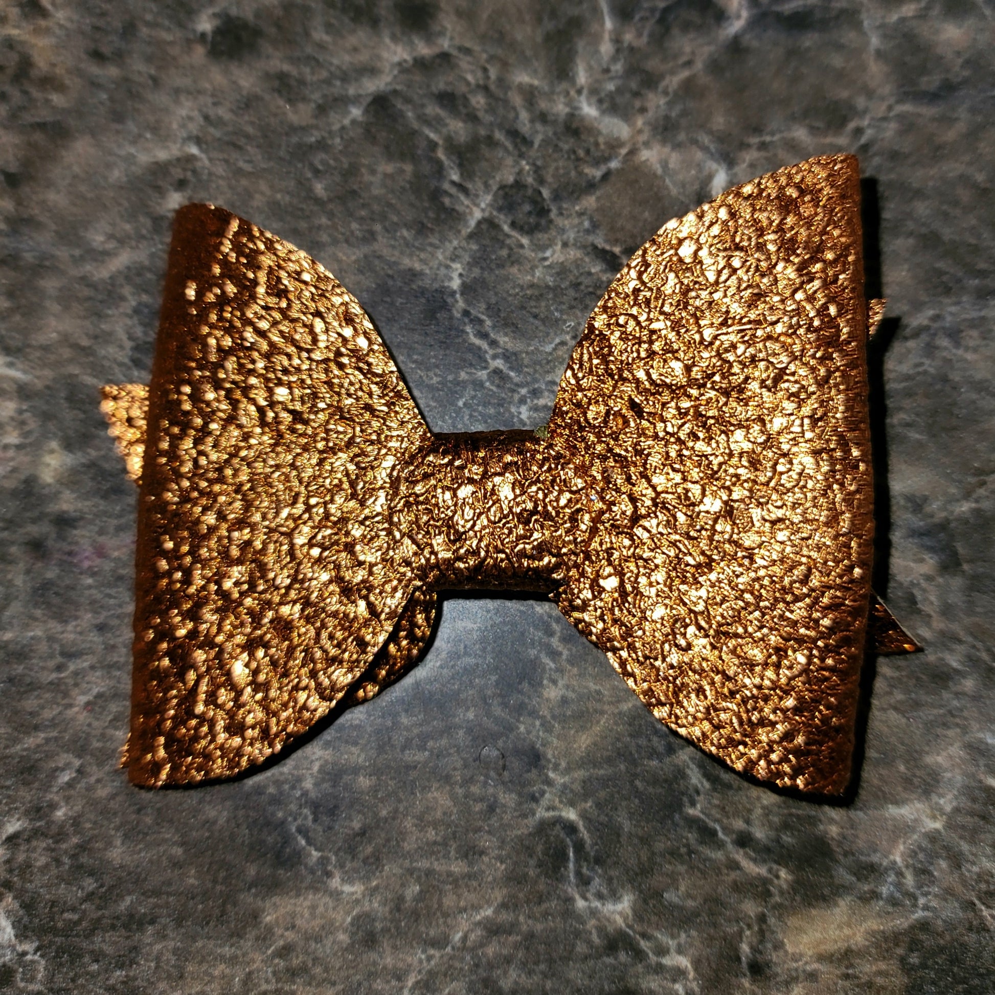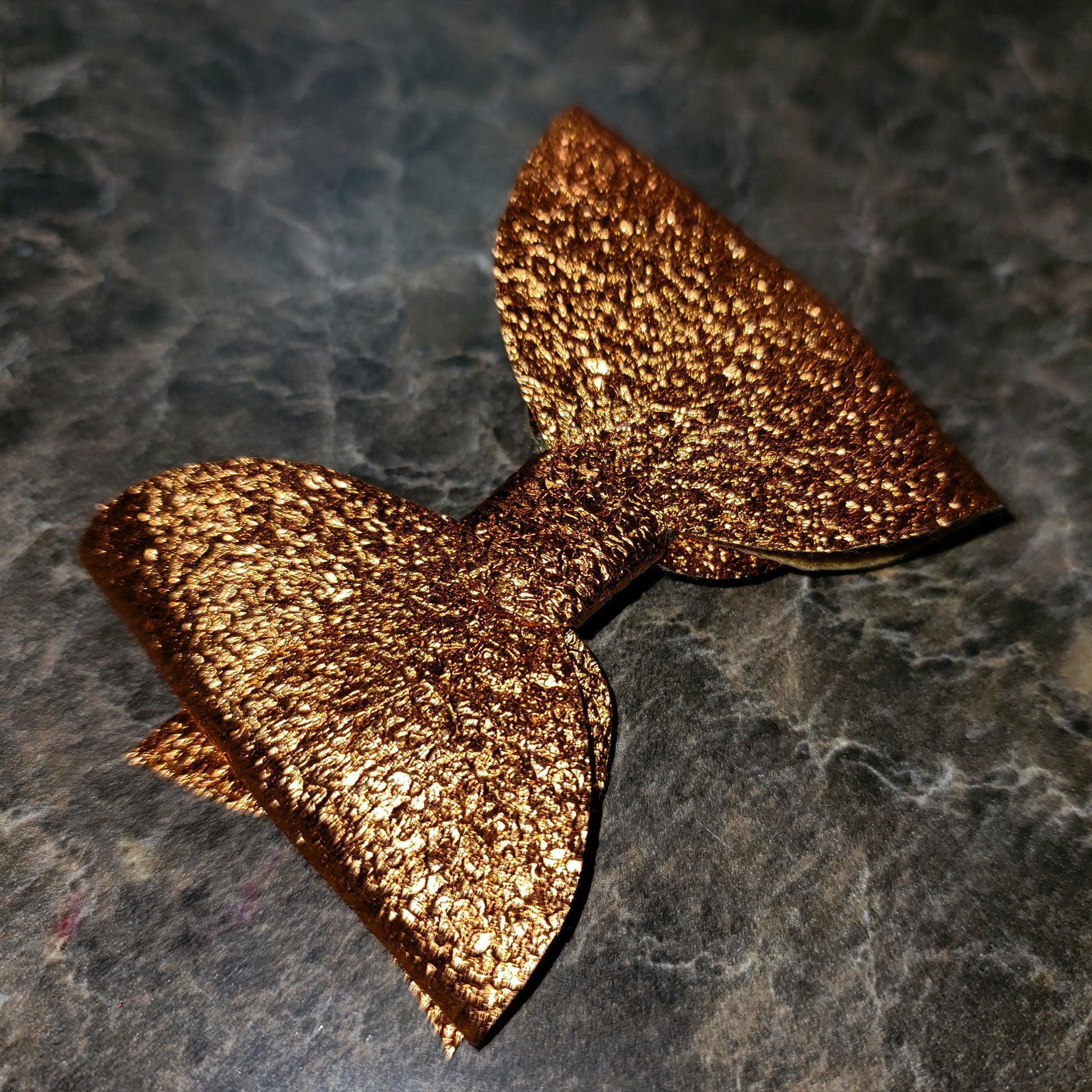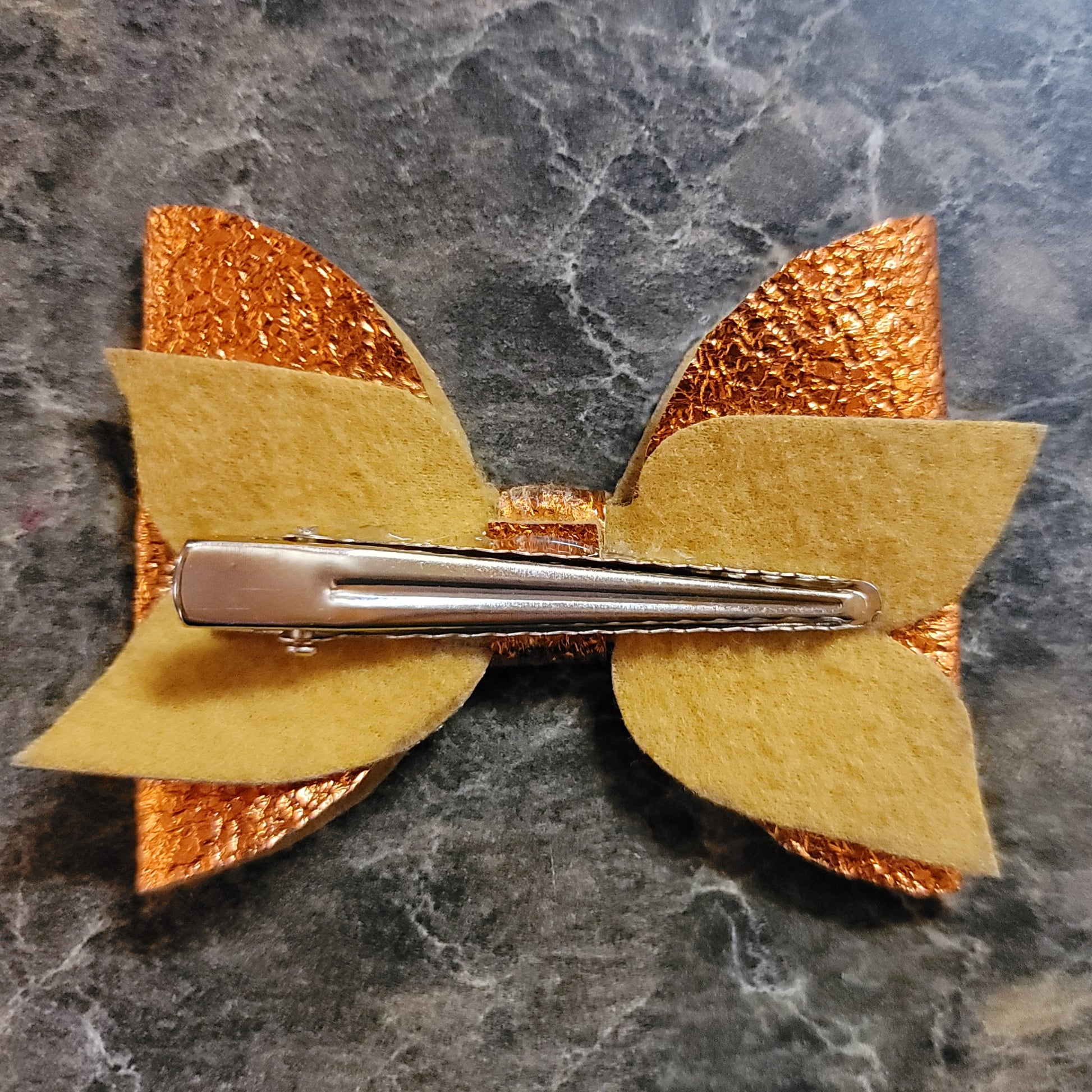 Dark orange metallic textured faux leather. Medium bow secured on an alligator clip.
