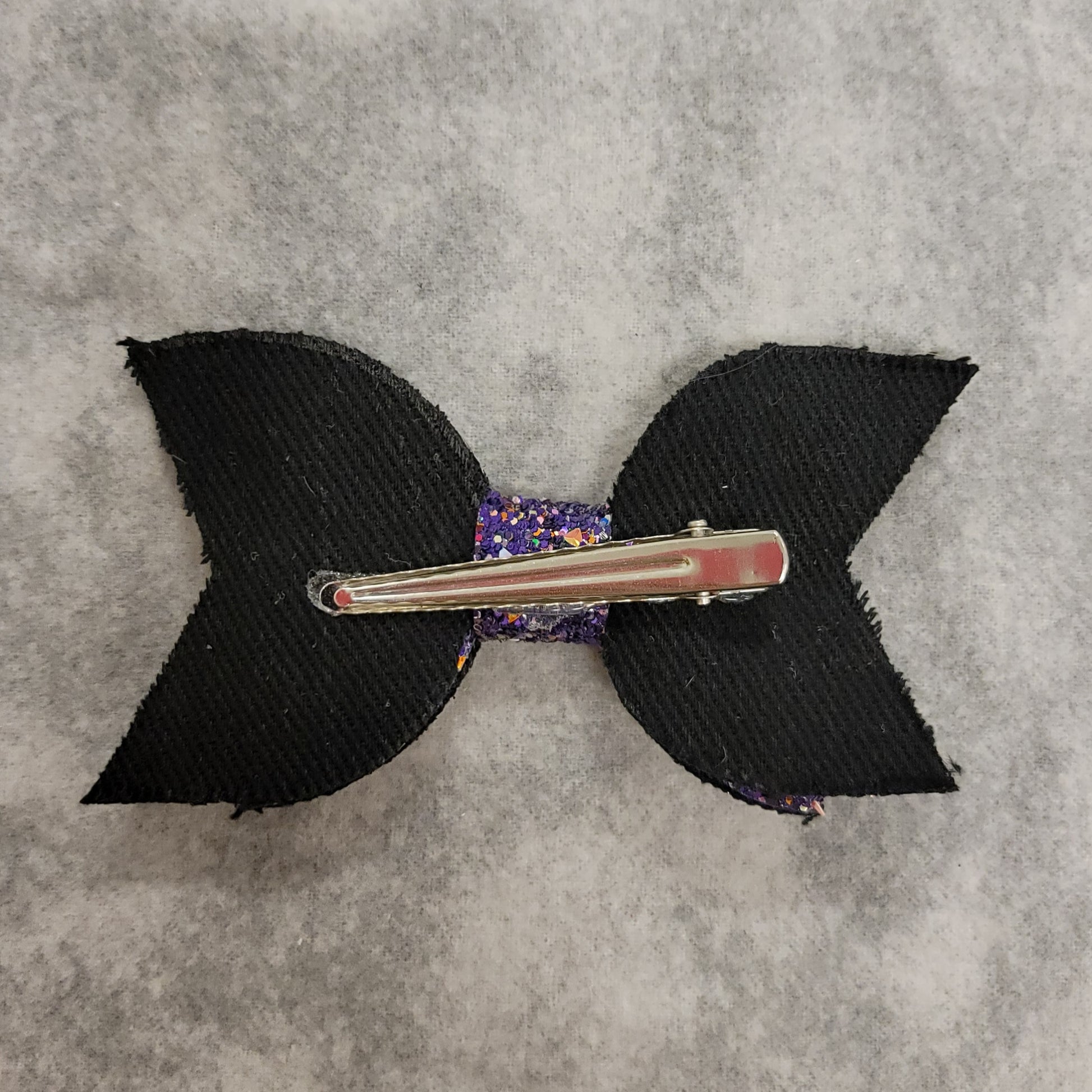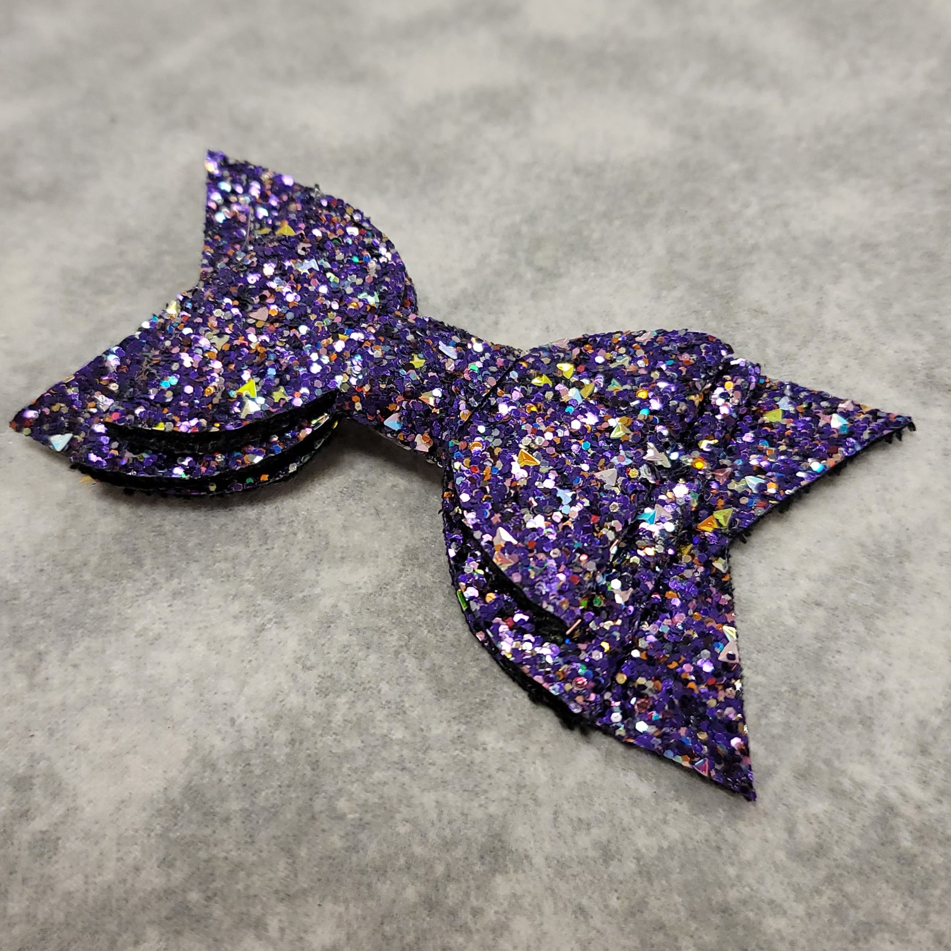 Dark purple with multicolor glitter material with soft backing. Double stack large bow secured on an alligator clip.