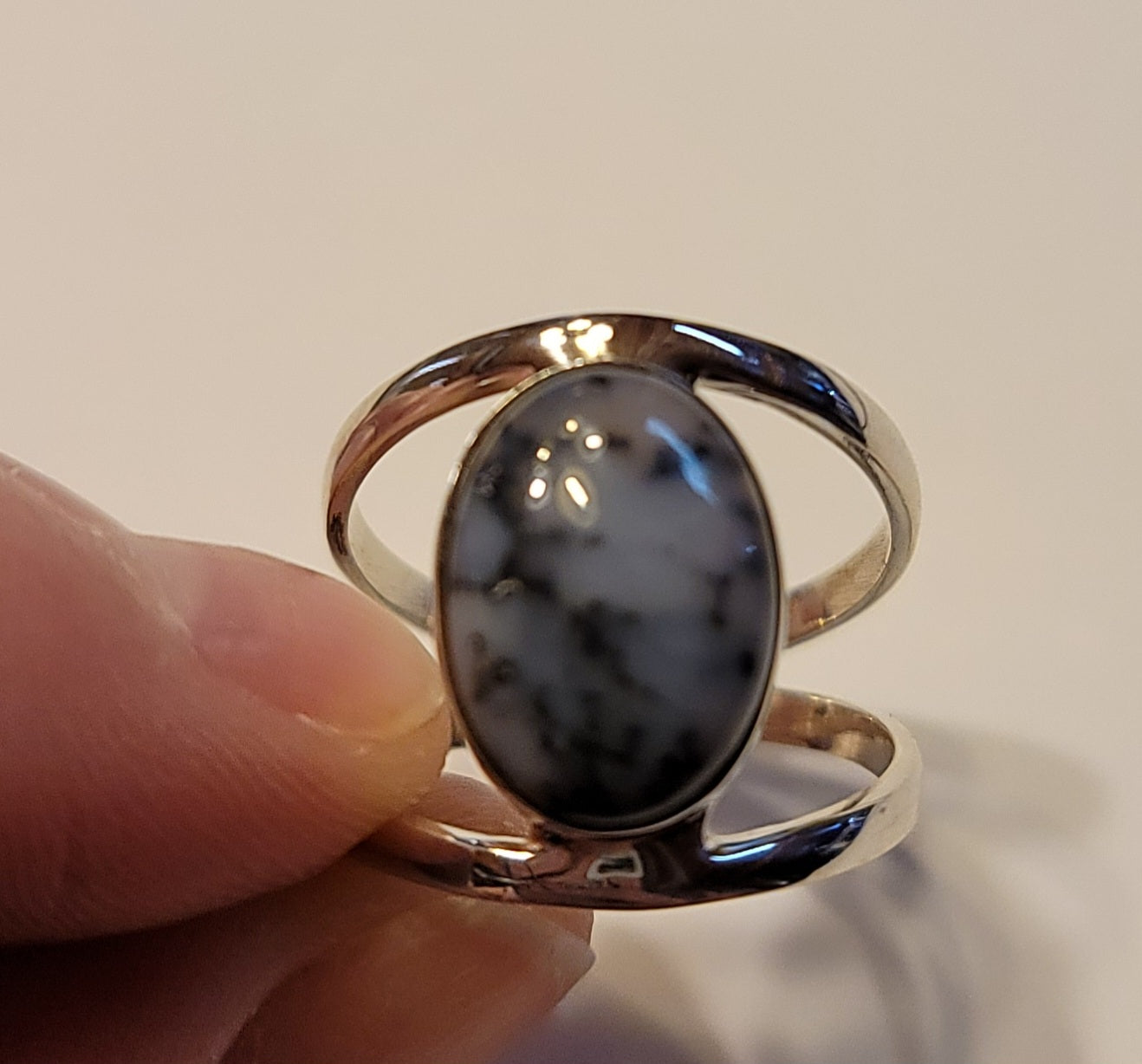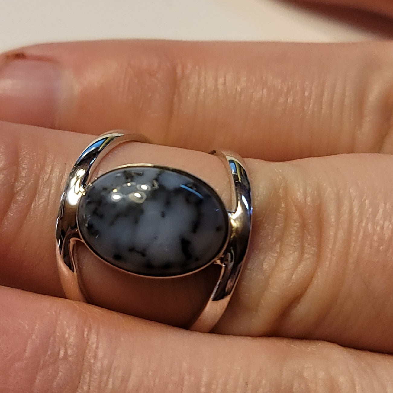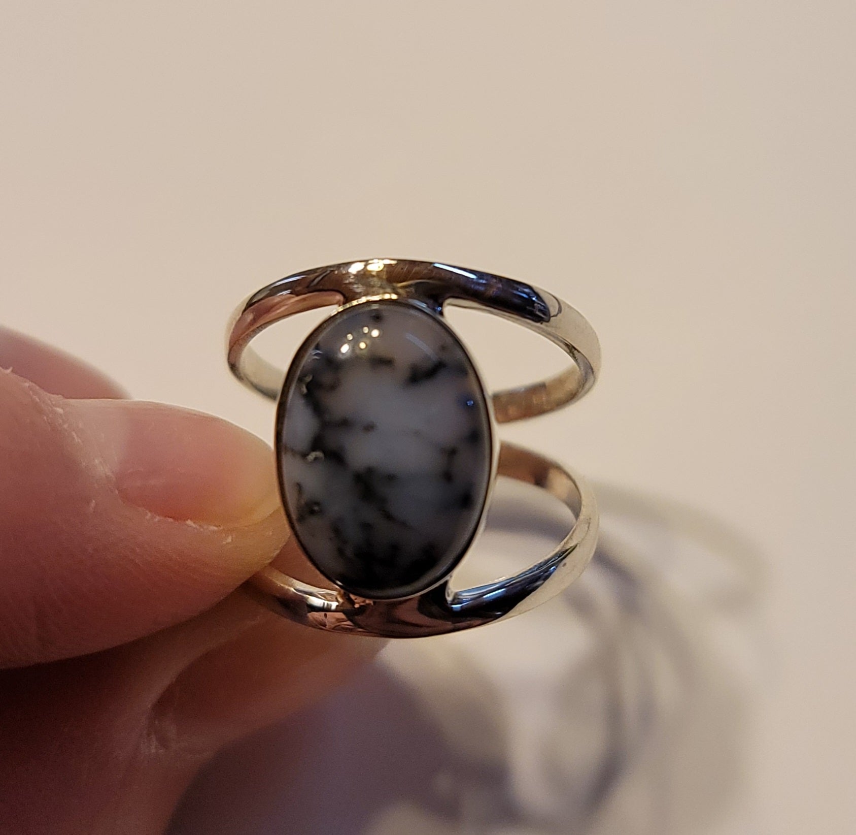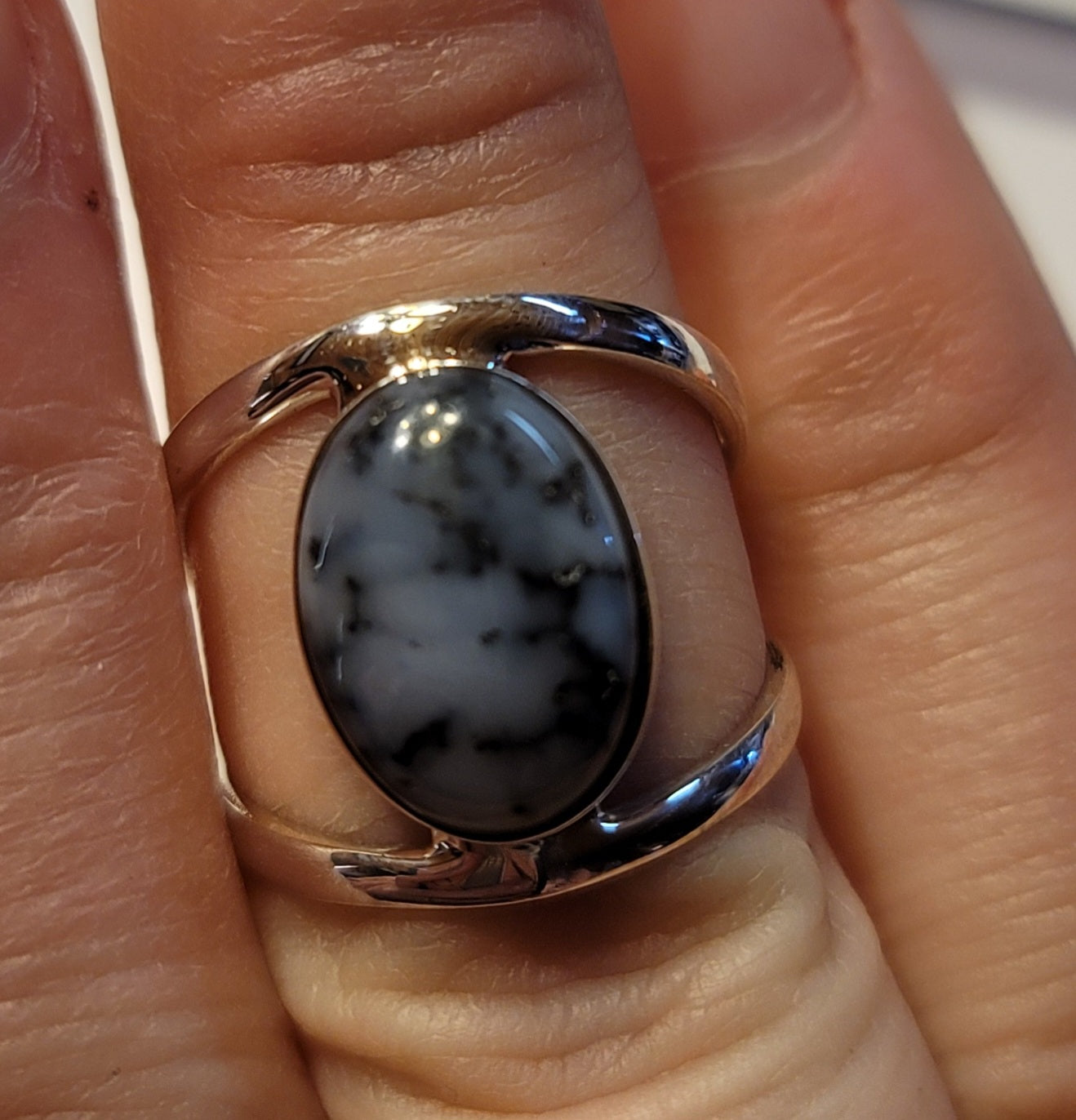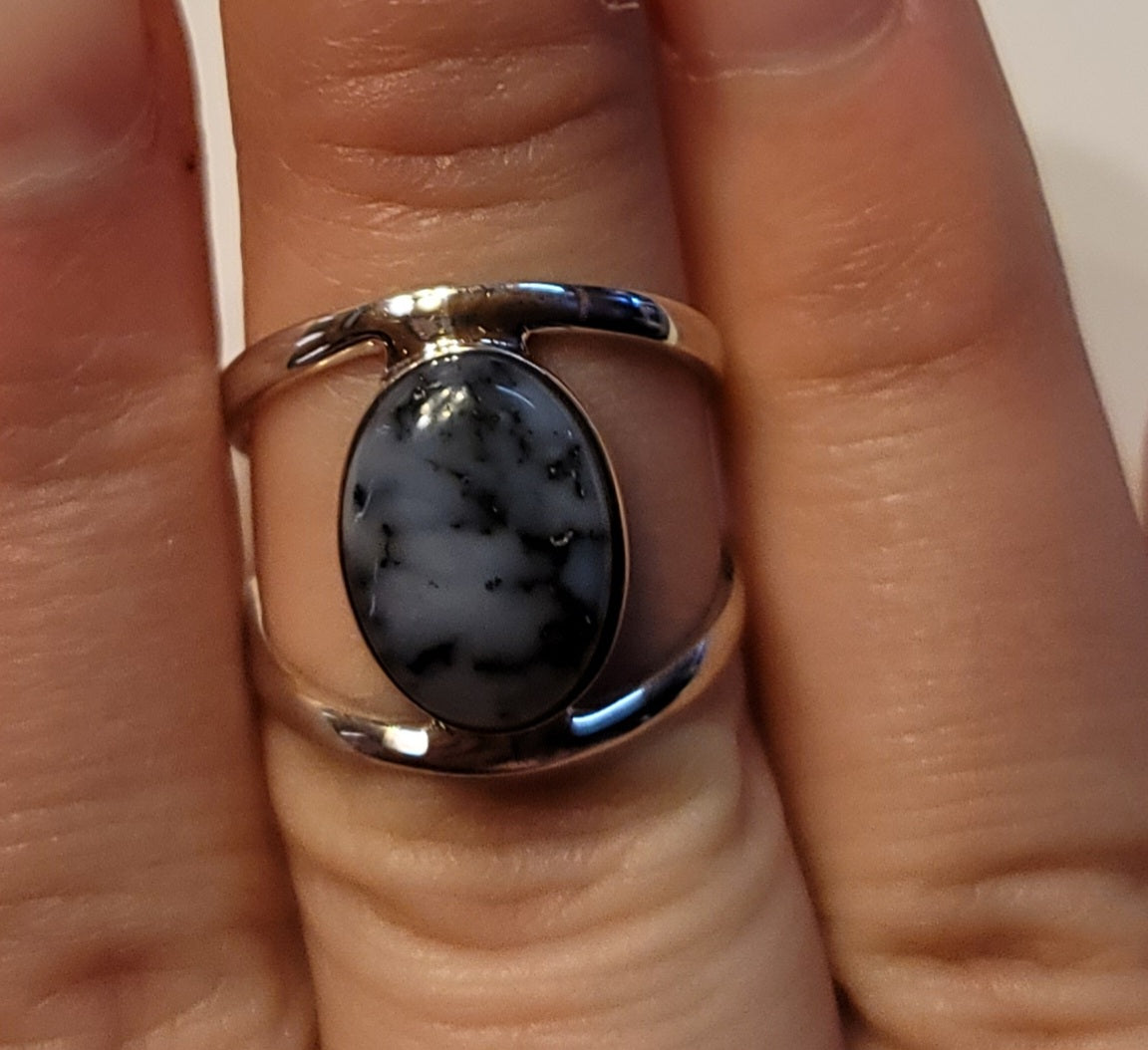 Dendritic opal set in sterling silver. Ring is size 8 and is not adjustable.