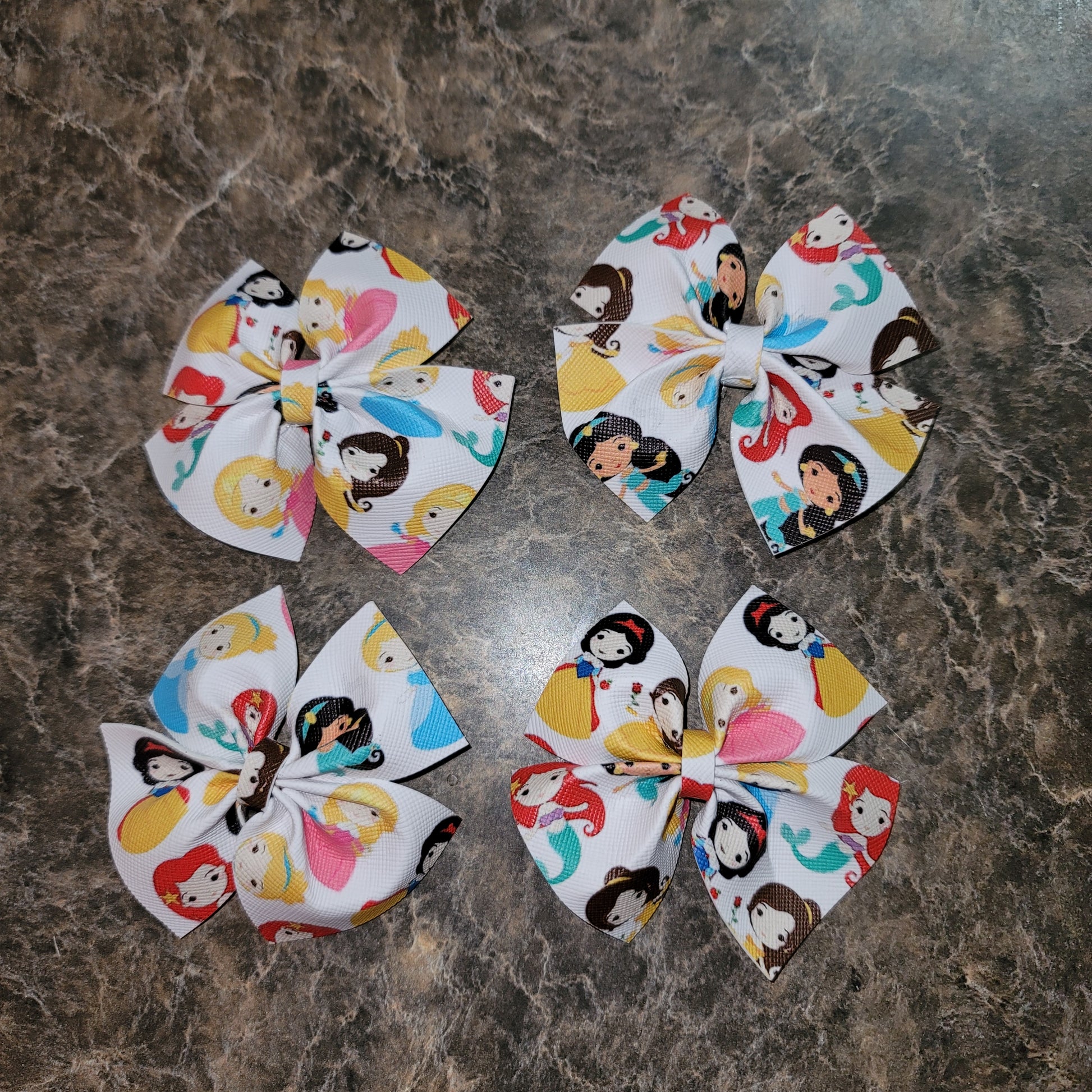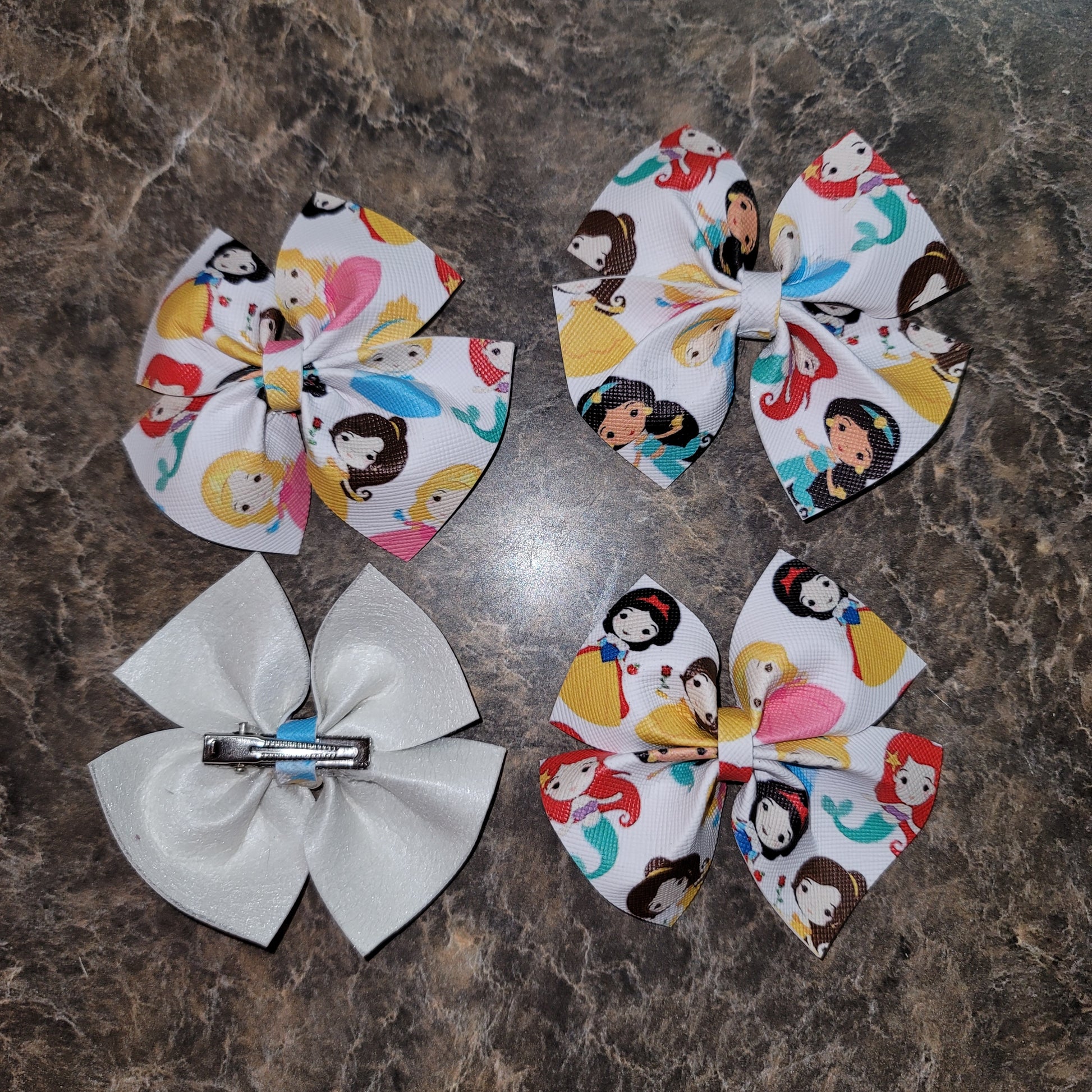 Disney princess print faux leather. Medium bows secured on alligator clips.