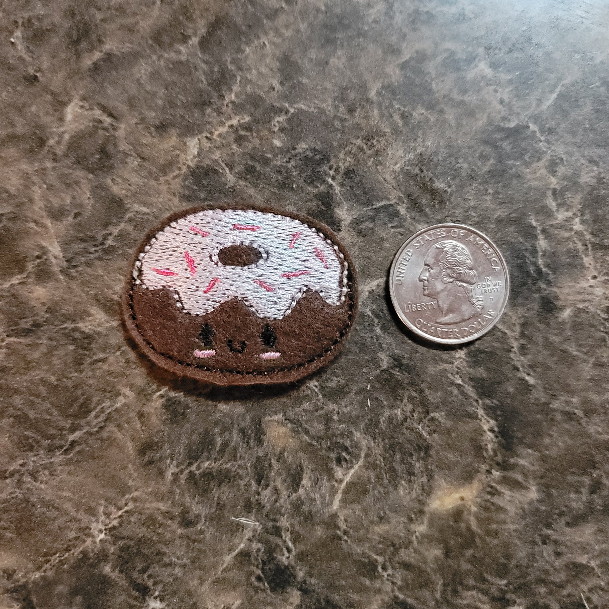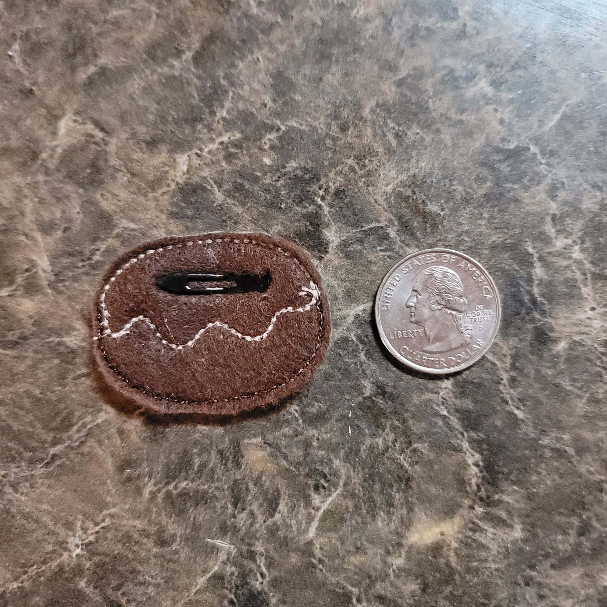 Chocolate donut feltie secured to a 1.2 inch snap clip.