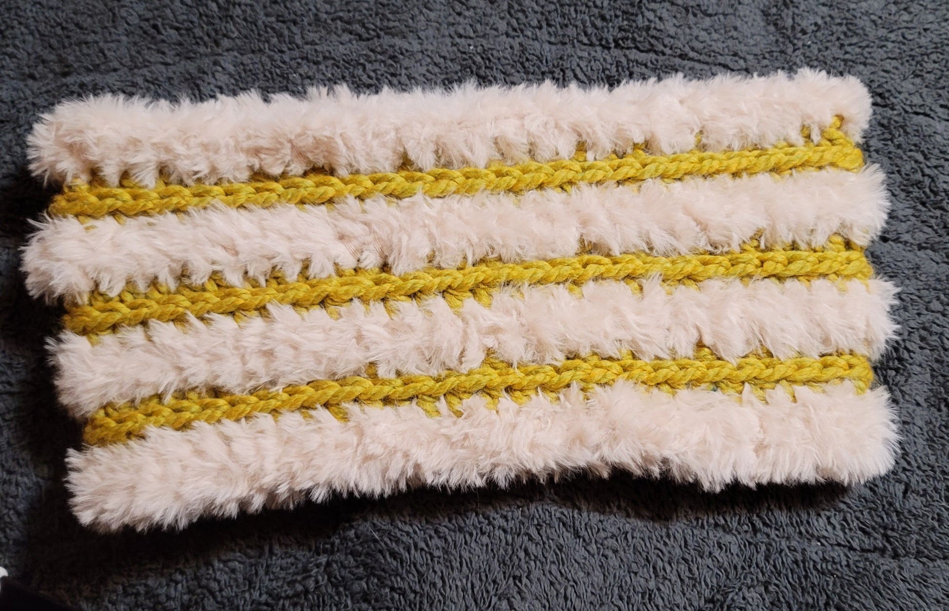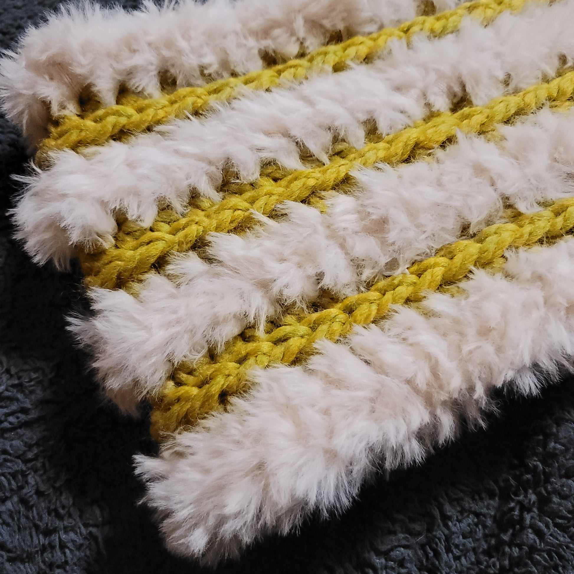 Faux fur is 100% Polyester, yarn is 75% acrylic, 25% wool.