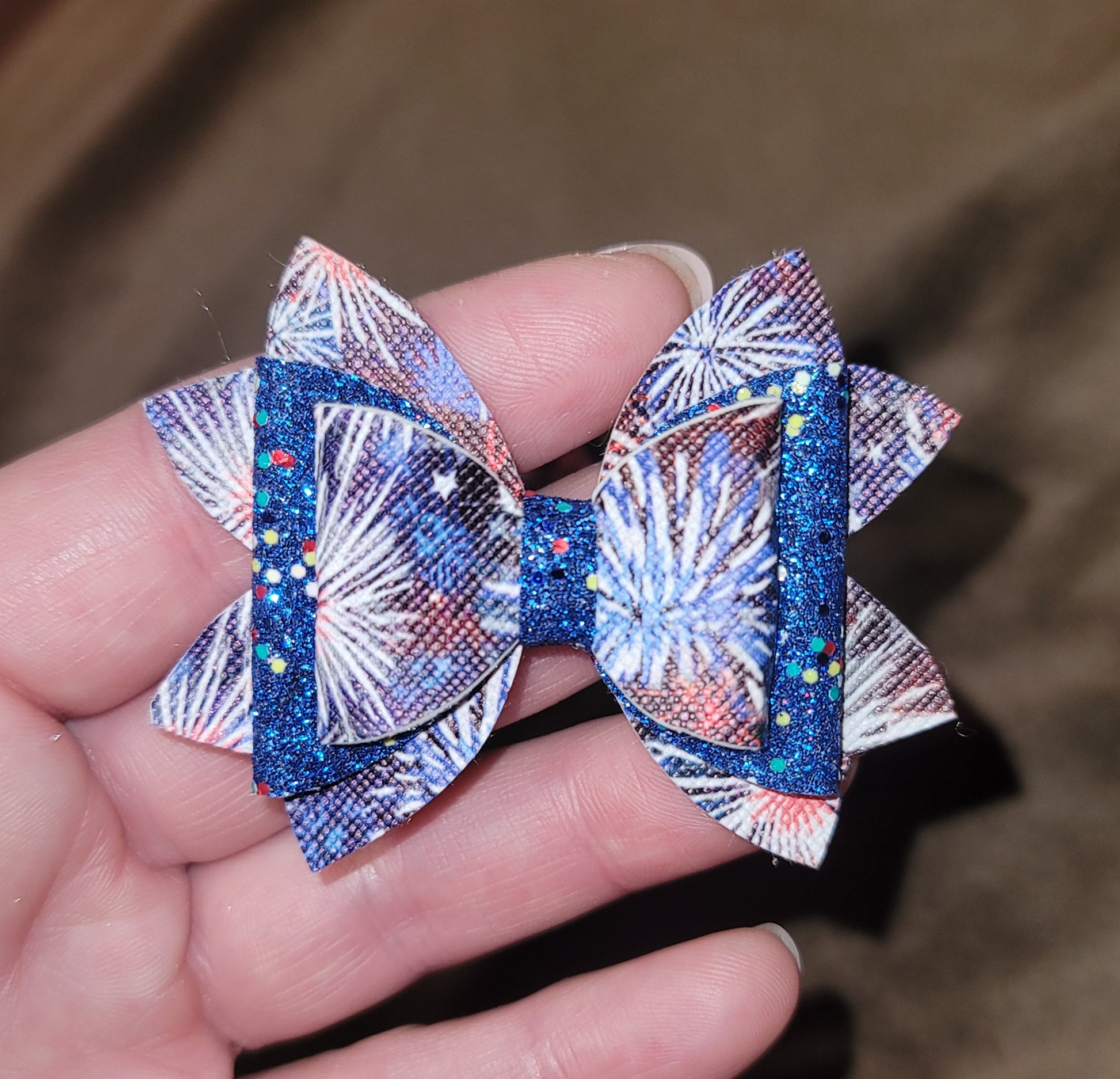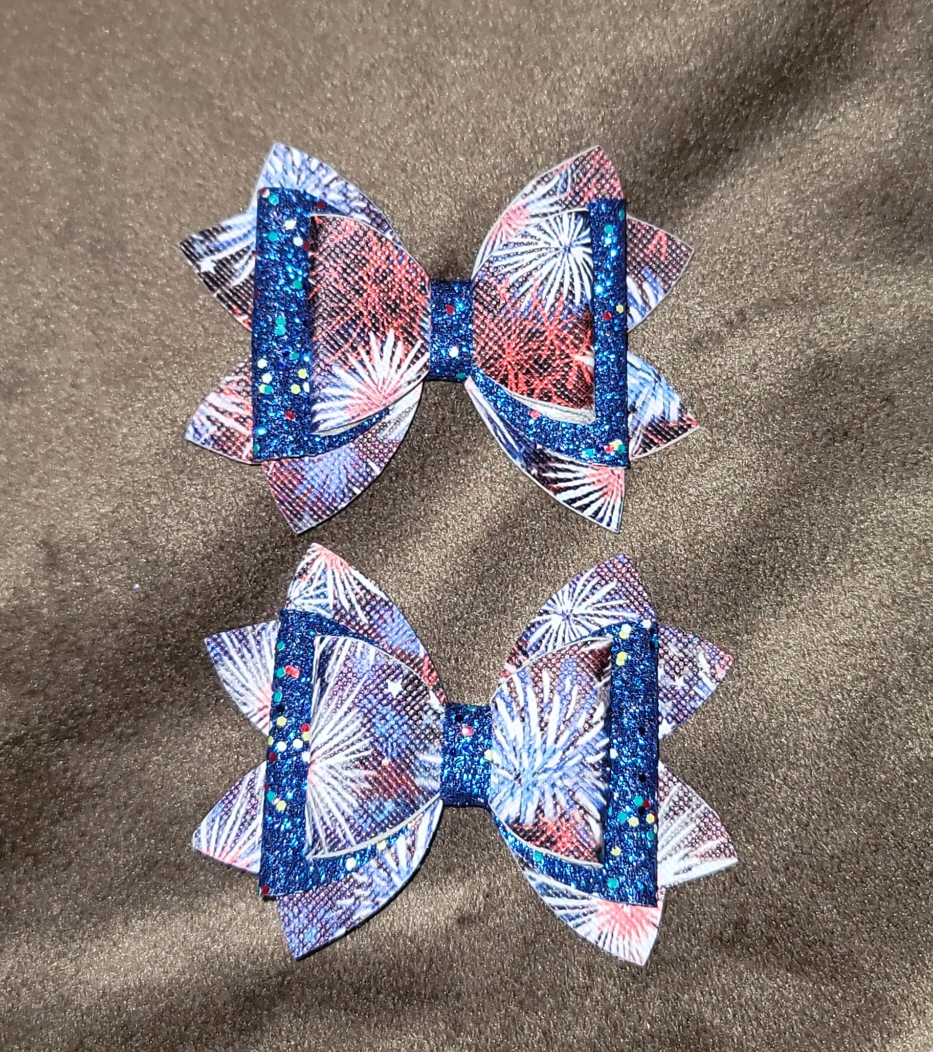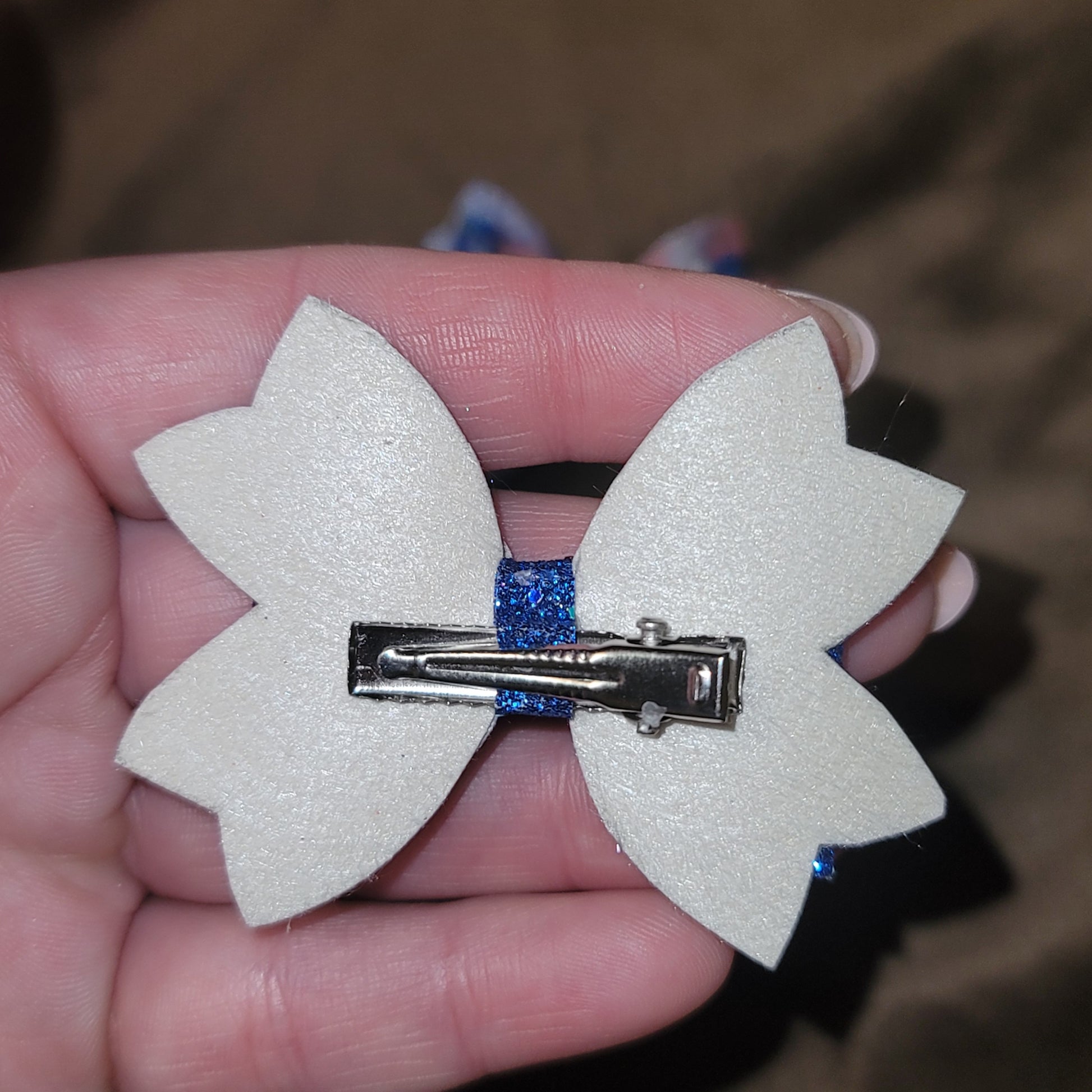 Faux leather and glitter materials. 2.5 inch Lou Lou style bows. Secured on alligator clips.