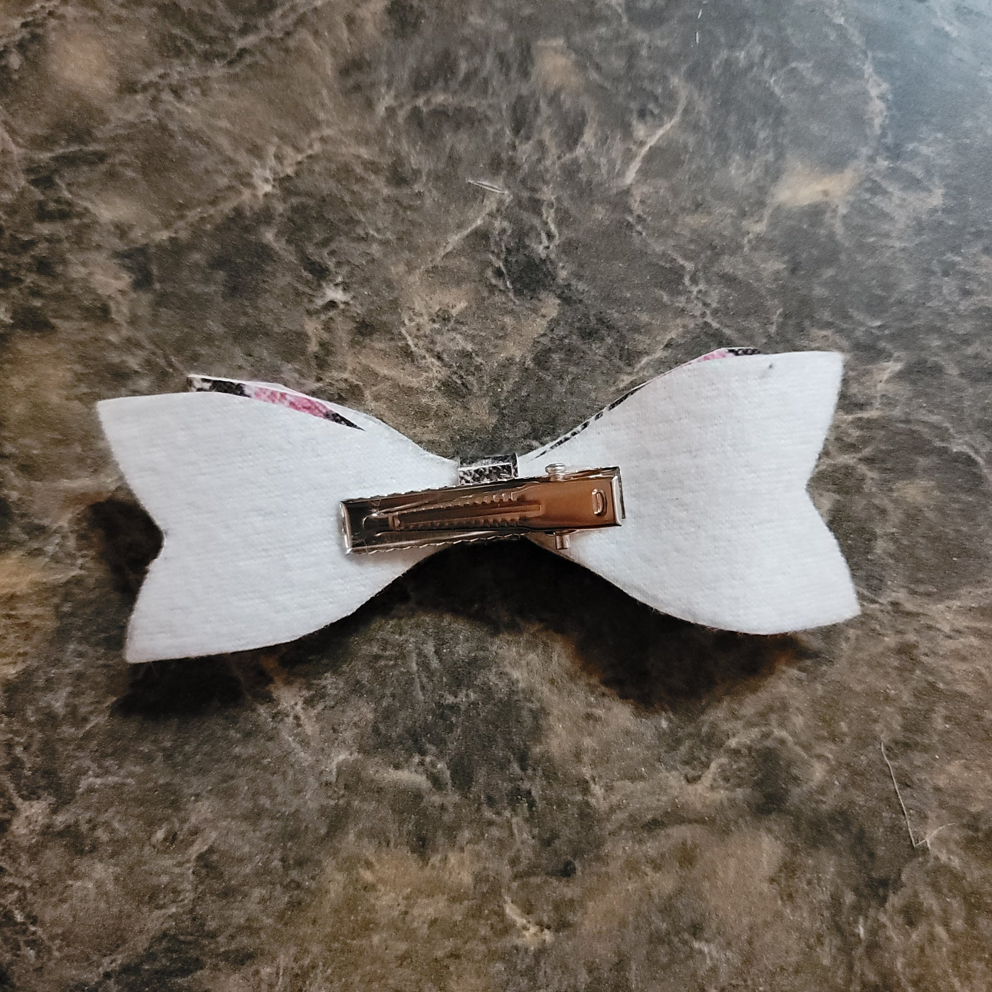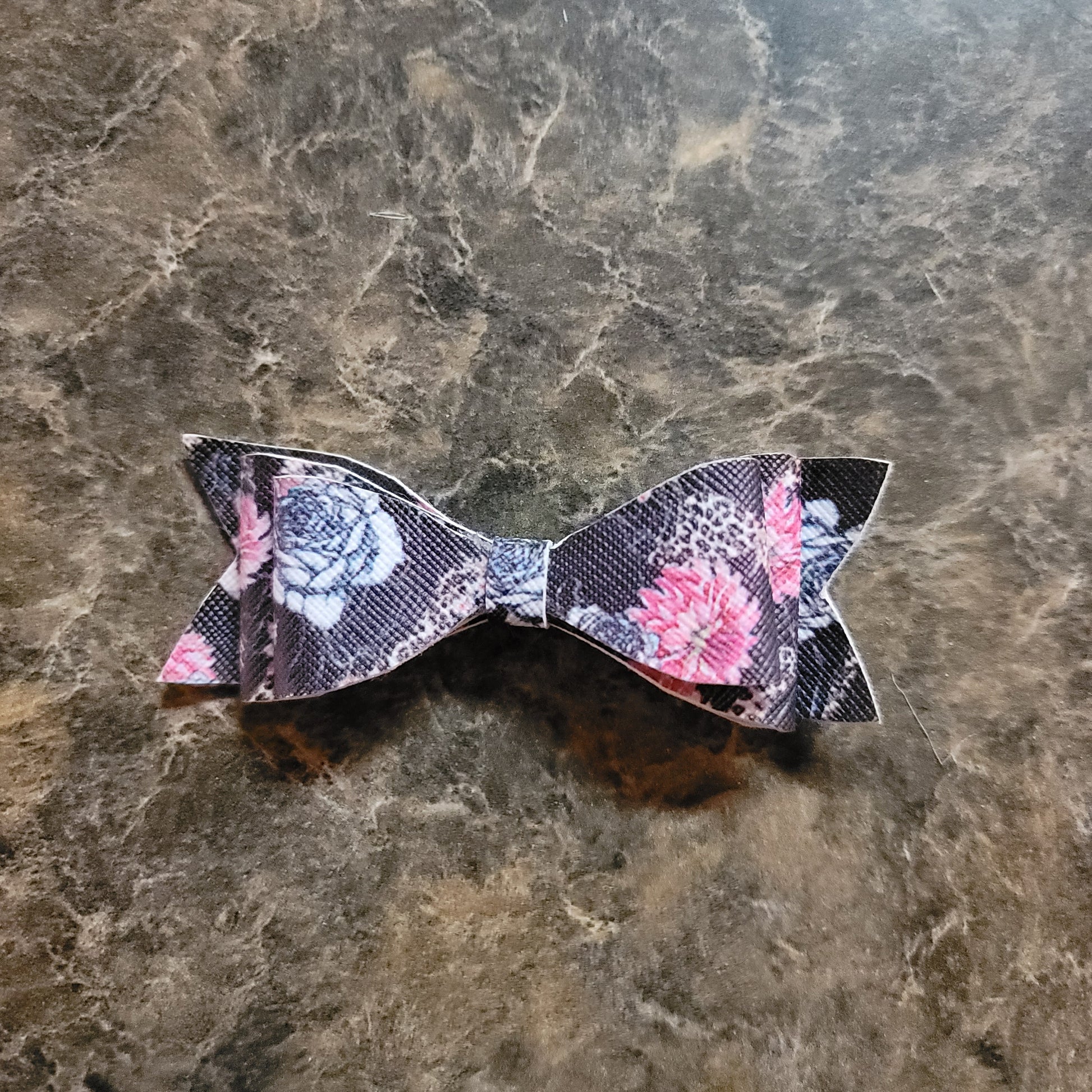 Flowers and cheetah print faux leather. Small double stack bow secured on an alligator clip.