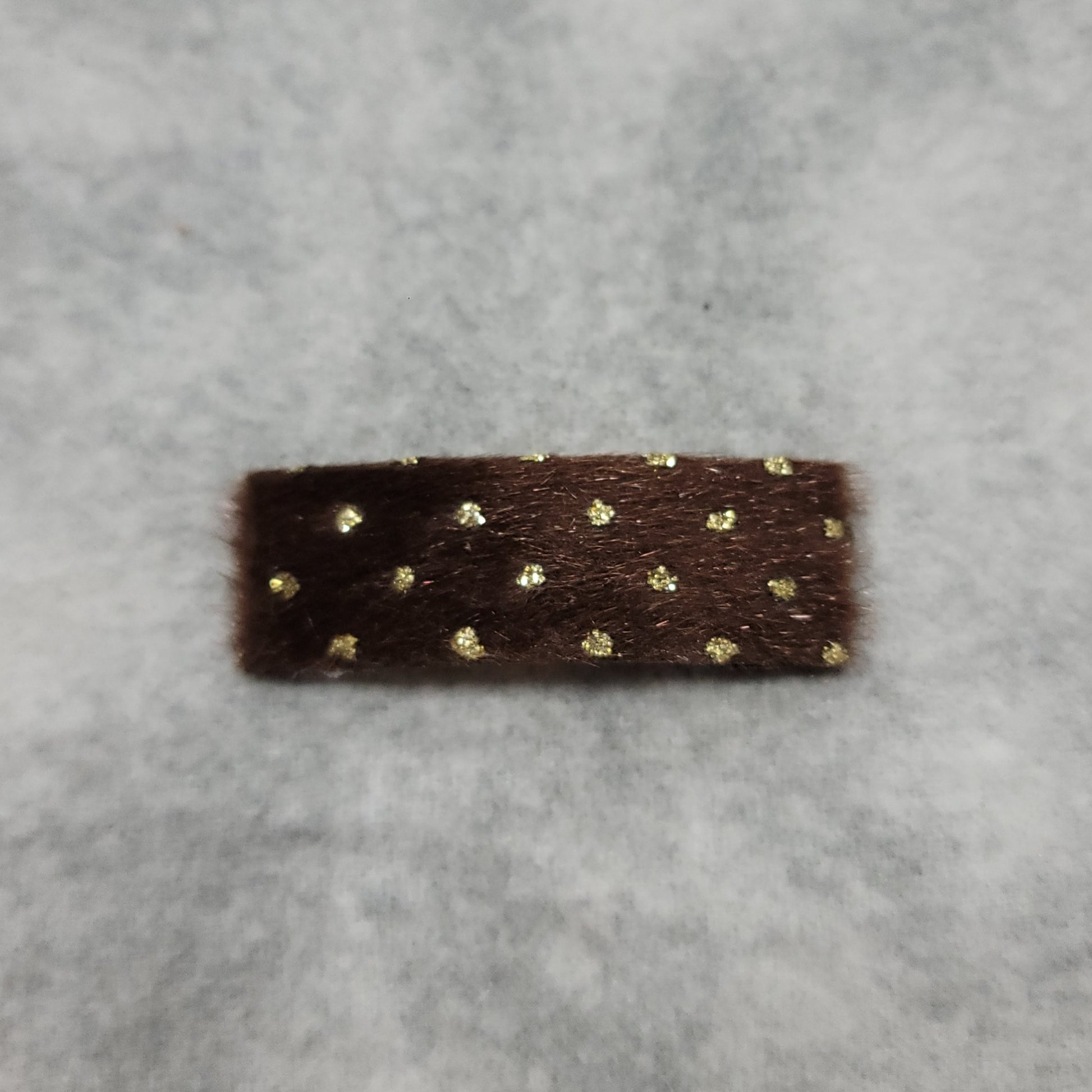 Fuzzy brown with gold polka dots secured on a 2 inch snap clip.
