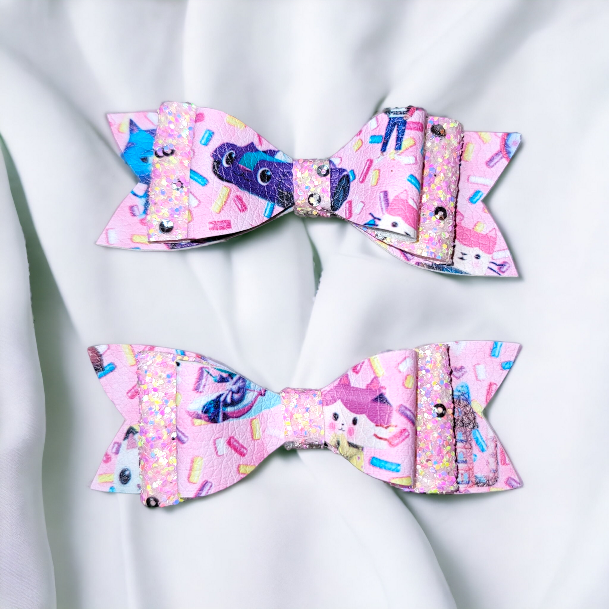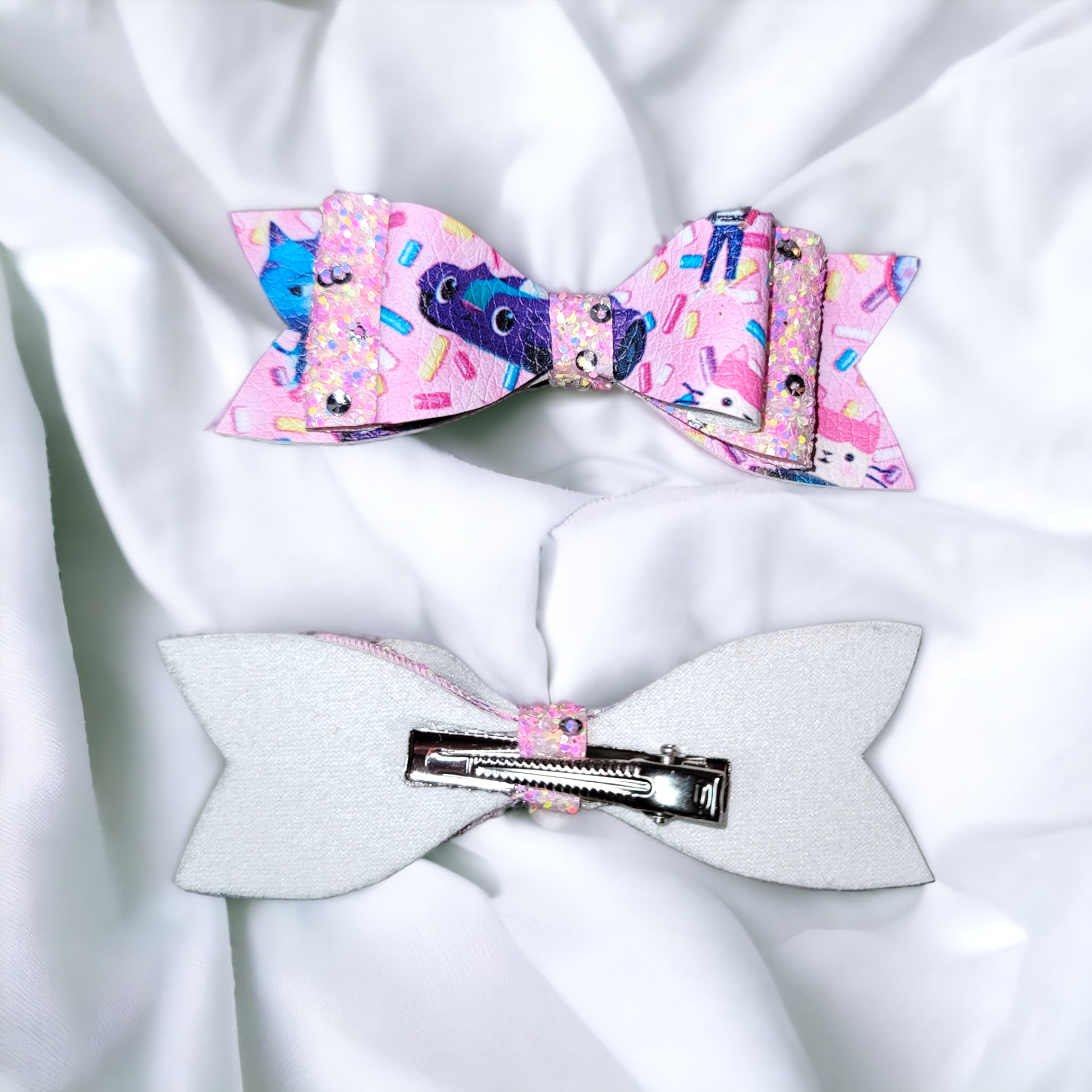 Gabby's Dollhouse print faux leather & pink glitter with soft backing. Double stack small bows secured on alligator clips.