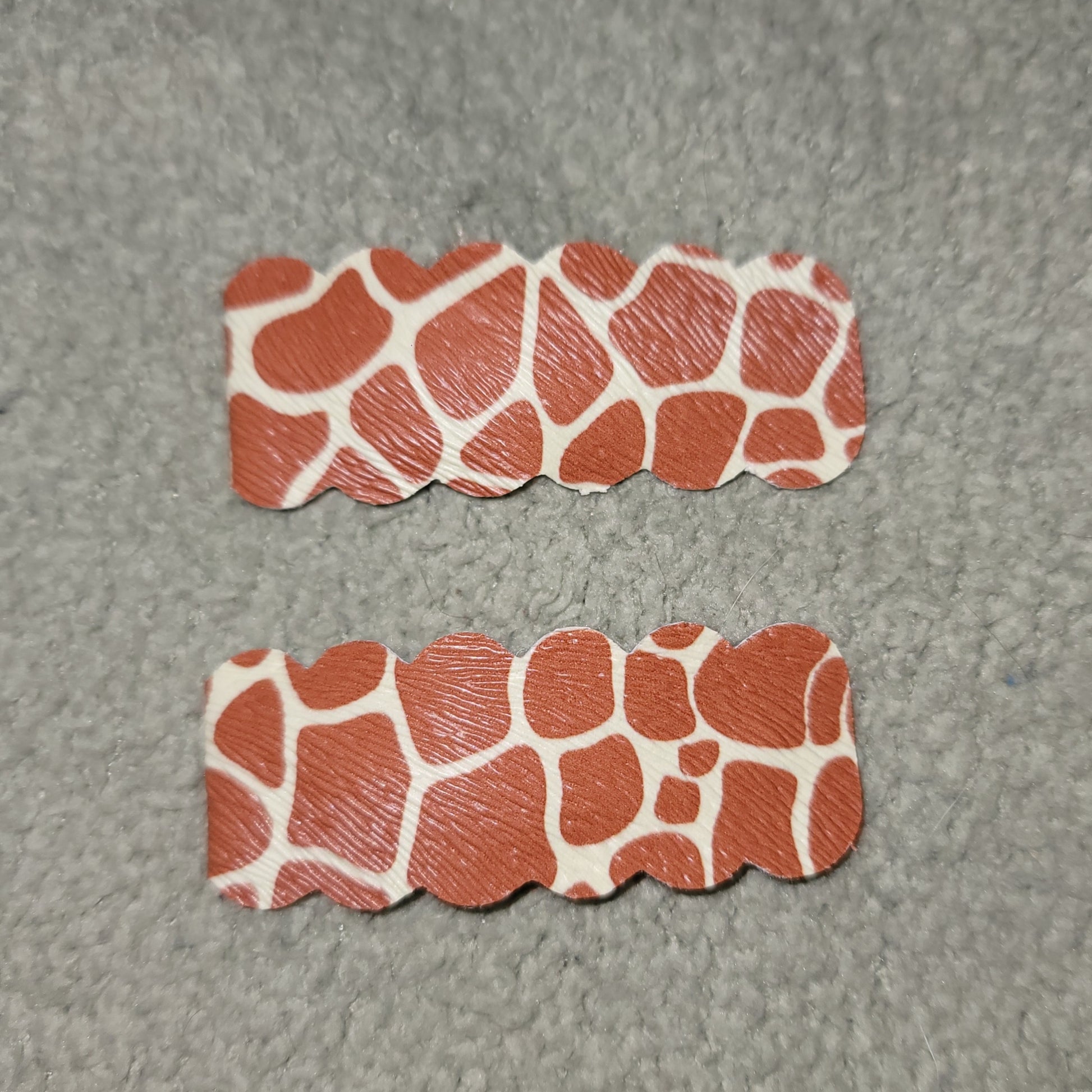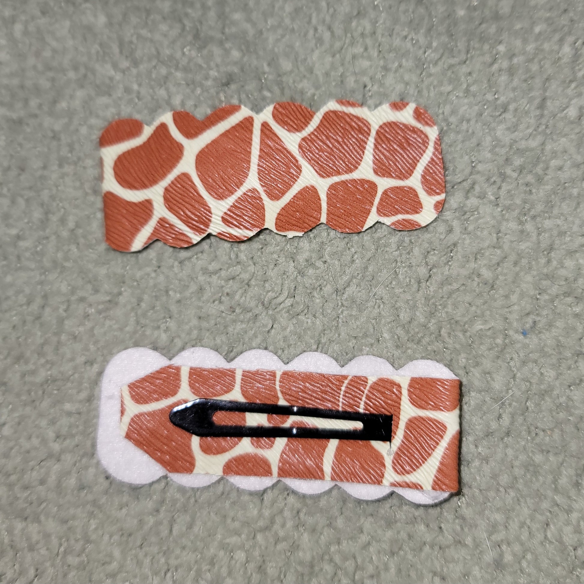 Giraffe print faux leather. Secured on 2 inch snap clips.