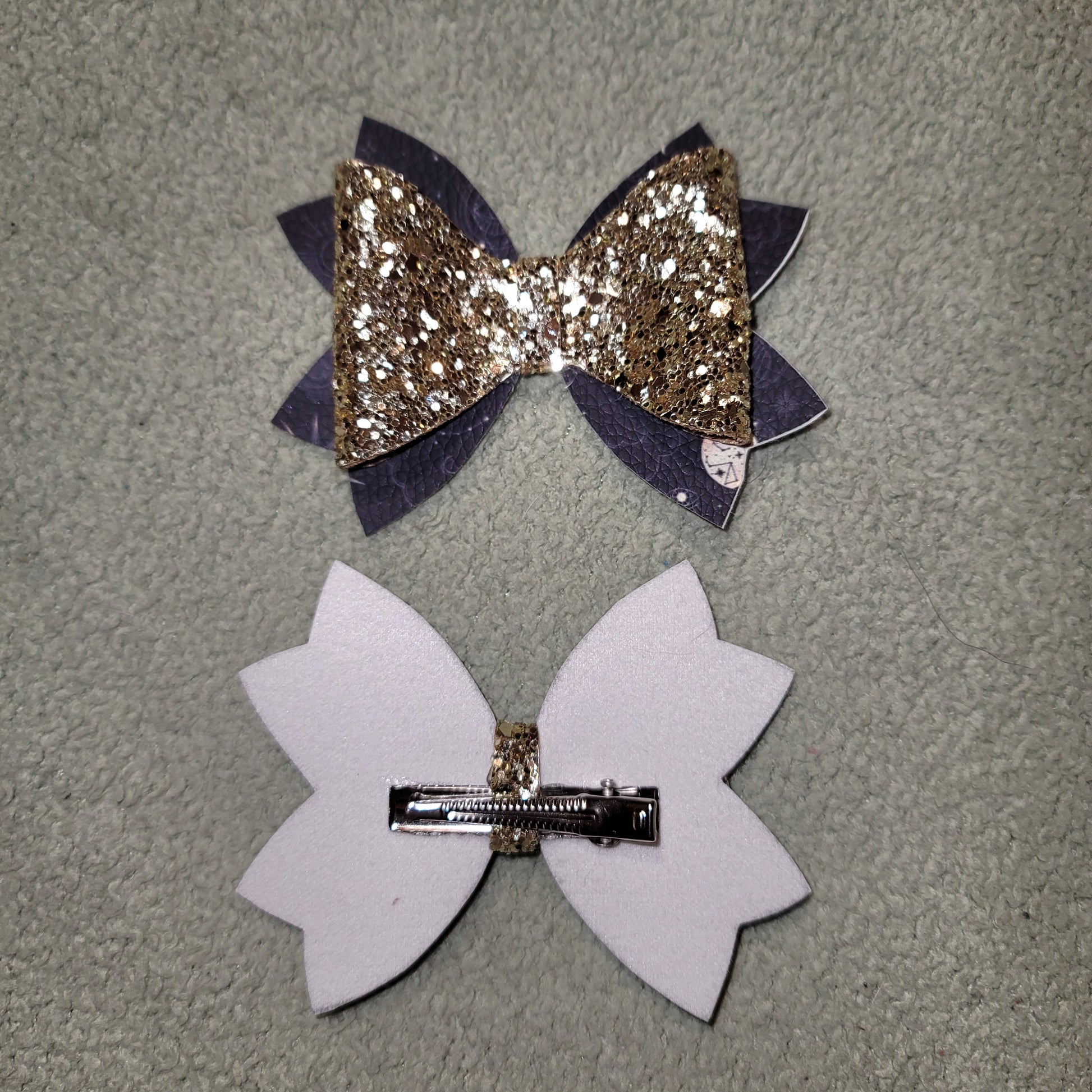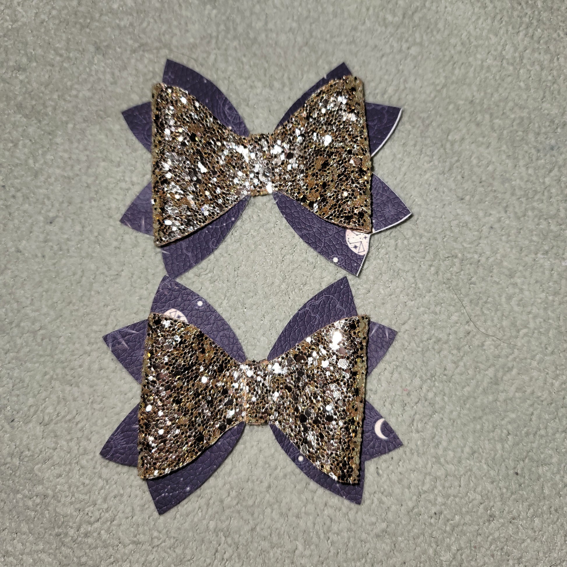 Gold glitter material and celestial print faux leather. Medium bows secured on alligator clips.