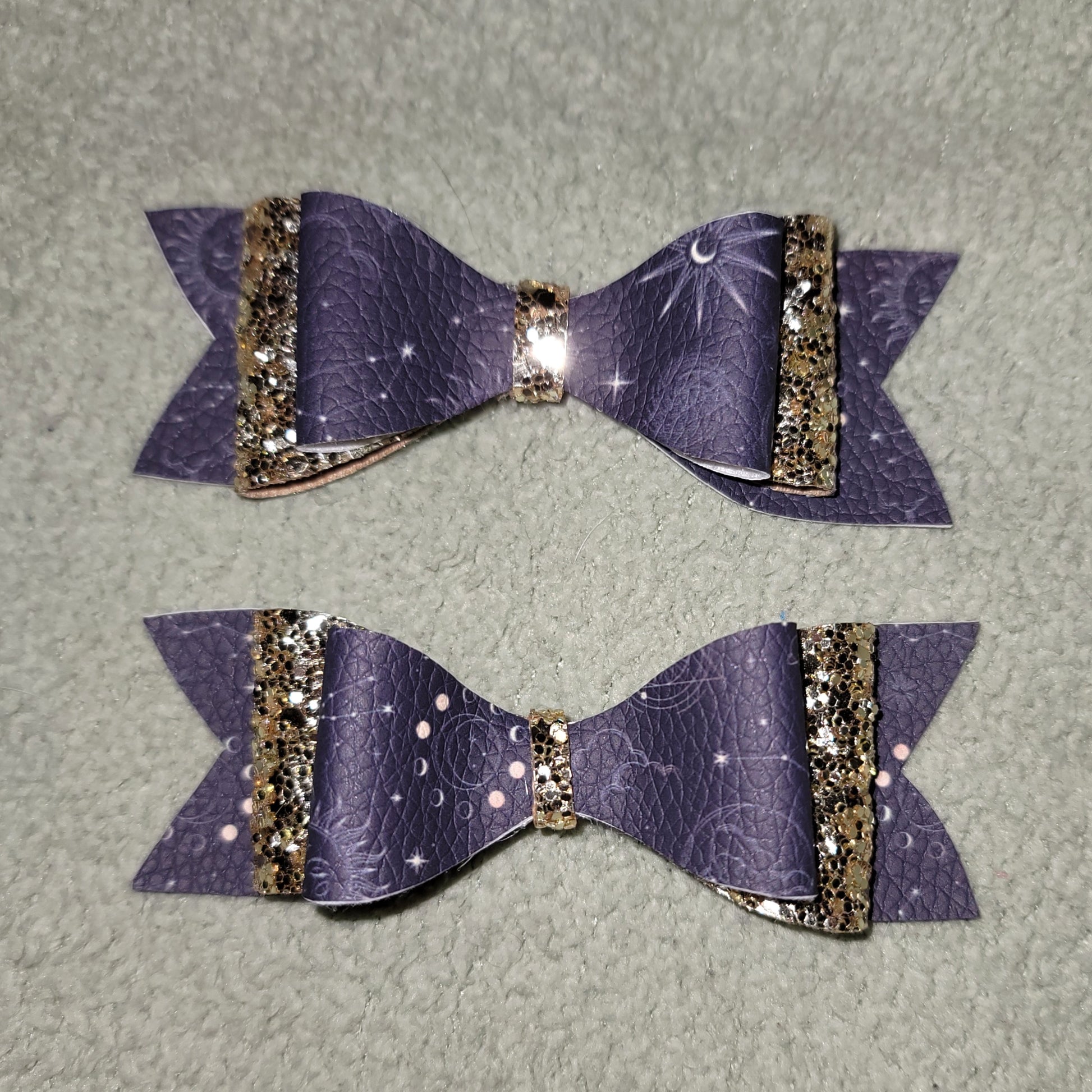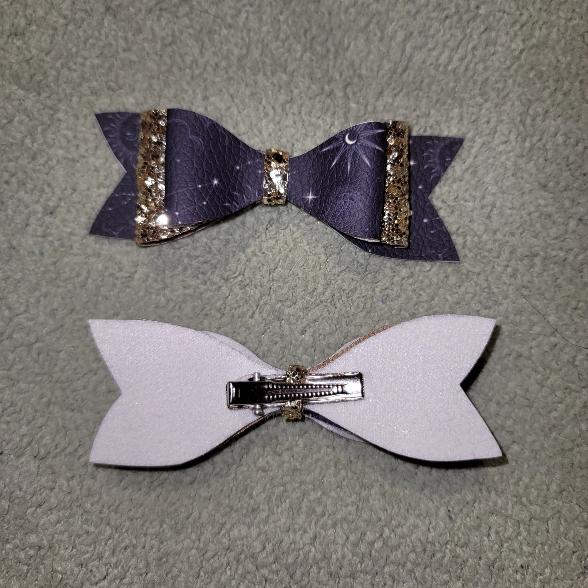 Gold glitter material and celestial print faux leather. Double stack small bows secured on alligator clips.