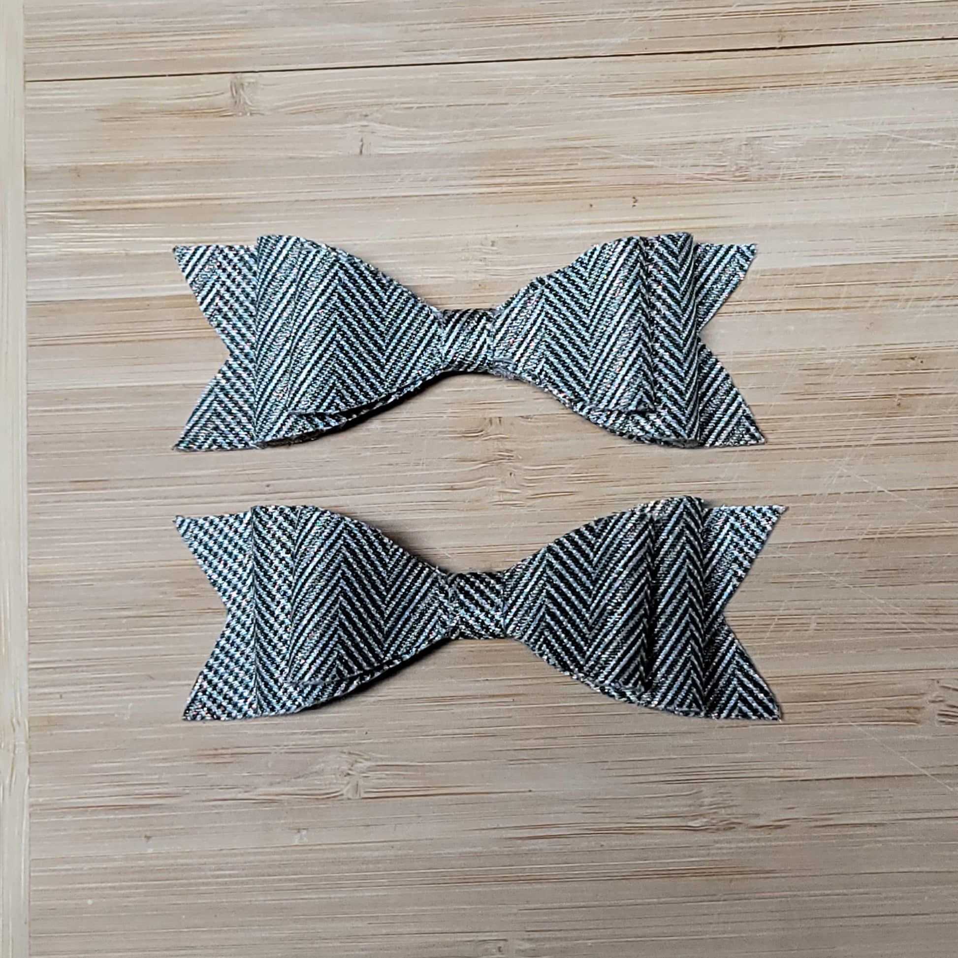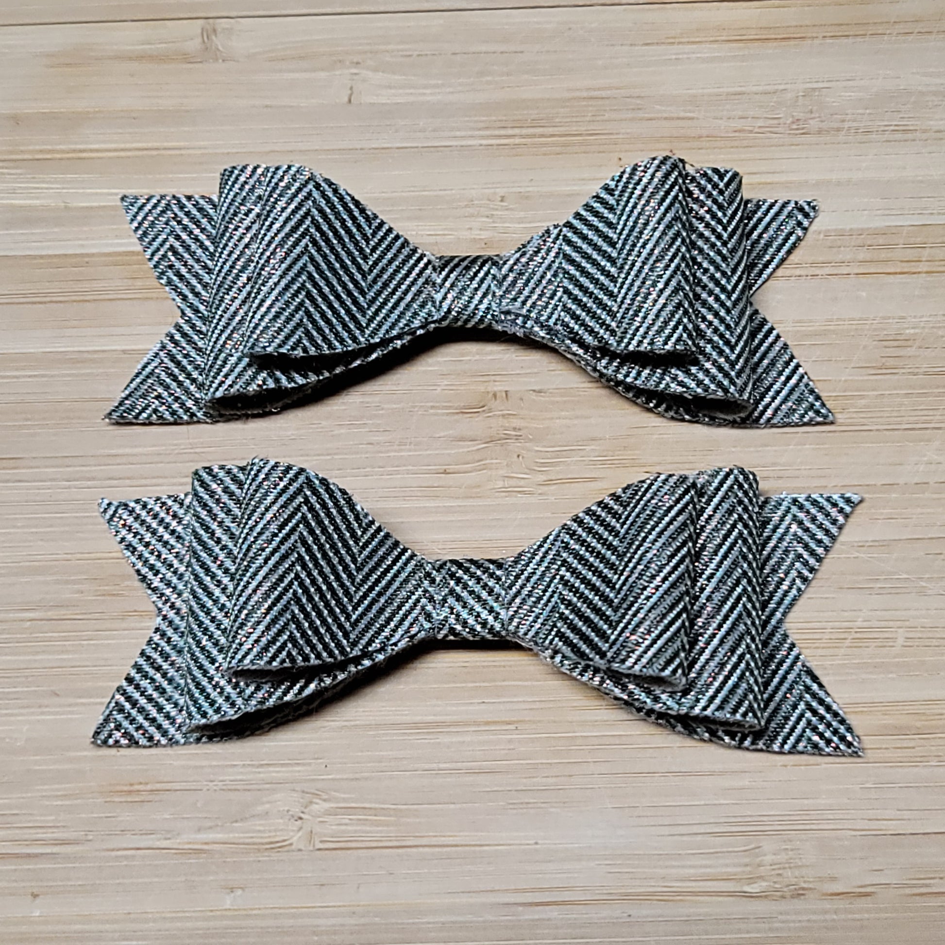 Small double stack gold & green bow set. Soft material and very sparkly. Secured to an alligator clip.