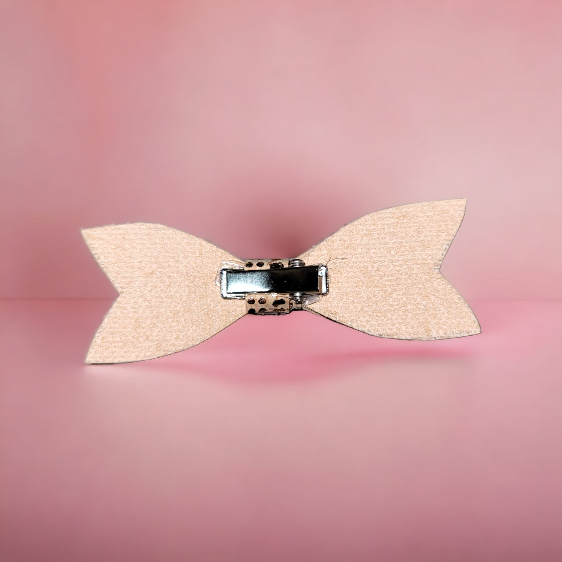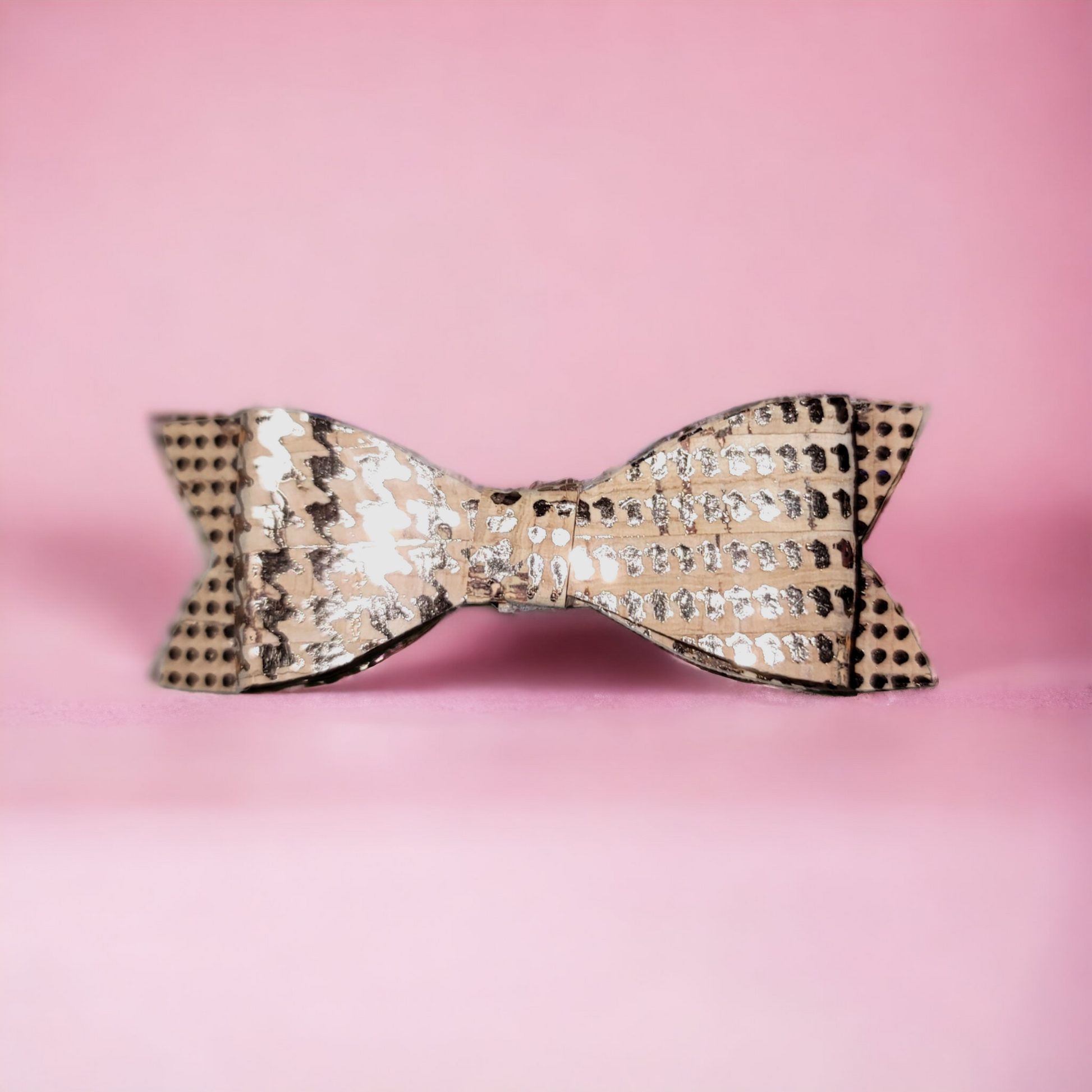 Gold houndstooth print on cork texture faux leather. Mini bow secured on an alligator clip.