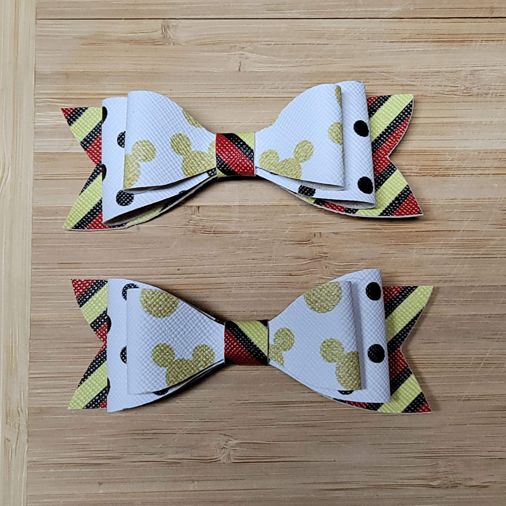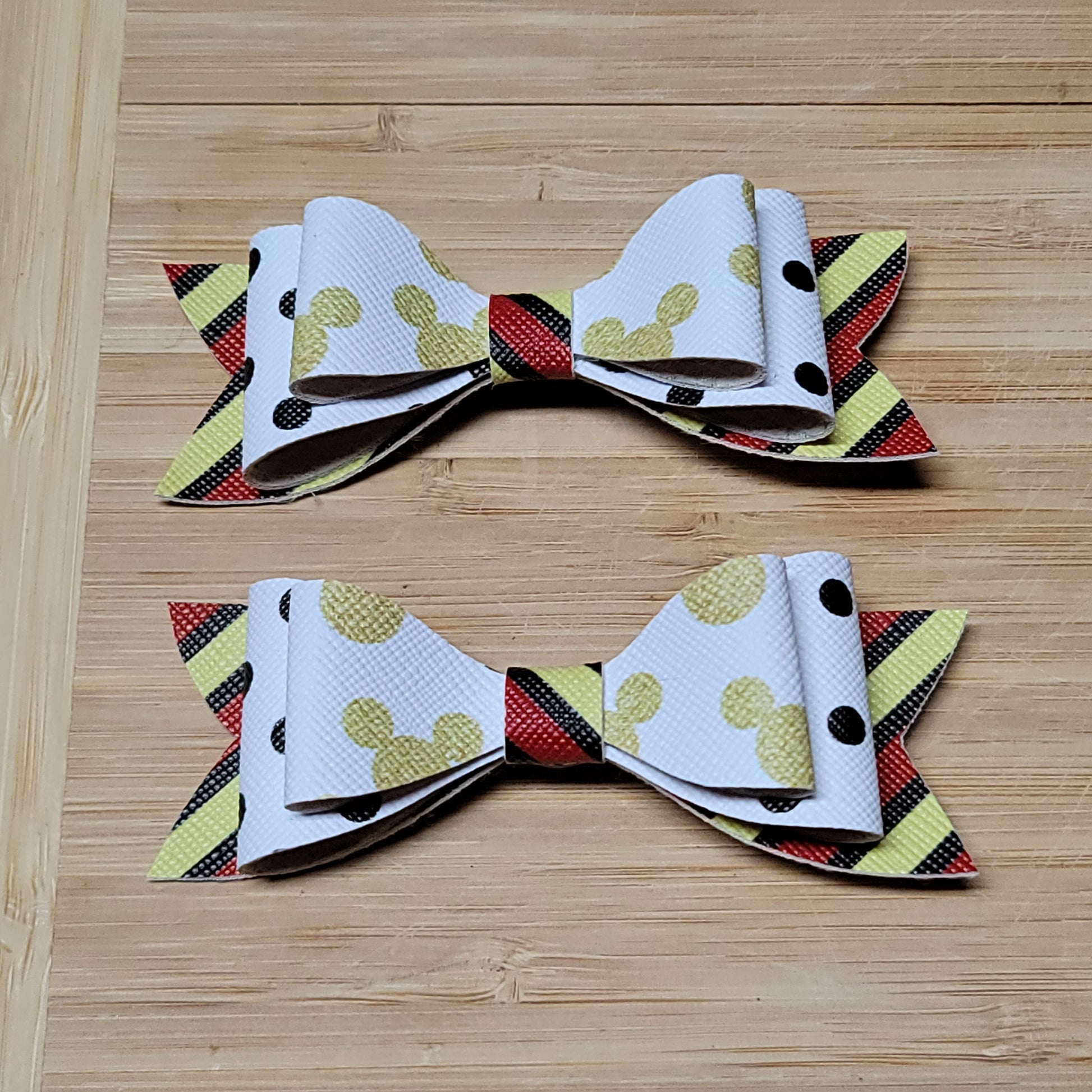 Faux leather gold Mickey Mouse, Polka dots and stripes double stack small bow set secured on alligator clips.