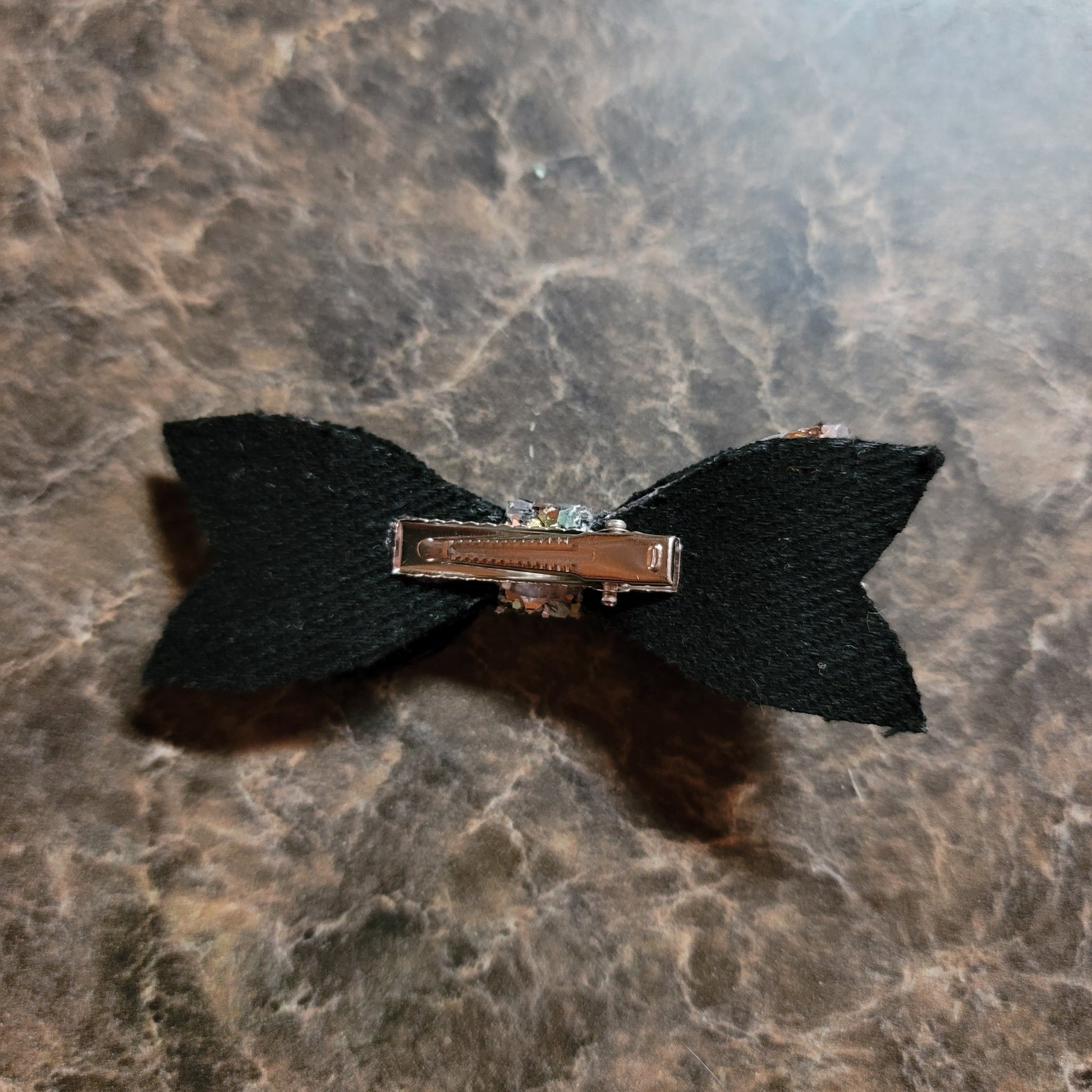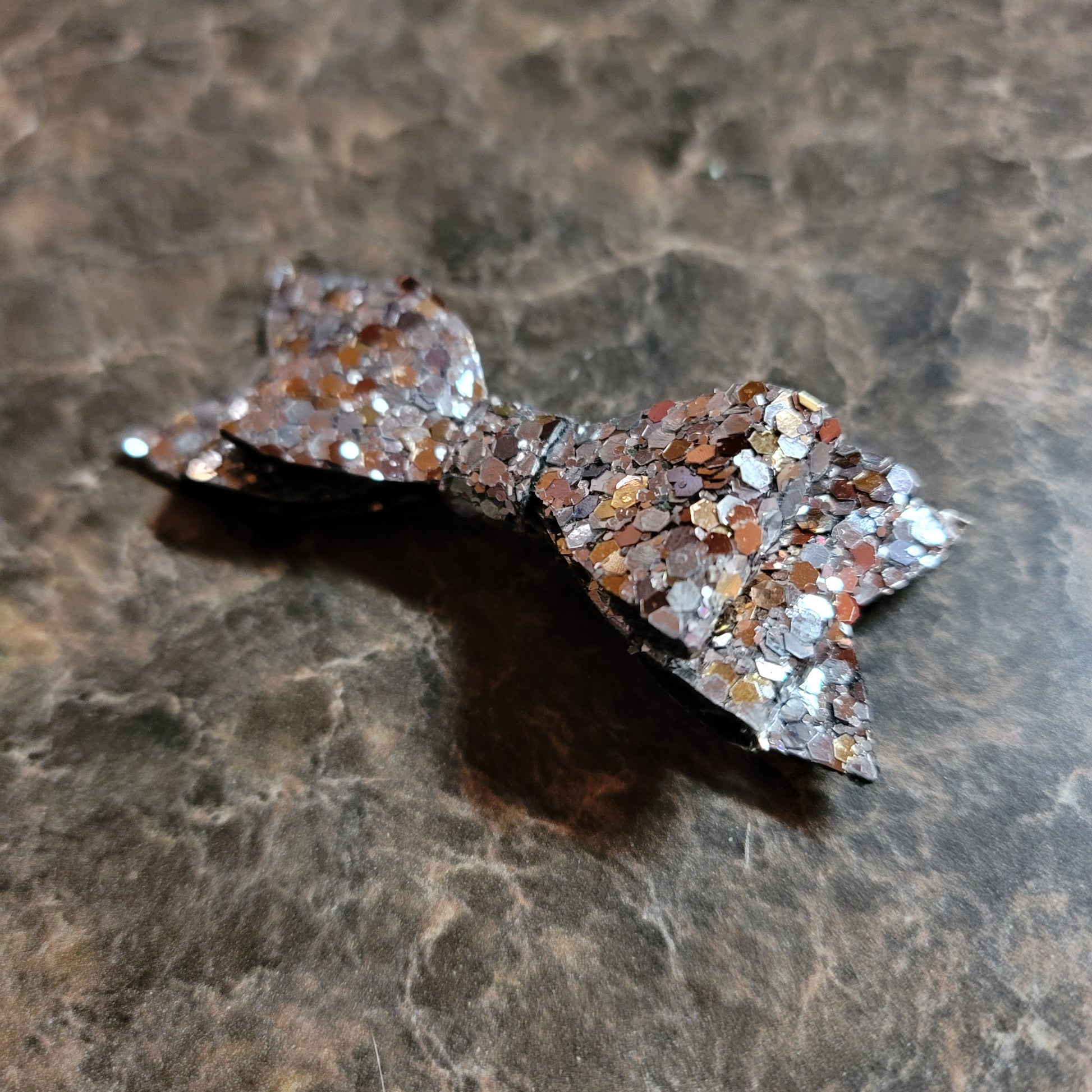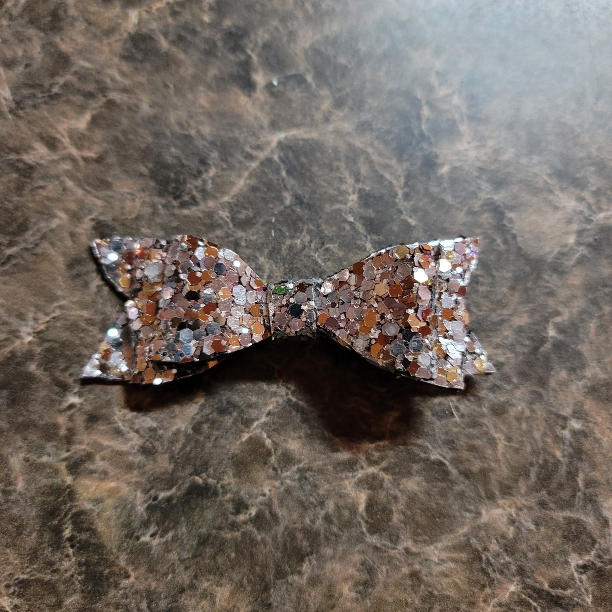 Gold and silver chunky glitter material with soft backing. Small double stack bow secured on an alligator clip.