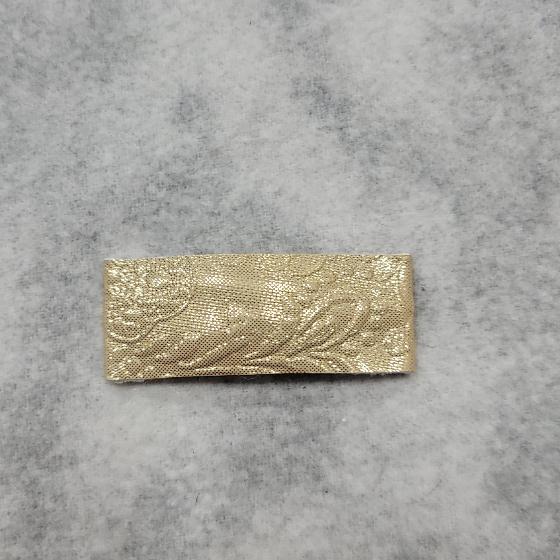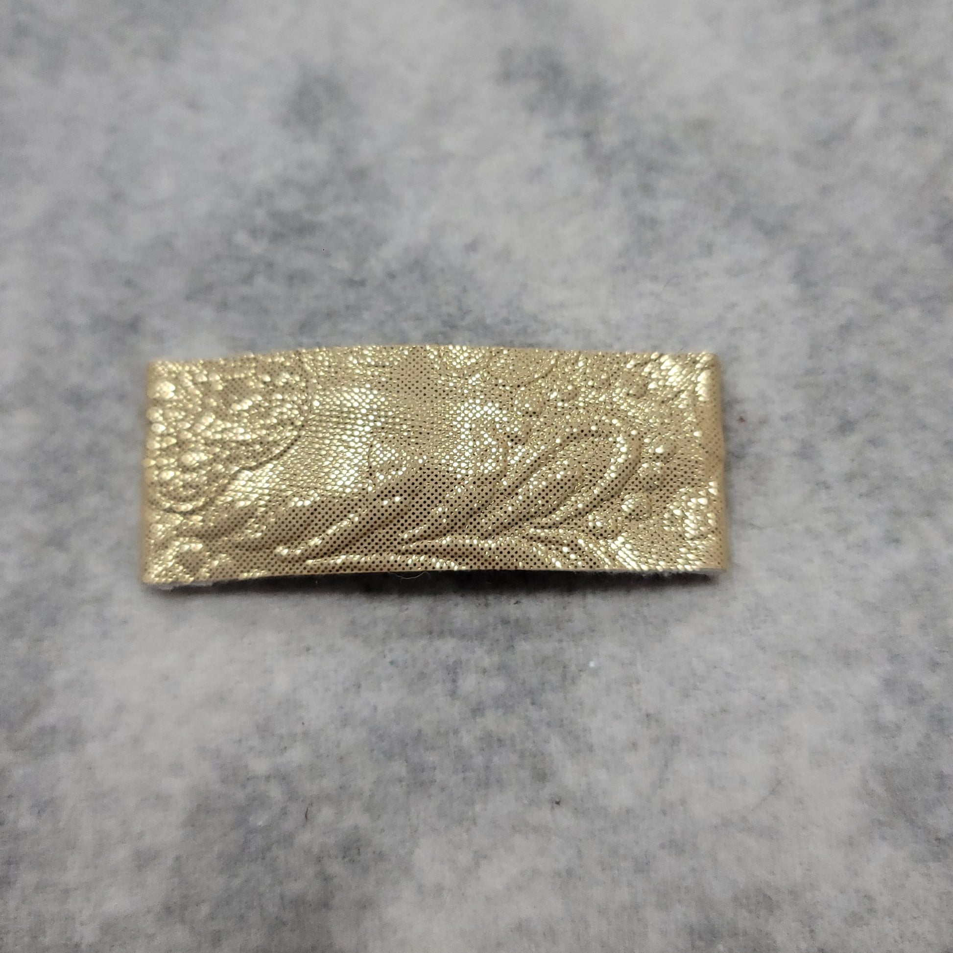 Gold floral design faux leather secured on a 2 inch snap clip.