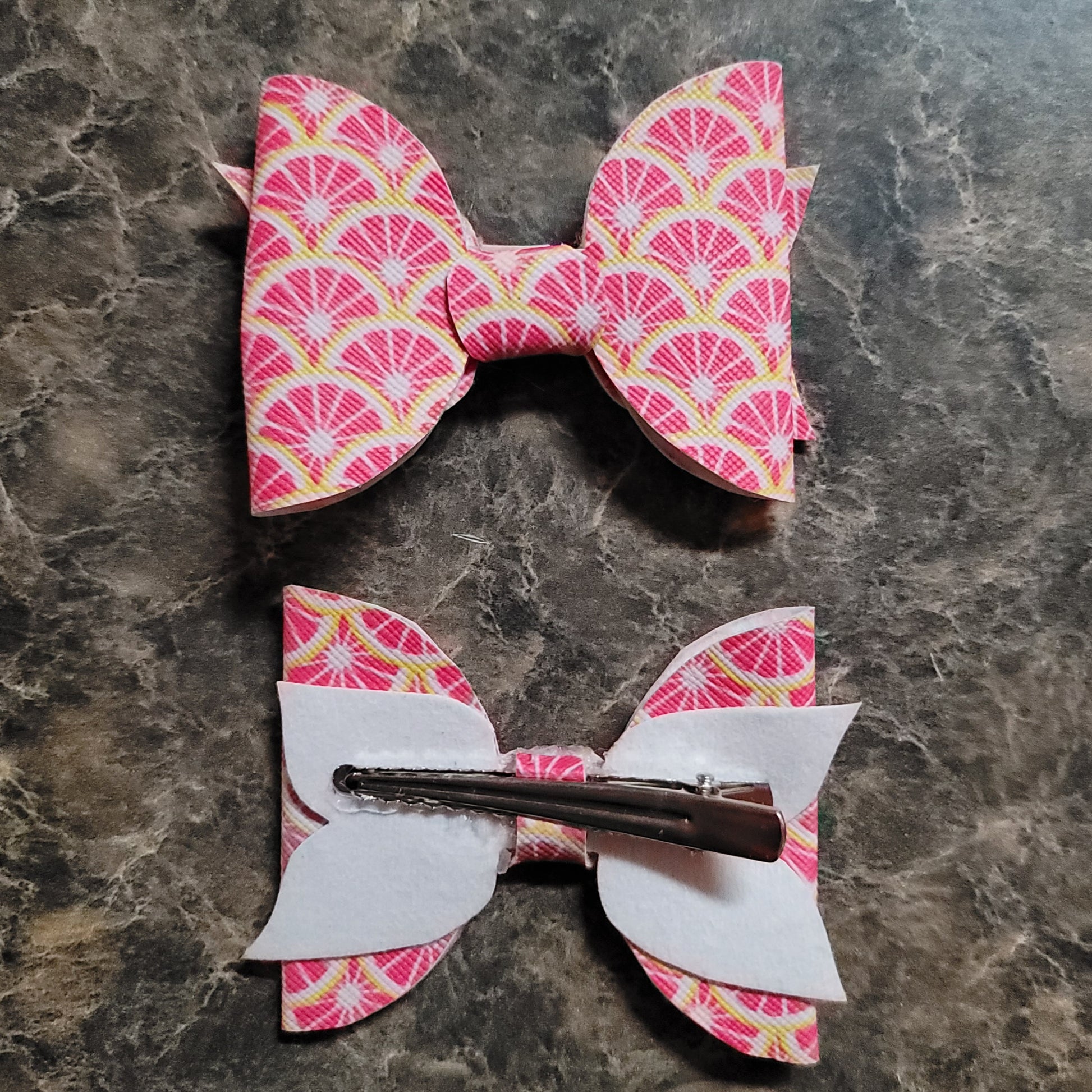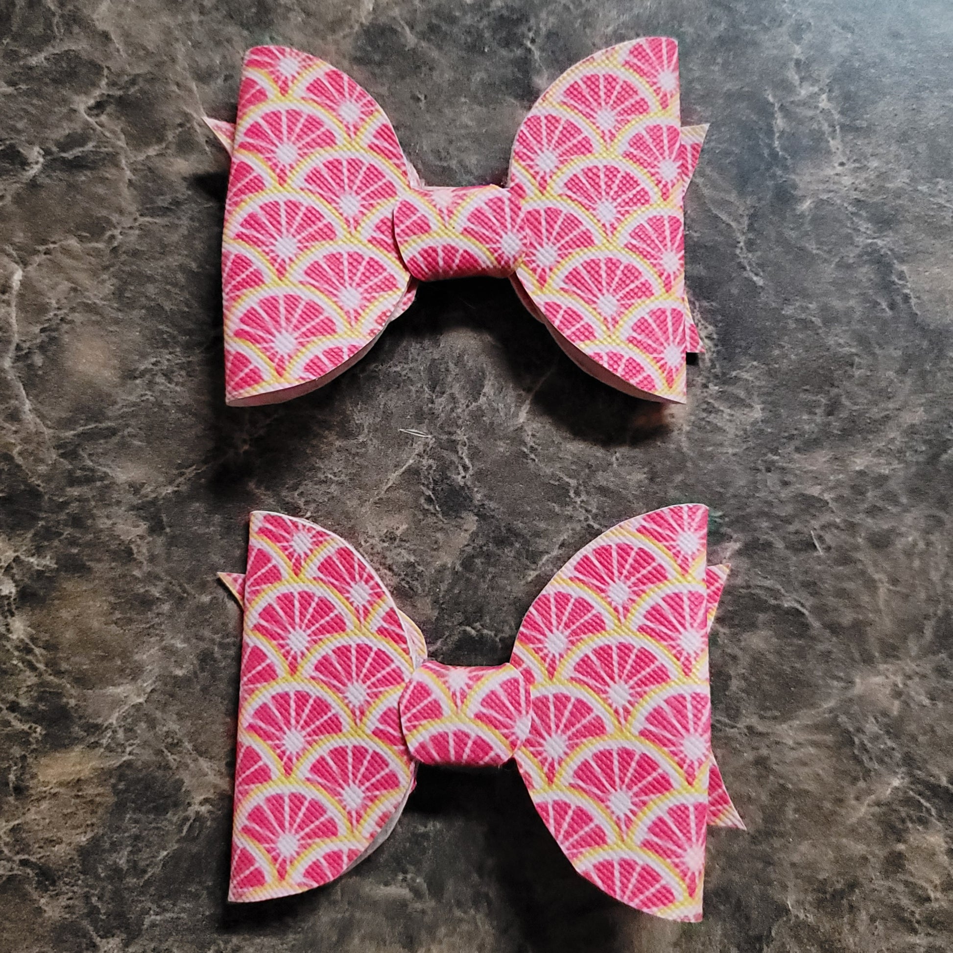 Grapefruit print faux leather. Medium bow secured on an alligator clip.