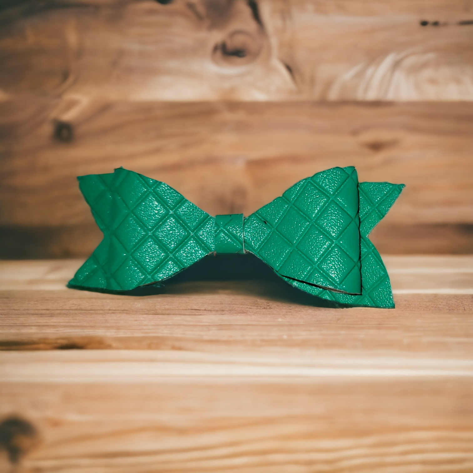 Green cushion texture faux leather, small how secured on an alligator clip.