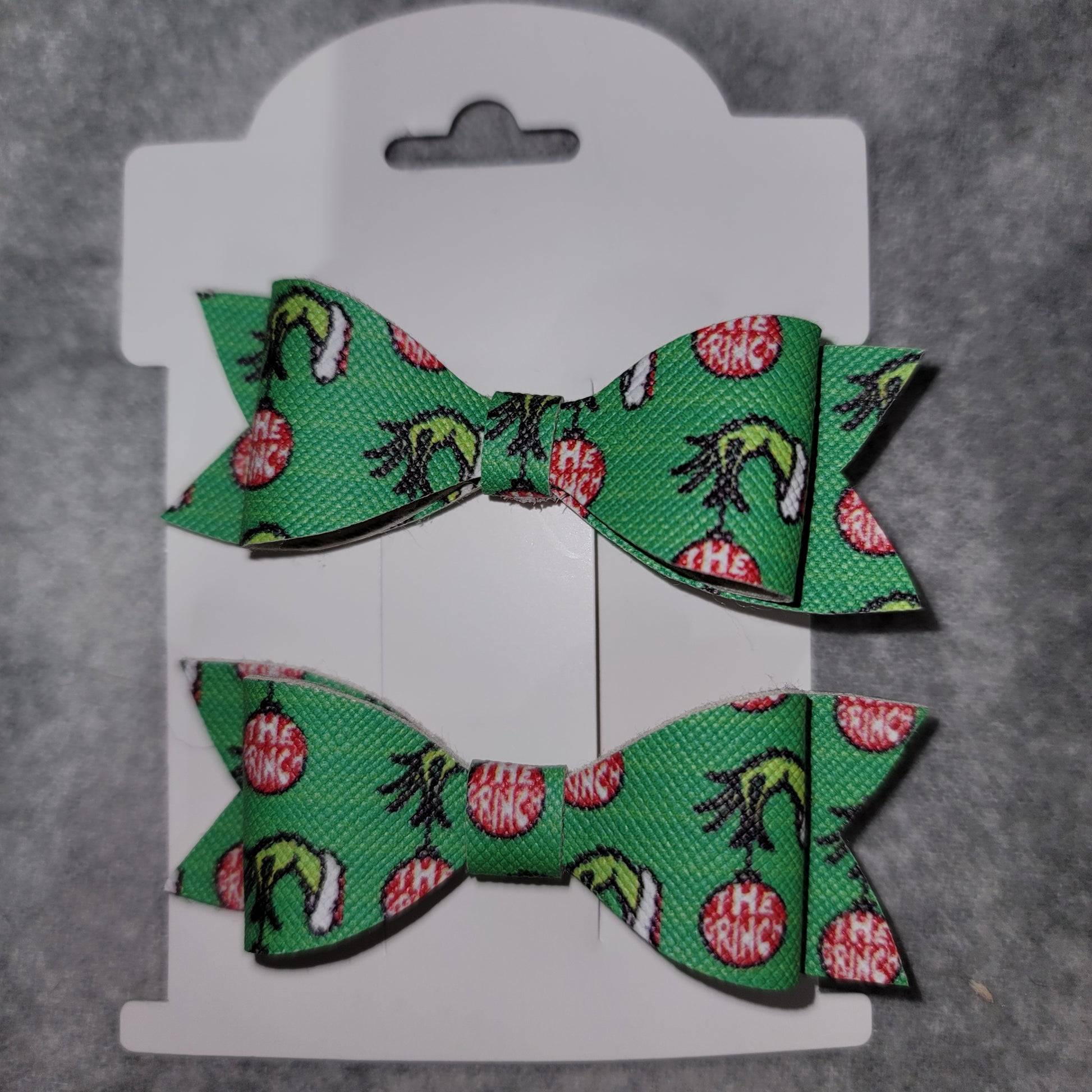 Green Grinch mini bow set. Secured to an alligator clip.