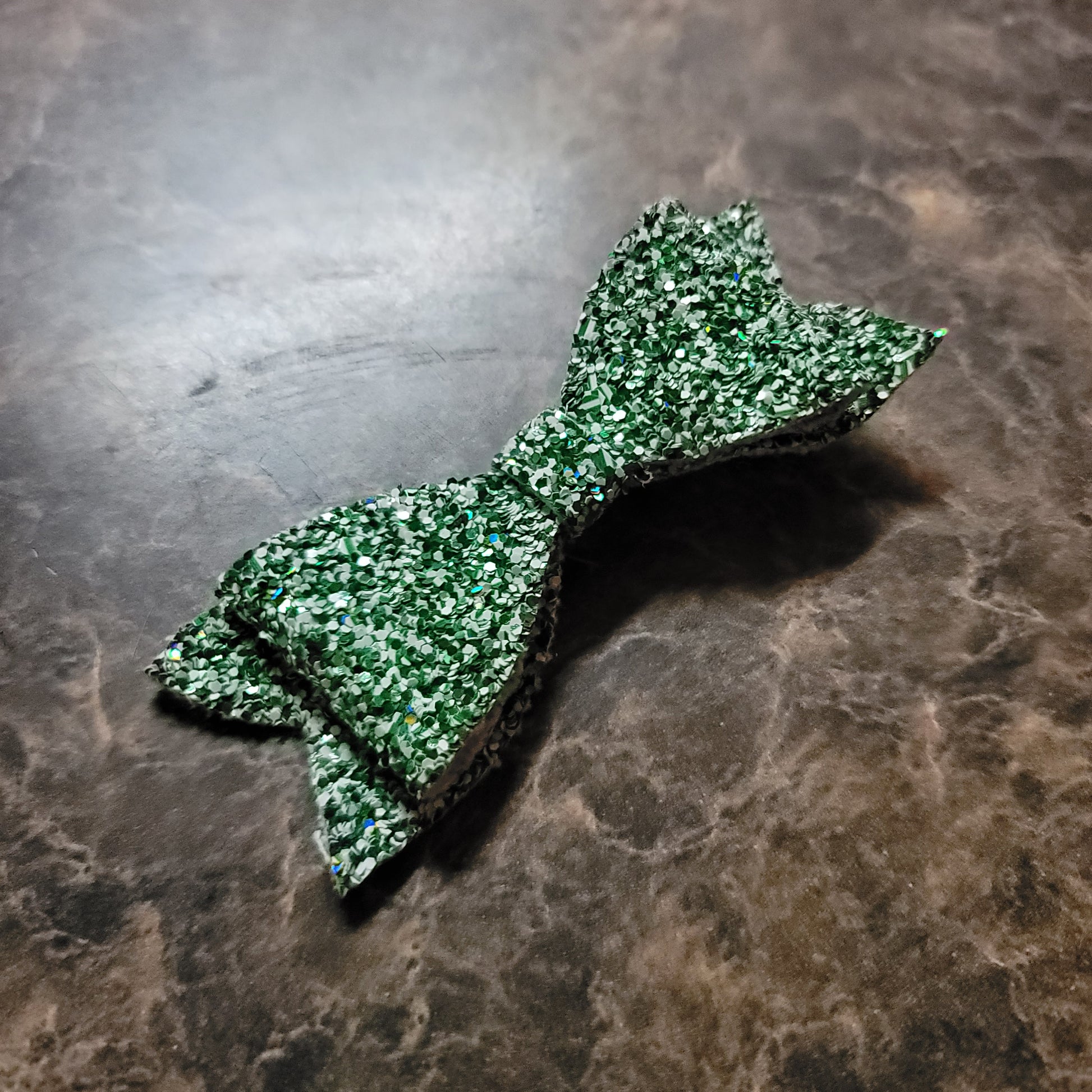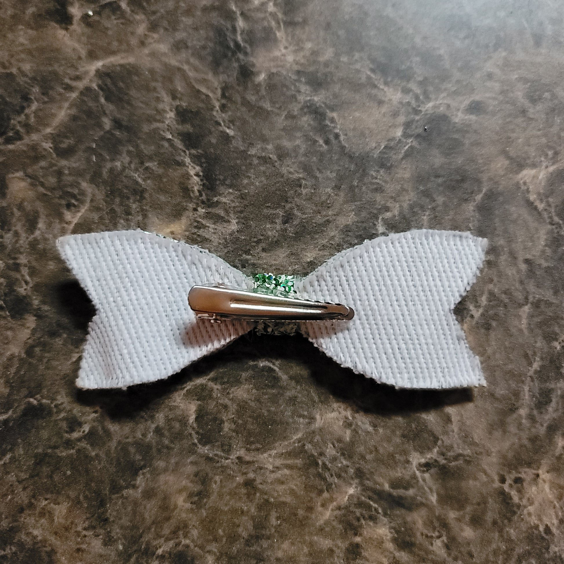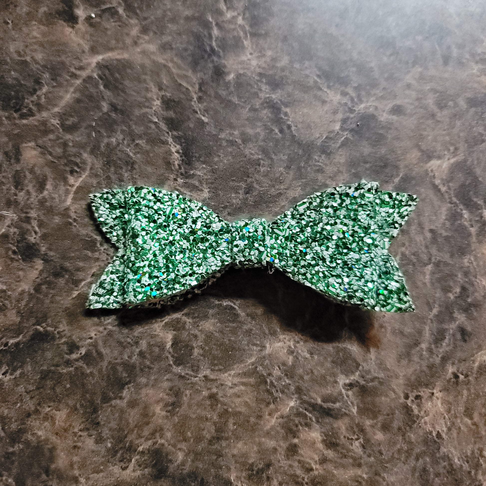 Green and white glitter material with soft backing. Small bow secured on an alligator clip.